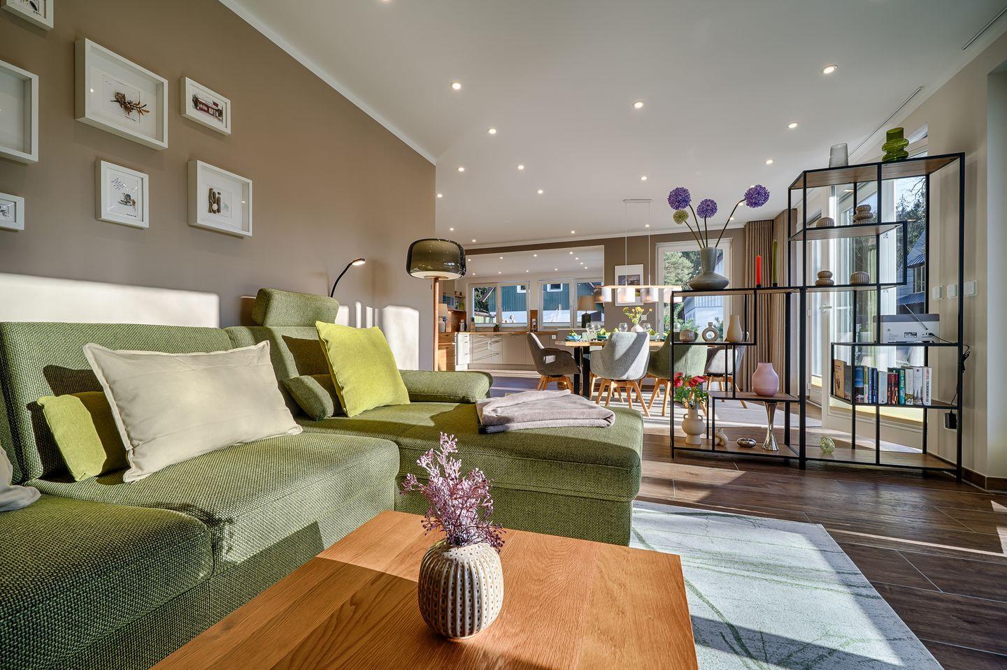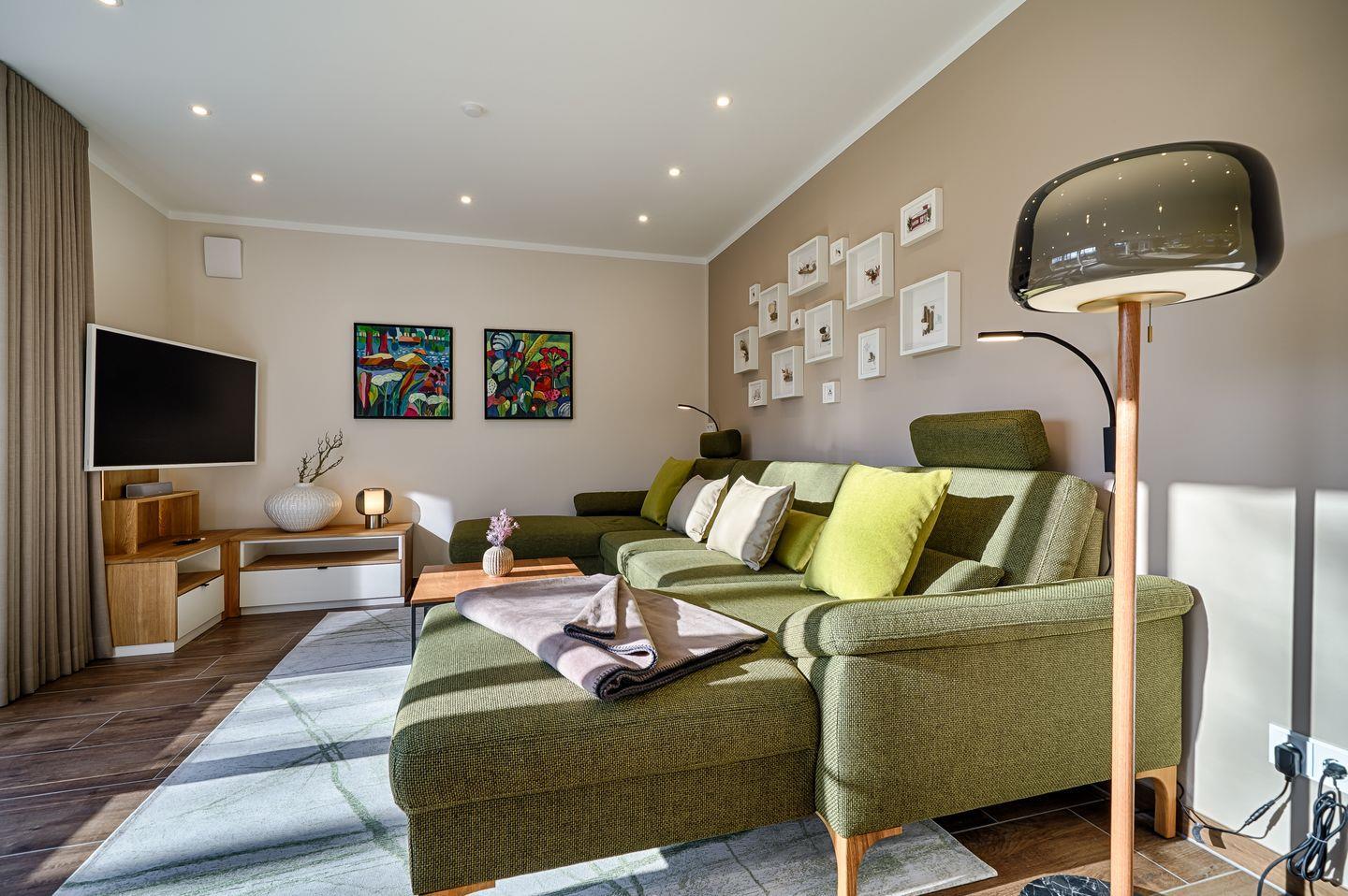 Wohnbereich mit Couchgarnitur, TV, kleiner Bibliothek, Spiele