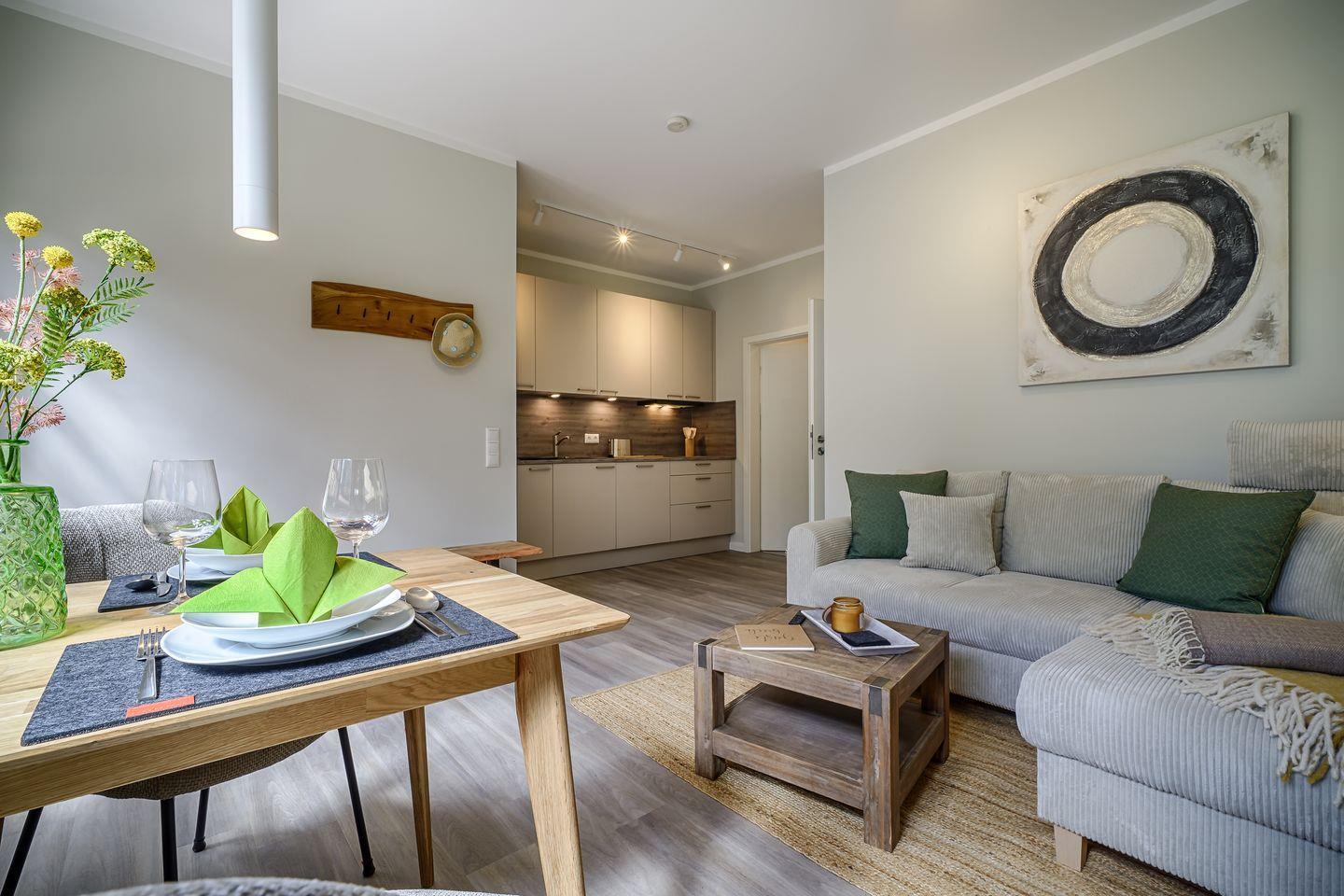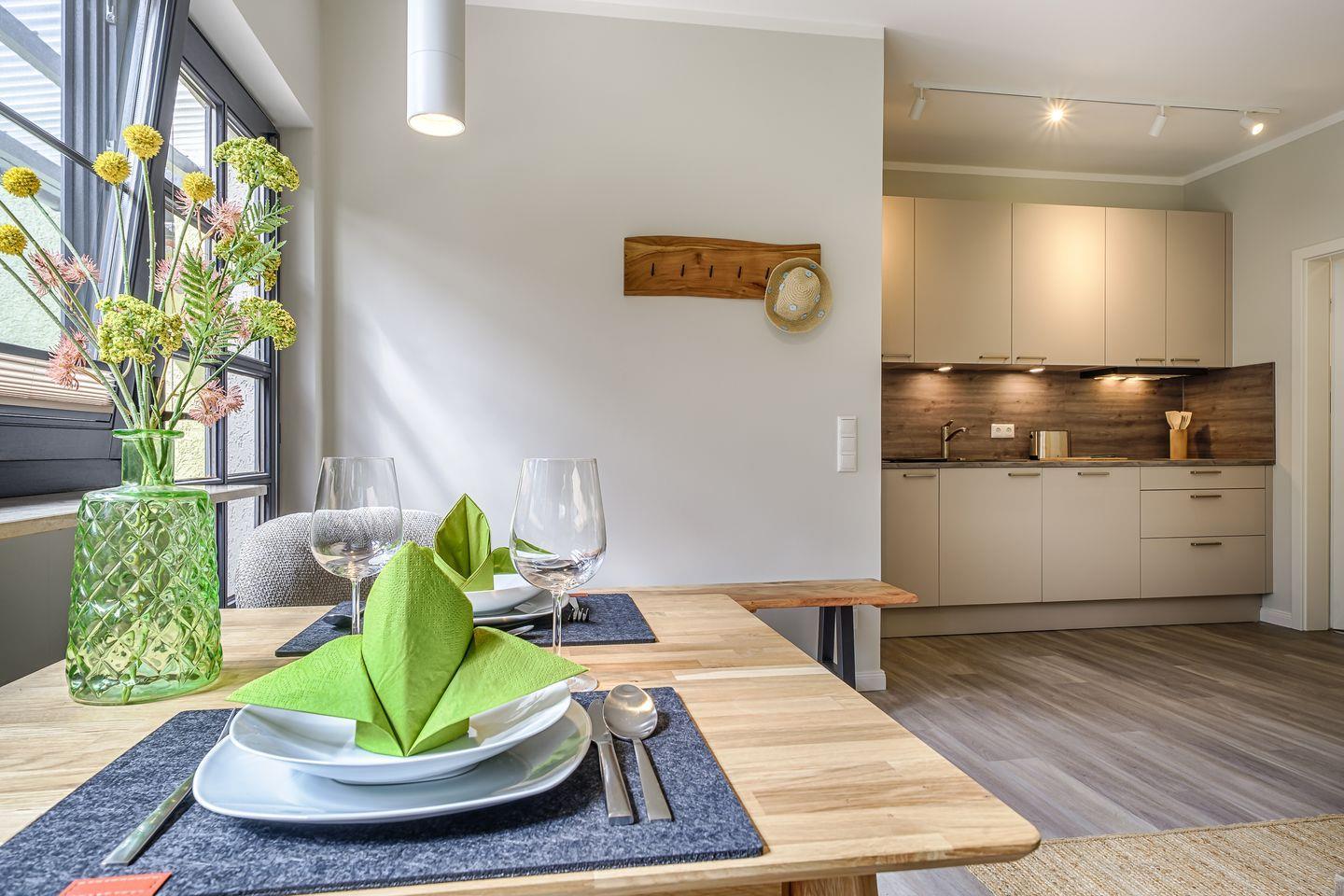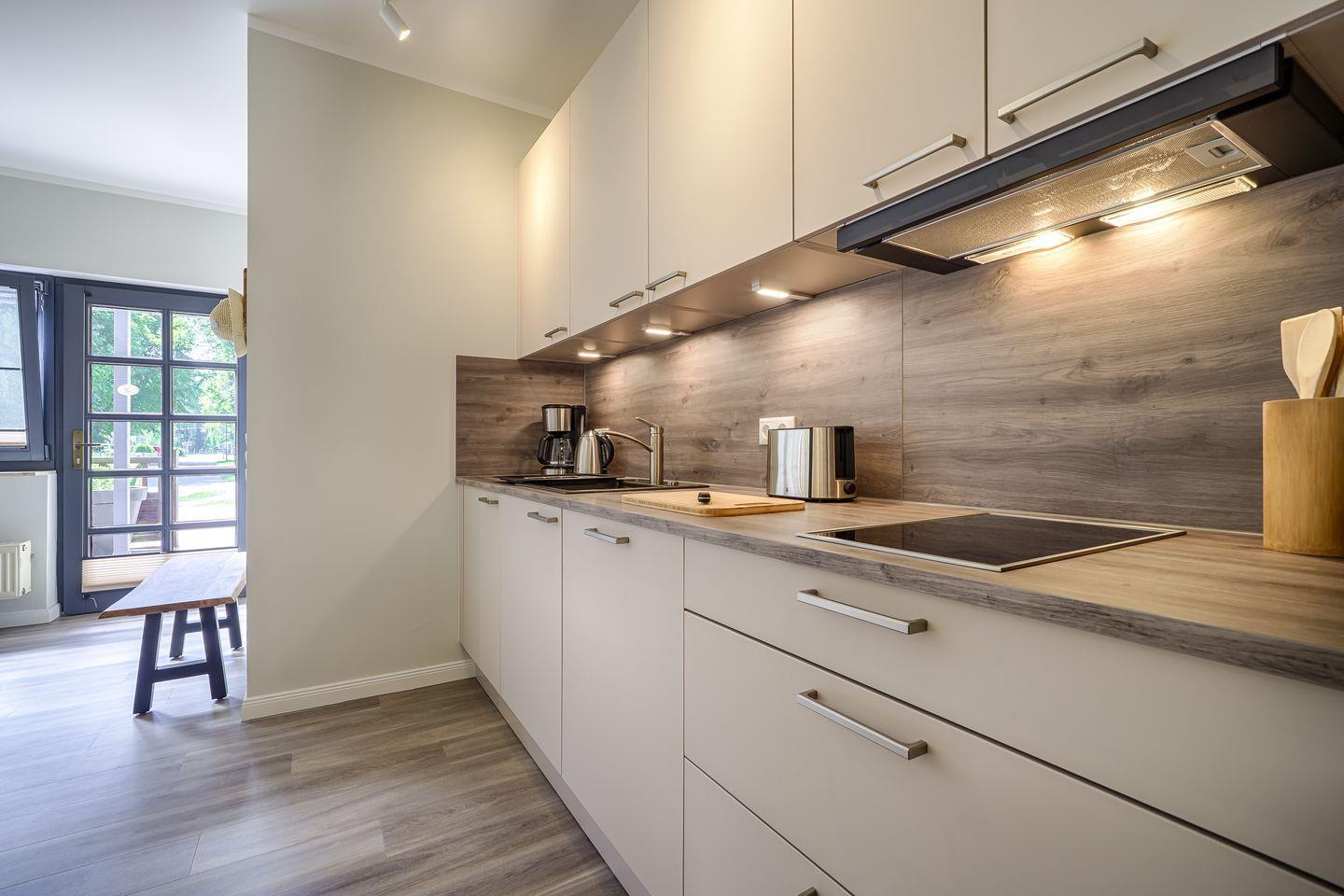 offene Einbauküche mit 2 Platten Induktionsherd und Esstisch für 2 Personen