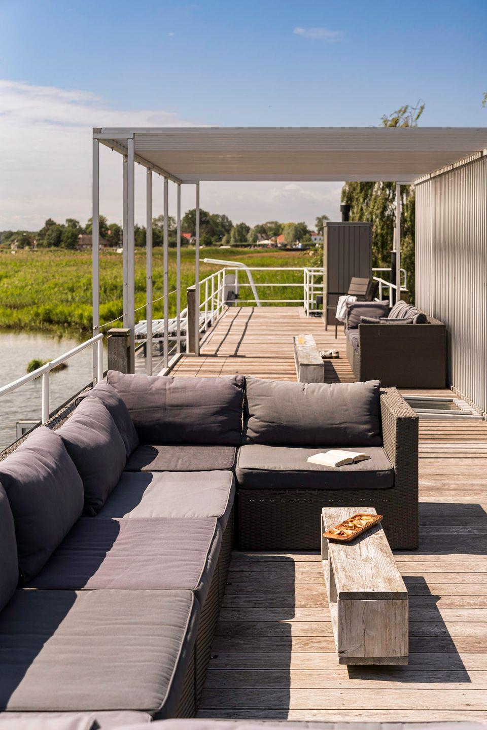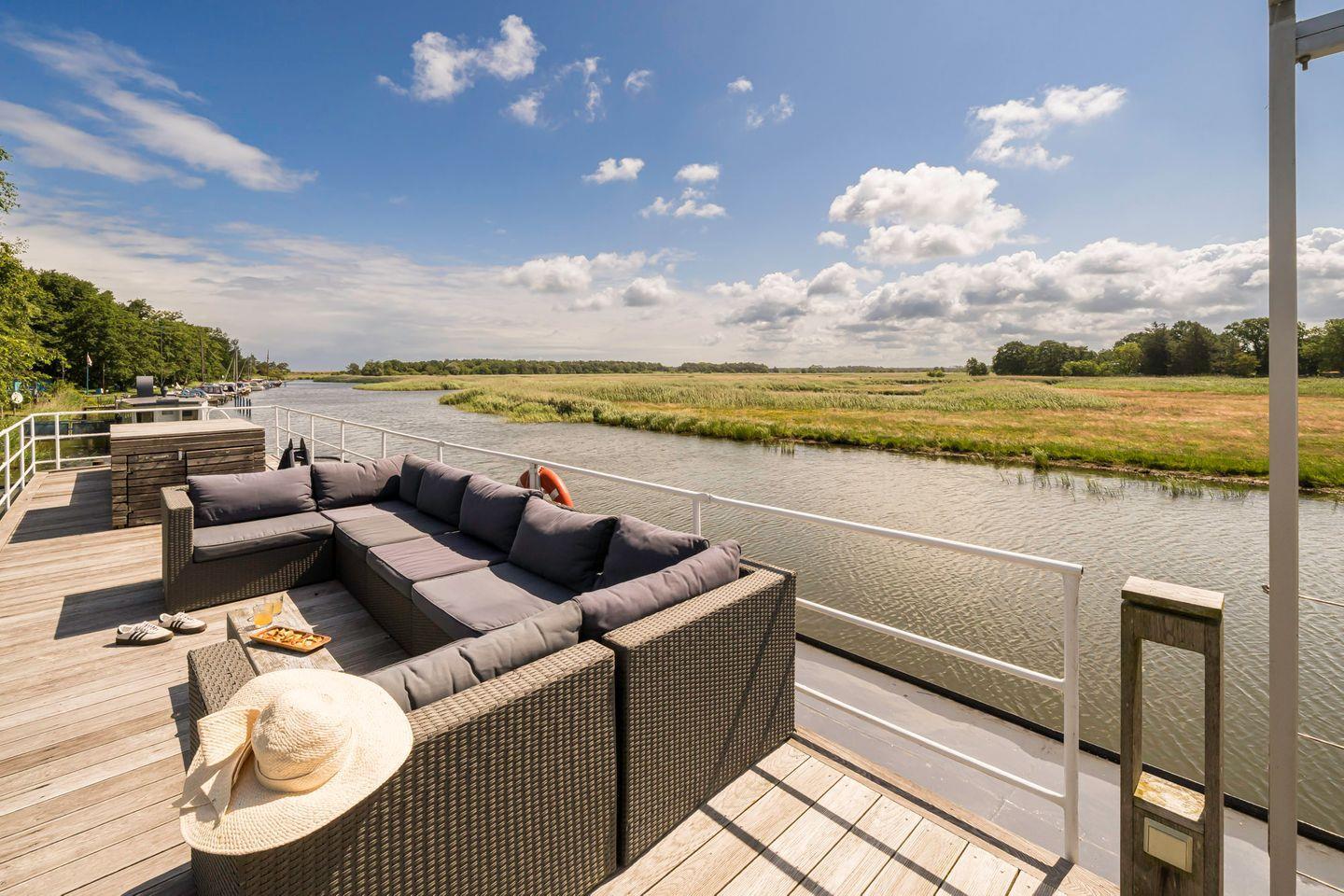 Ein besonderes Highlight ist das große Sonnendeck auf dem Dach des Schiffes, von dem aus Sie einen unverbauten Blick auf die Landschaft des Nationalparks genießen können. Hier lassen sich traumhafte Sonnenuntergänge erleben – ein unvergesslicher Moment unter freiem Himmel. Auch das 2.500 Quadratmeter große Wassergrundstück steht Ihnen zur Alleinnutzung zur Verfügung. Es bietet eine weitläufige Spiel- und Sonnenwiese sowie verschiedene gemütliche Sitzecken, die zum Verweilen einladen.