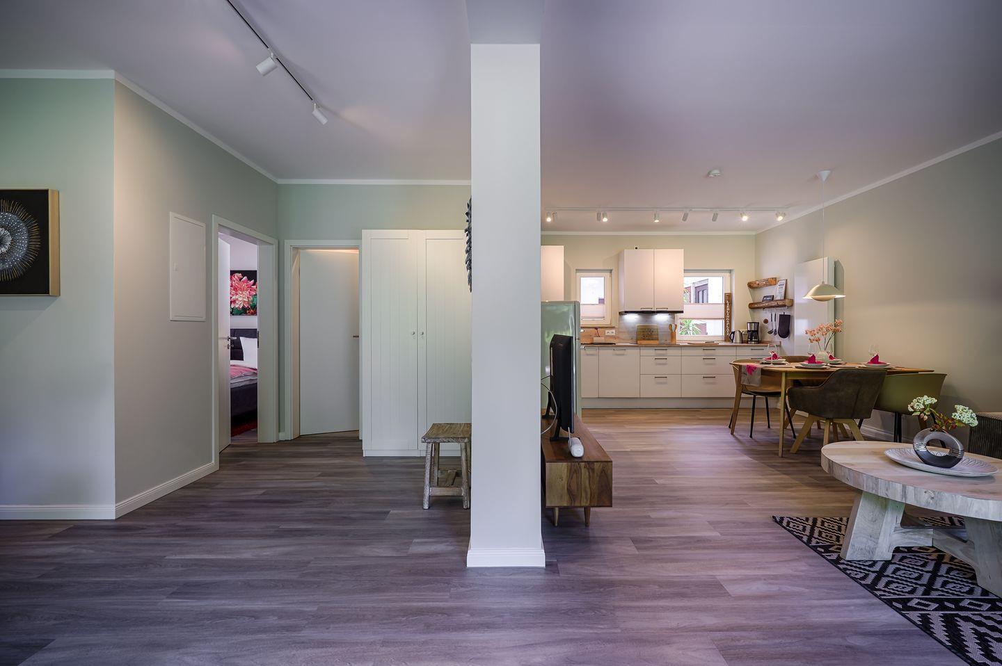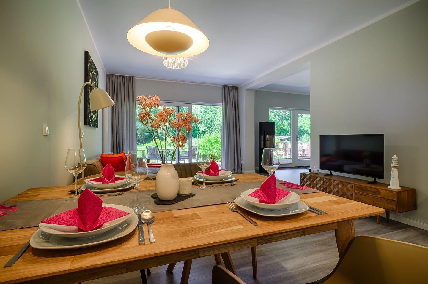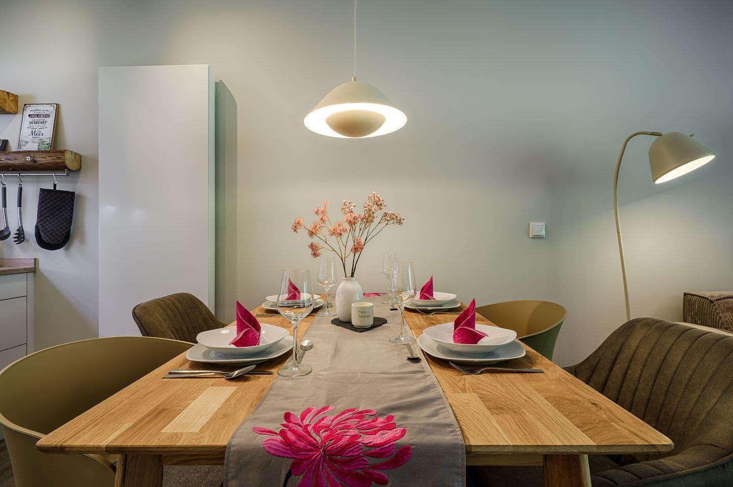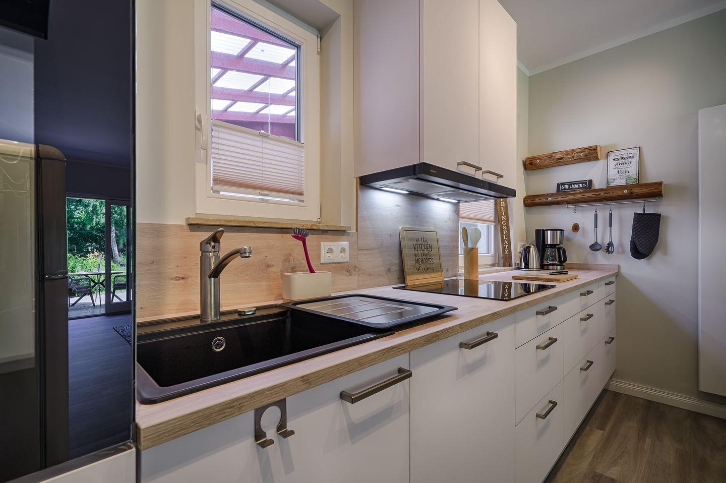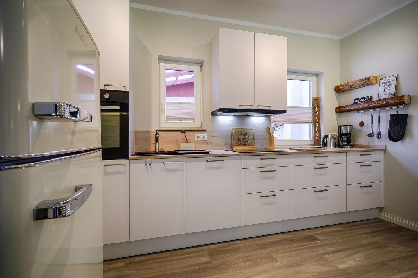 komplett eingerichtete Einbauküche mit Induktionsherd und Esstisch für 4 Personen