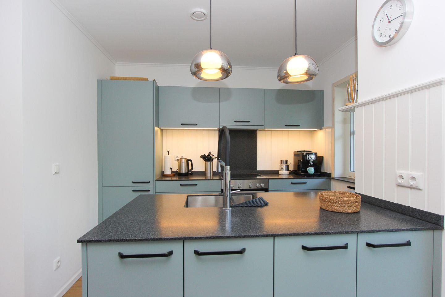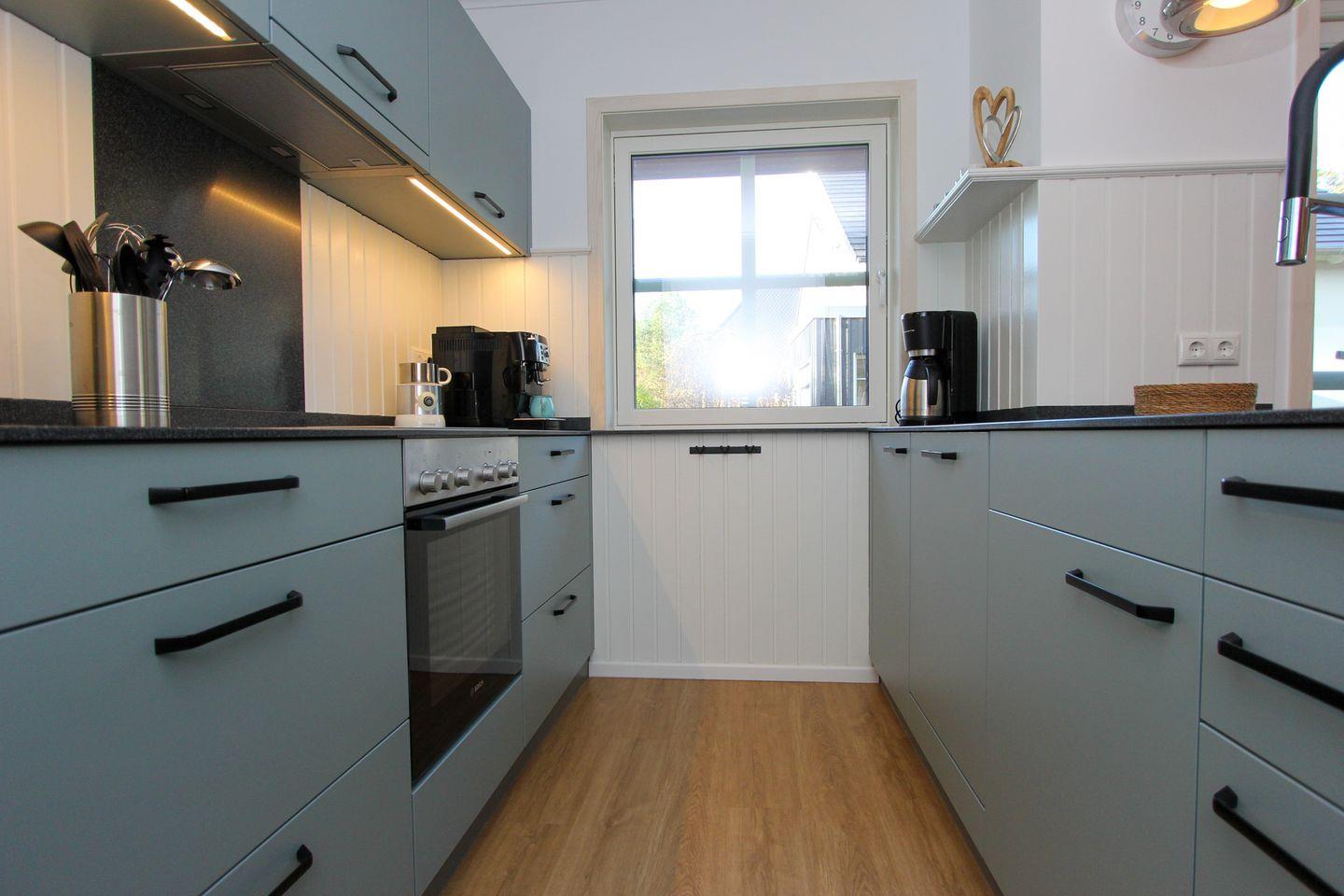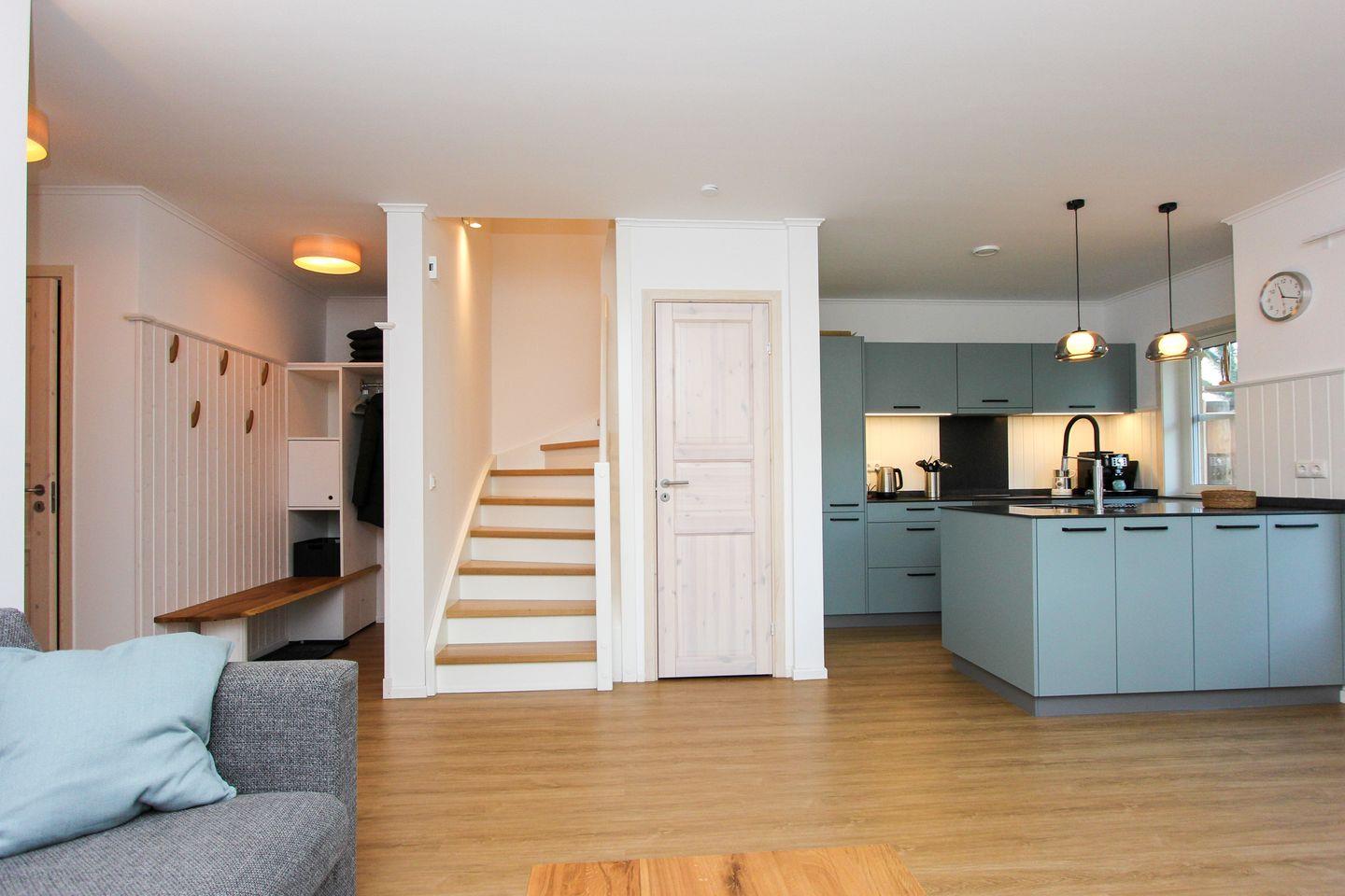 Die hochwertige Einrichtung sorgt für Entspannung vom ersten Moment an. Dank Fußbodenheizung fühlen Sie sich zu jeder Jahreszeit rundum wohl. Der offene Wohn- und Küchenbereich bildet das Herz des Hauses: Hier können Sie gemeinsam kochen, genießen und unvergessliche Abende verbringen. Die voll ausgestattete Küche lässt keine Wünsche offen – vom Ceranfeld über Backofen und Spülmaschine bis hin zum Kaffeevollautomaten, Wasserkocher, Toaster sowie komplettem Koch- und Essgeschirr.
