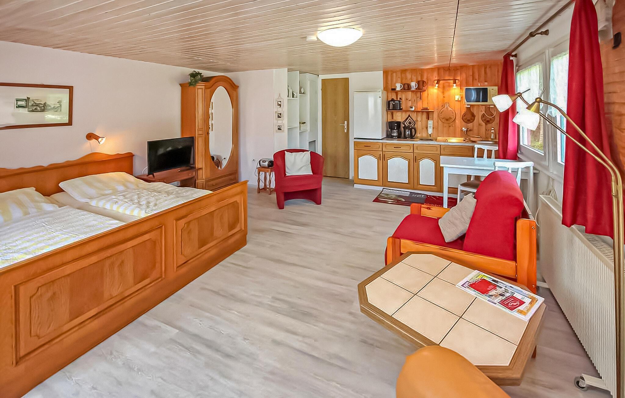 Das naturnahe Ferienhaus liegt separat auf dem rund 1.200 Quadratmeter großen Wohngrundstück des Eigentümers in einer ruhigen Wohngegend am Ortsrand. Ausgestattet mit Kombi. Wohn-/Schlafraum (Doppelbett, Gästebett, Essecke, Sat-TV, Radio), Kochnische (E-Herd, Mikrowelle, Kühlschrank, Kaffeemaschine), Dusche/WC mit Fußbodenheizung. Ebenfalls vorhanden sind WLAN, Terrasse, Grill, 2 Fahrräder zur kostenlosen Nutzung und Parkplatz. Im Gesamtpreis sind Bettwäsche, Handtücher, Wasser und Endreinigung enthalten. Vor Ort zu zahlen: Stromkosten nach Verbrauch und Kurtaxe. Haustiere: Auf diesem Grundstück ist ein Hund erlaubt (der Eigentümer hat selbst eine Dackelhündin. Das Grundstück ist umzäunt).