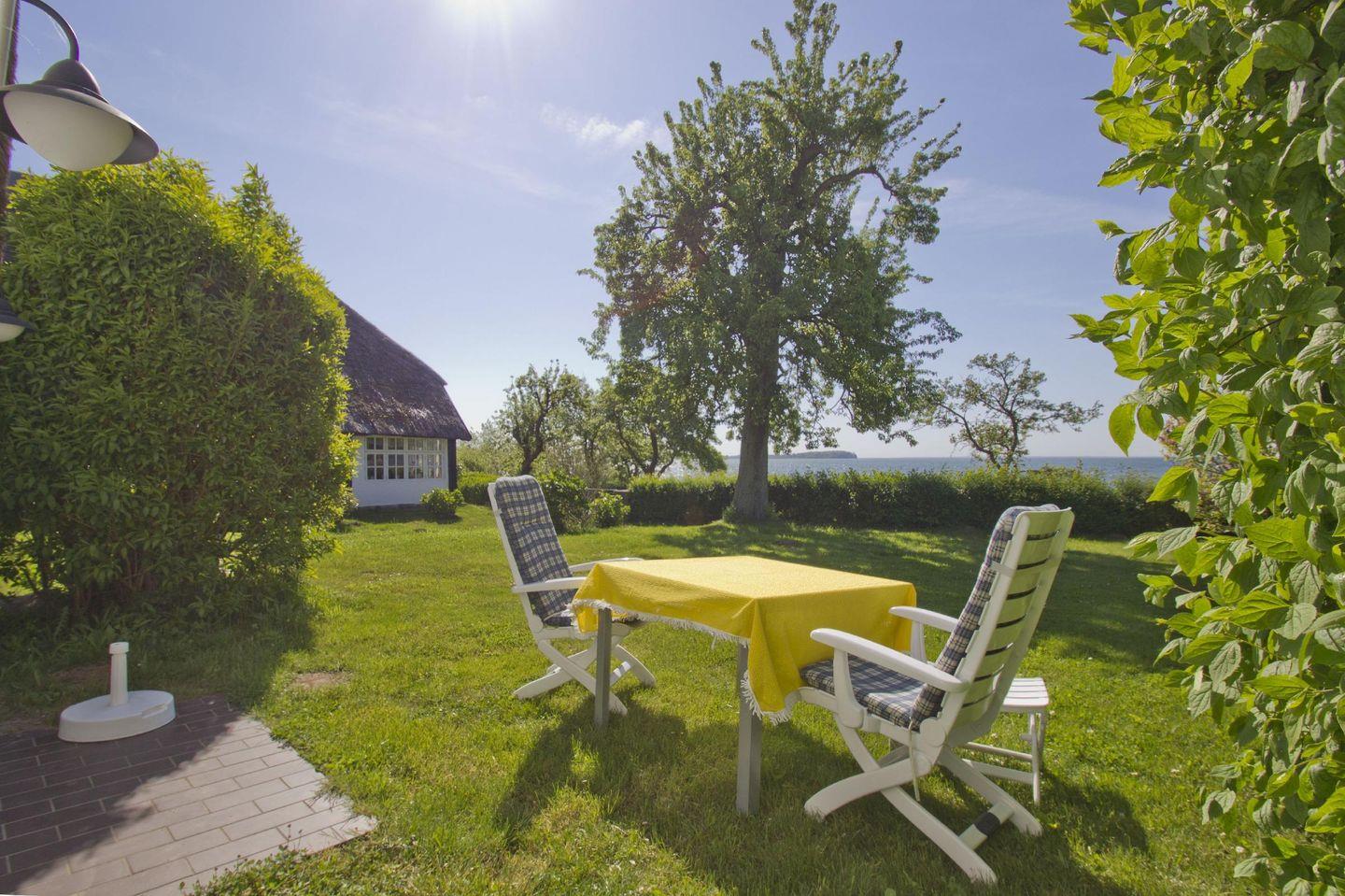 Das große Gartengrundstück grenzt auf der einen Seite an die malerischen Wiesen und Wälder der Rügener Naturlandschaft, auf der anderen Seite an die Küste des Boddens. Auf dem privaten Badezugang mit Liegewiese steht ein Strandkorb (saisonal von Mai bis Oktober) zur Verfügung.