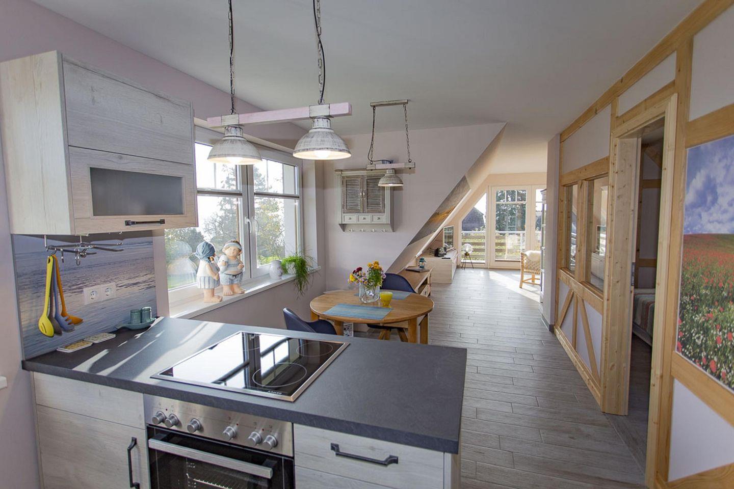 KÜCHE // offene Küche mit 4-Felder Ceranherd, Kühlschrank mit Gefrierfach, Backofen, Toaster, Wasserkocher, Kaffeemaschine, reichlich Besteck, Geschirr und Küchenutensilien ++