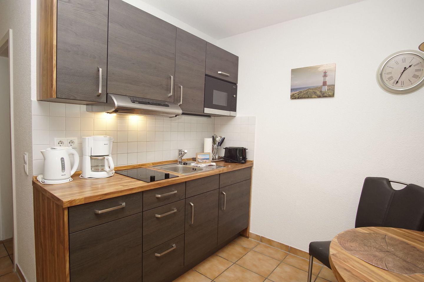 KÜCHE // Küchenzeile, 2-Platten Ceranherd, Spülmaschine, Kühlschrank mit Gefrierfach, Mikrowelle, Toaster, Wasserkocher, Kaffeemaschine, reichlich Besteck, Geschirr und Küchenutensilien ++