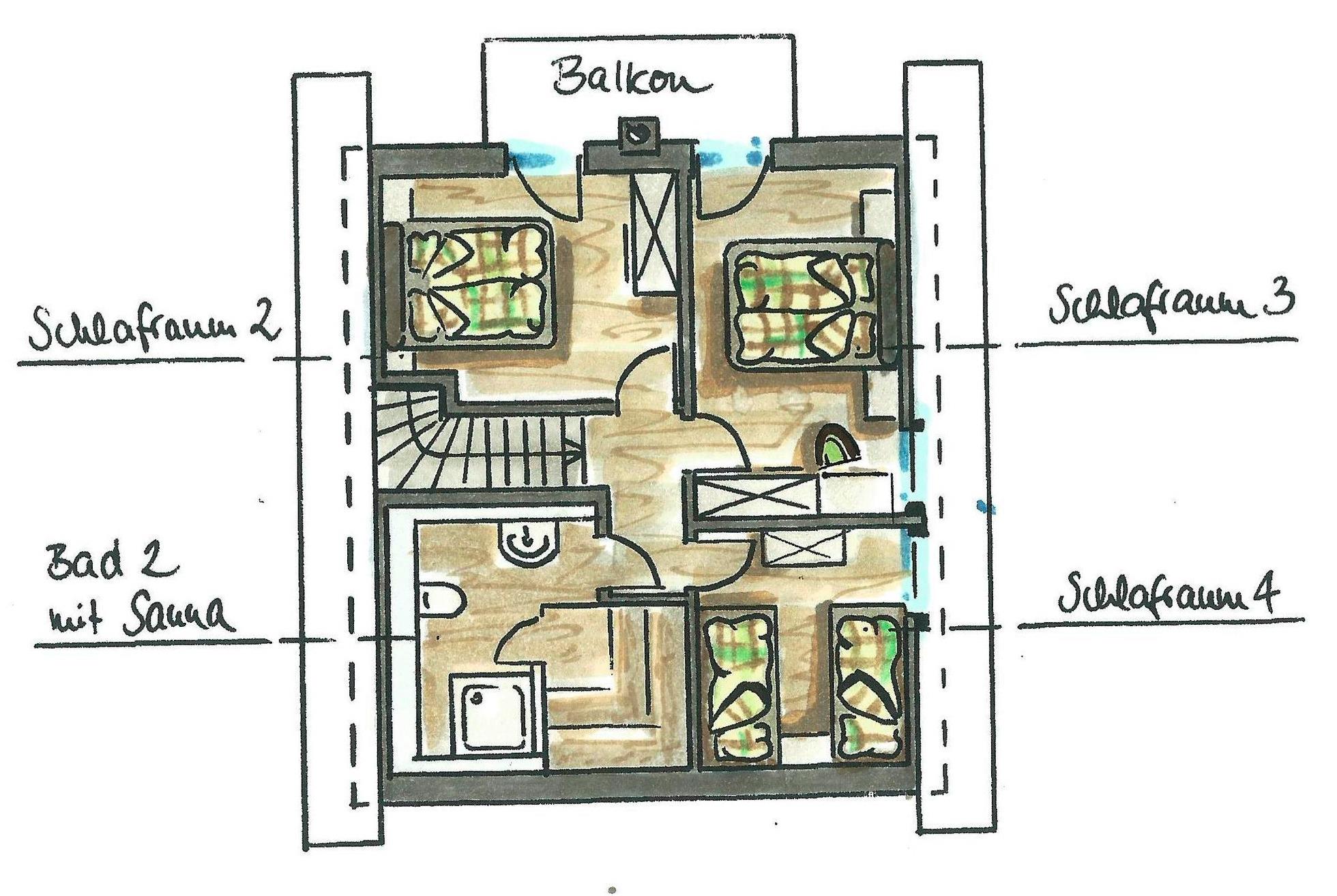 Das Ferienhaus besitzt zwei Ebenen mit ca. 120 m² Wohnfläche und verfügt über 3 getrennte Schlafzimmer mit Boxspring-Doppelbetten. Es gibt 2 Bäder jeweils mit Dusche, WC, Waschbecken. In einem Bad gibt es eine finnische Sauna zum Entspannen.