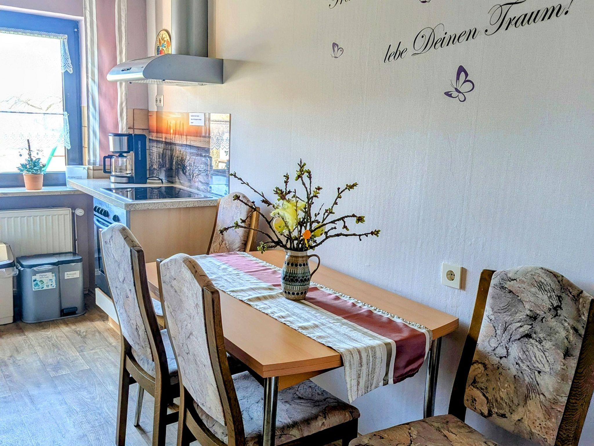 Möchten Sie fernab von Industrie und Großstadtlärm einen erholsamen Urlaub verbringen, dann sind Sie bei uns an der richtigen Adresse. Unsere 3 Zimmer Ferienwohnung Thüringer-Waldblick für 2 - 5 Personen, 84 qm ist sehr ruhig am Ortsrand gelegen mit einen herrlichen Blick zum Thüringer-Wald. Sie ist komfortabel und kinderfreundlich eingerichtet. Kinderbett und Hochstuhl kann auf Wusch gestellt werden! Kinder dürfen auch mal auf unseren Oldtimer Eicher mitfahren! Unsere 2 Schlafzimmer mit höheren Betten sind mit Bandscheibenmatratzen und verstellbaren Lattenrosten. Küche mit Geschirrspülmaschine, Mikrowelle, Kühlschrank, E-Herd und allen techn. Geräten. Gemütlichen Wohnzimmer mit TV Flachbildschirm und W-Lan. Bad mit Dusche, WC und Fußbodenheizung. Südliche Terrasse in unverbauter Lage mit Gartenmöbeln, Liegestühle, Grill und Feuerschale. Hier können Sie am Morgen den Sonnenaufgang und in der Nacht den Sternenhimmel bewundern! Wir freuen uns auf Ihren Besuch!