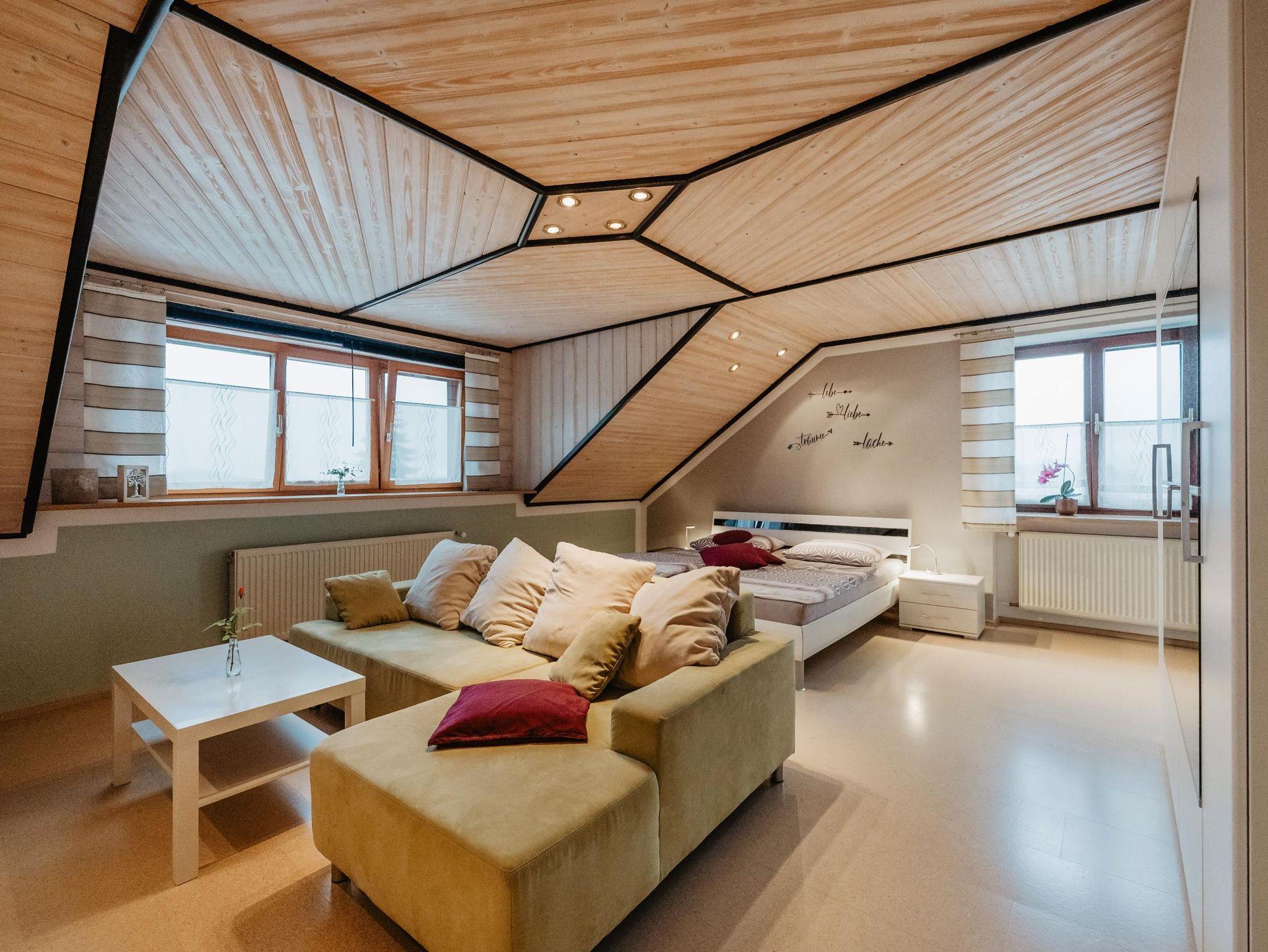 30 m² Schlaf- Wohnraum mit Doppelbett, Eckcouch, Fernseher
