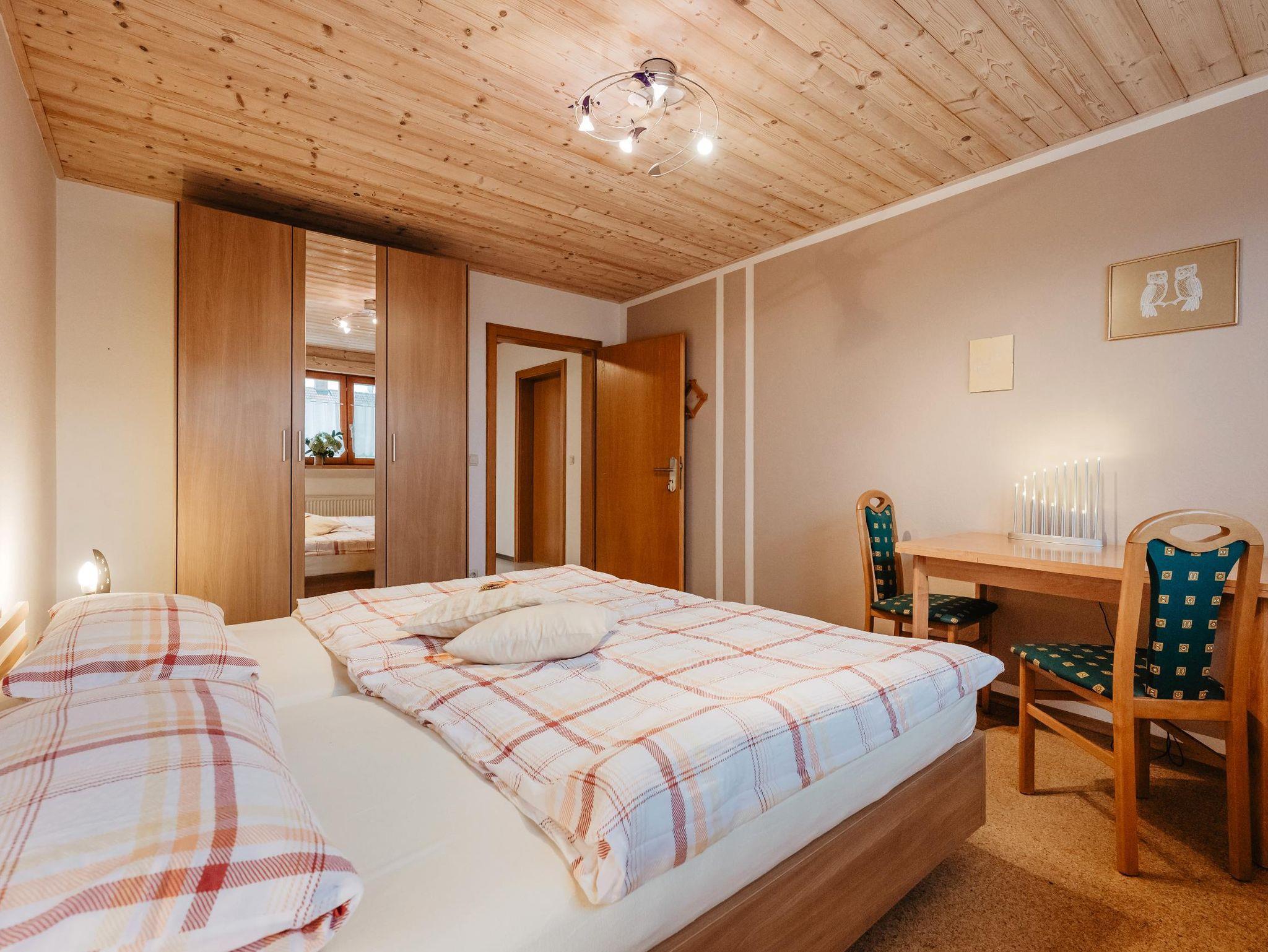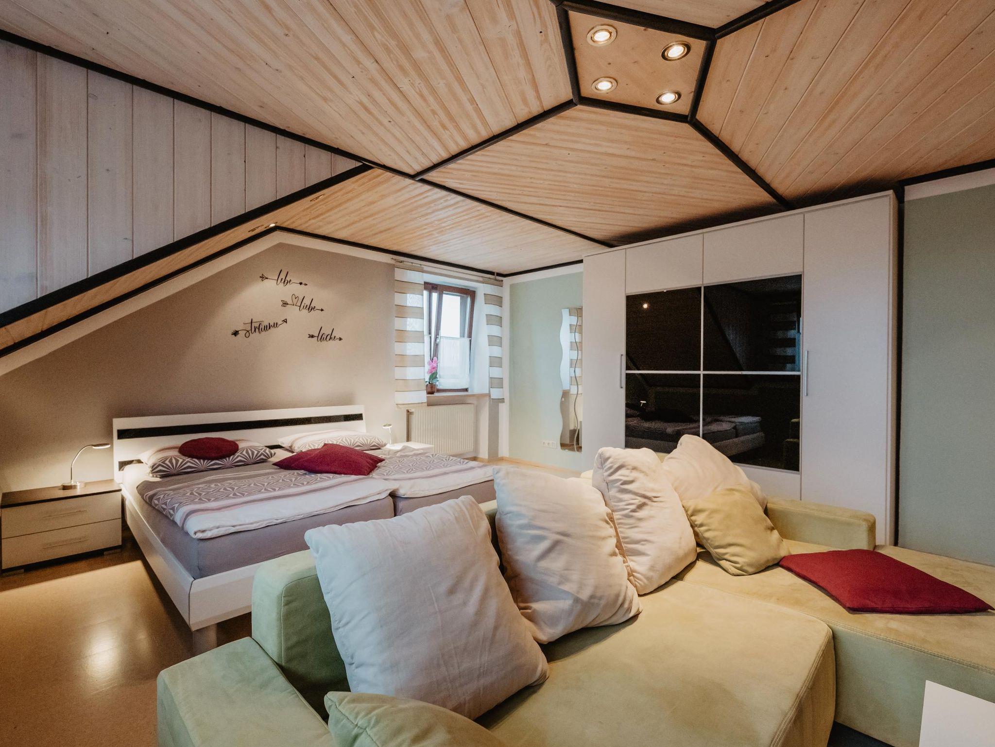 Schlafraum mit Doppelbett, Schlafcouch, Sideboard, TV