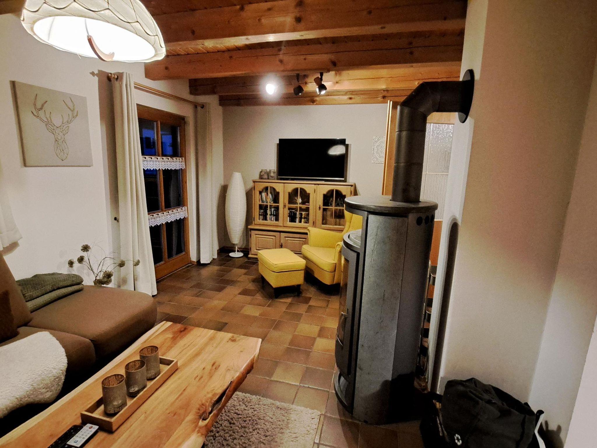 Im Wohnzimmer steht ein Kaminofen zum selber einheizen, wenn man das gemütliche Ambiente mag. Brennholz inklusive.