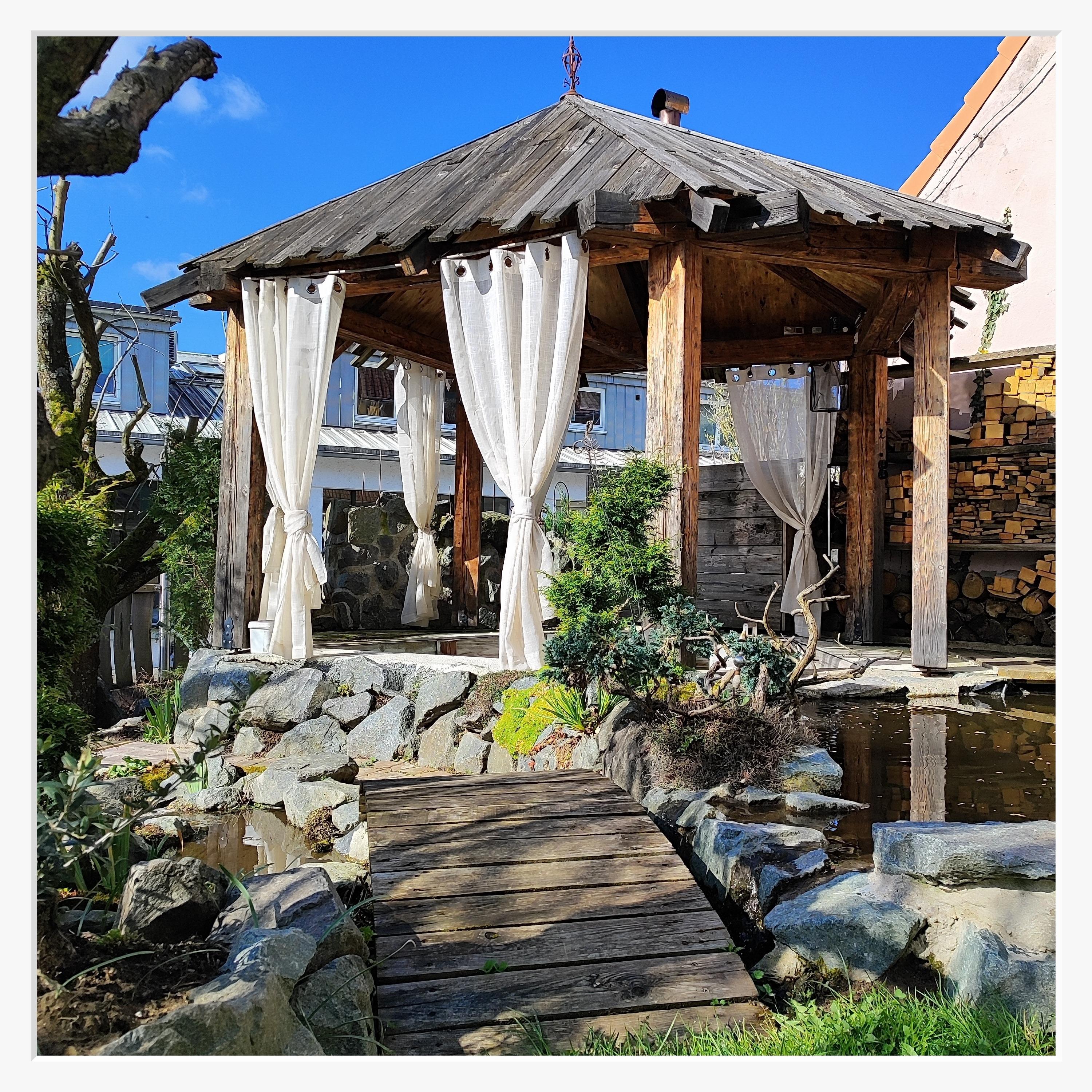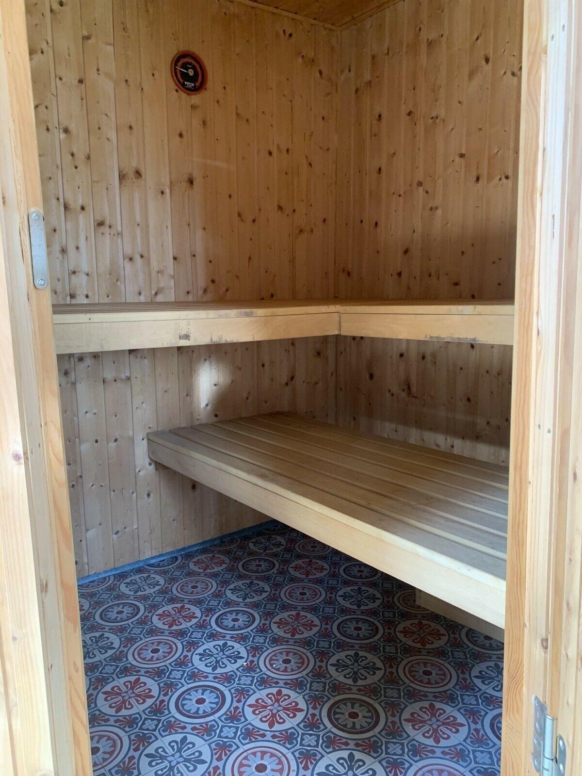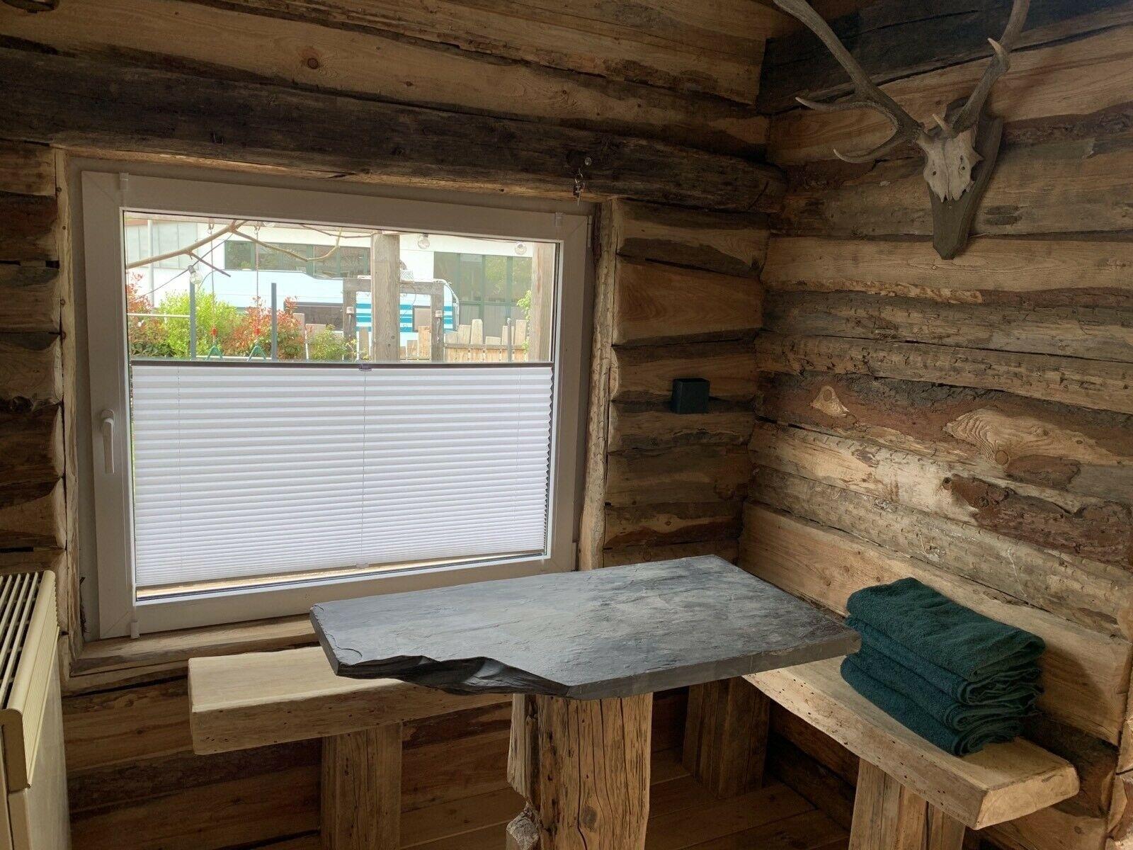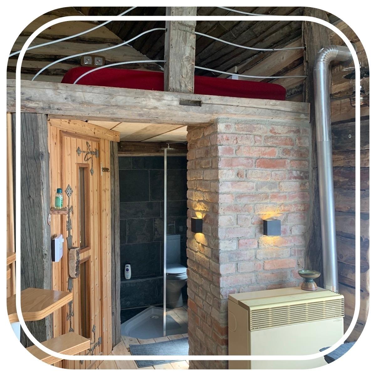 Zusätzlich bieten wir ein charmantes Chalet für einen gemütlichen Abend mit Sauna an! Wenn ihr Entspannung sucht, seid ihr hier genau richtig. Das Chalet verfügt über einen Kühlschrank mit einer kleinen Auswahl an Getränken, und der obere Bereich ist eine einladende Ruheempore. Innen ist das Häuschen im typischen Chalet-Stil gestaltet, mit einer Regendusche, die elegant mit Schieferplatten verkleidet ist. Der Boden aus Kieferbohlen und eine kleine Sitzecke mit einem hübschen Tisch laden zum Verweilen ein.