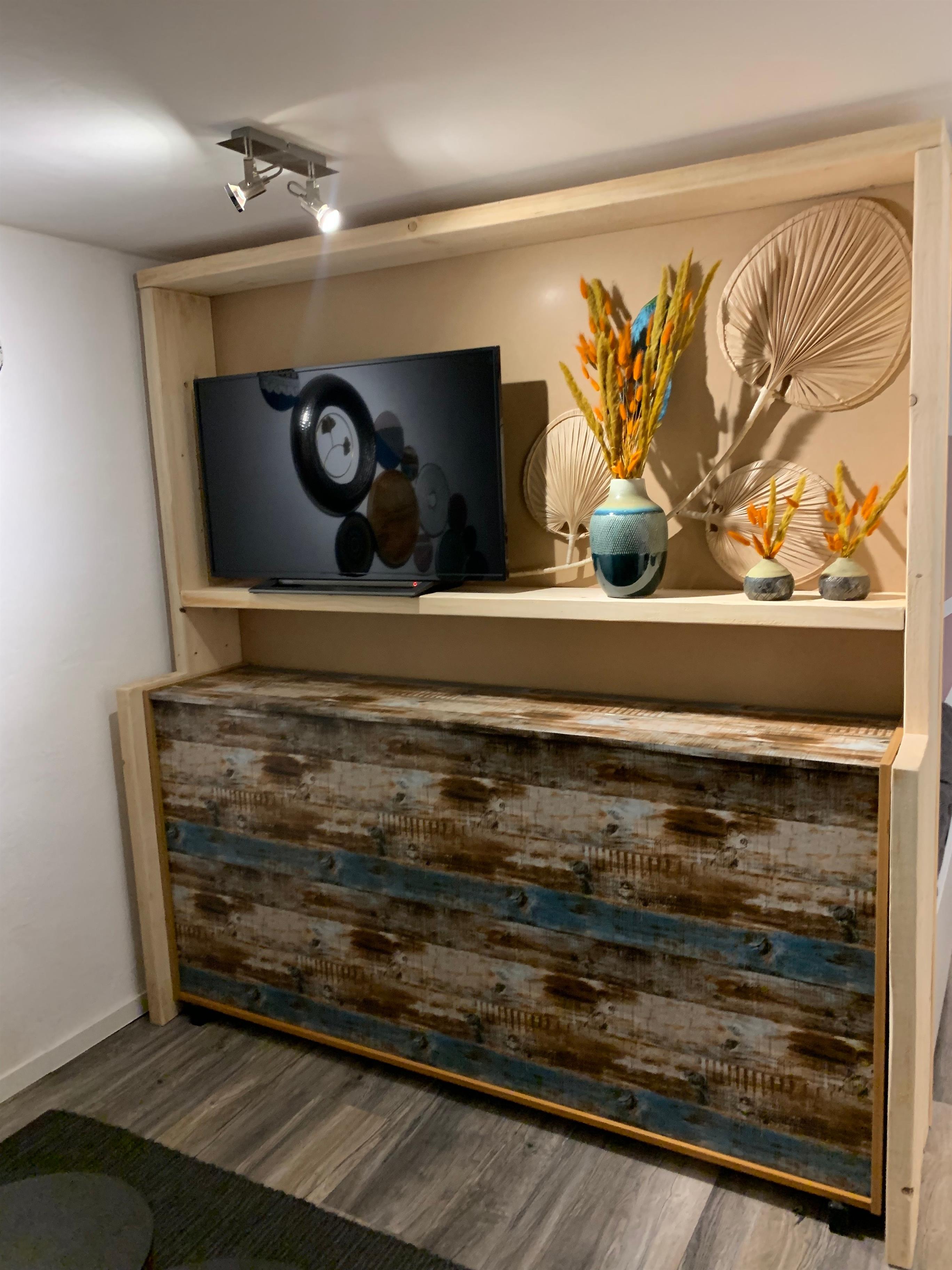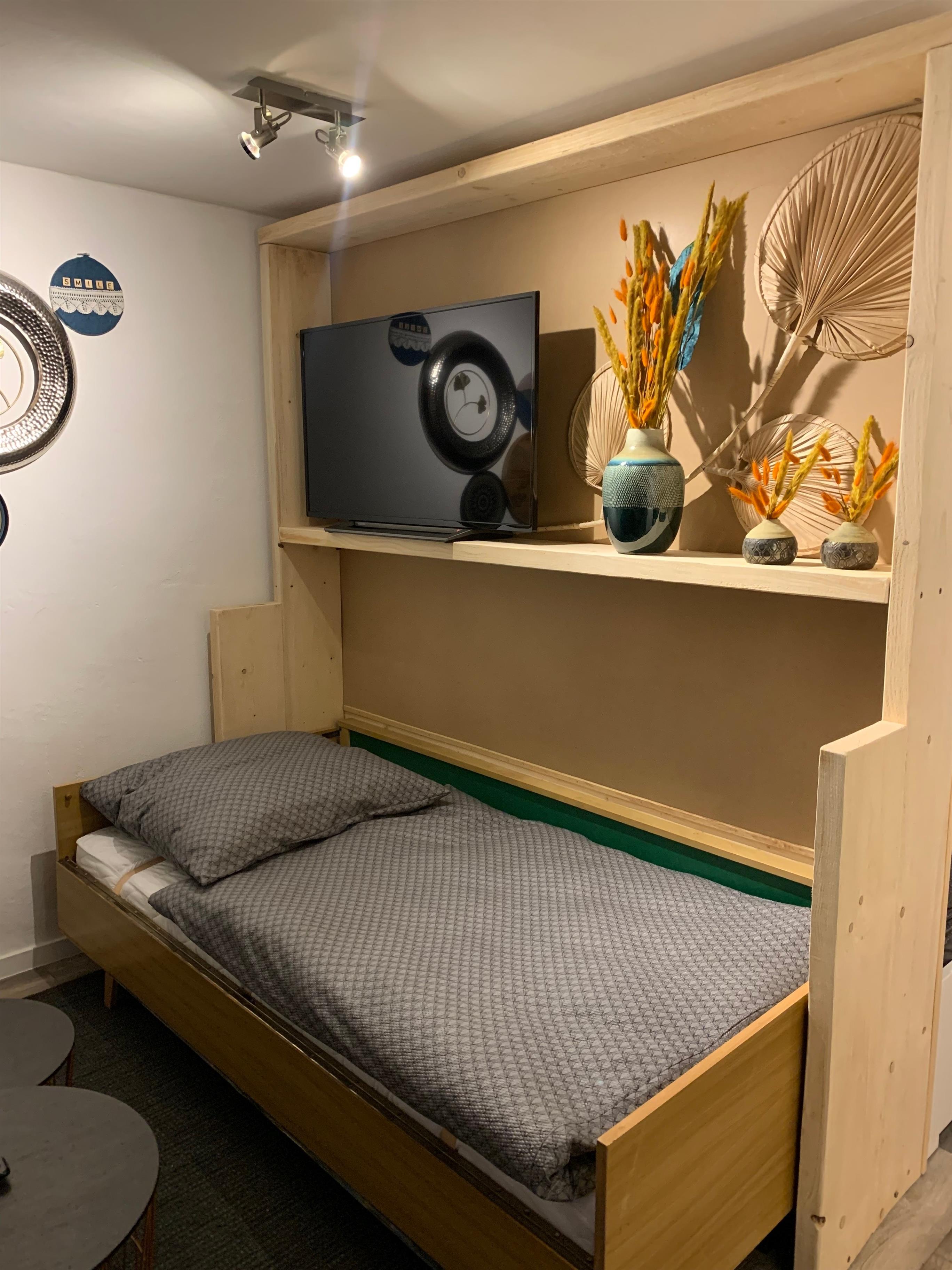 Willkommen in unserer liebevoll eingerichteten Ferienwohnung! Hier erwartet euch ein gemütlicher Wohnbereich, der mit einem 40-Zoll-Flachbild-TV und einer modernen Couch zum Entspannen einlädt. Der Schlafbereich bietet ein komfortables Bett, in dem ihr erholsame Nächte verbringen könnt. Für die kleinen Gäste stellen wir ein praktisches Reisebett zur Verfügung, und für eine dritte Person steht ein komfortables Schrankbett bereit.