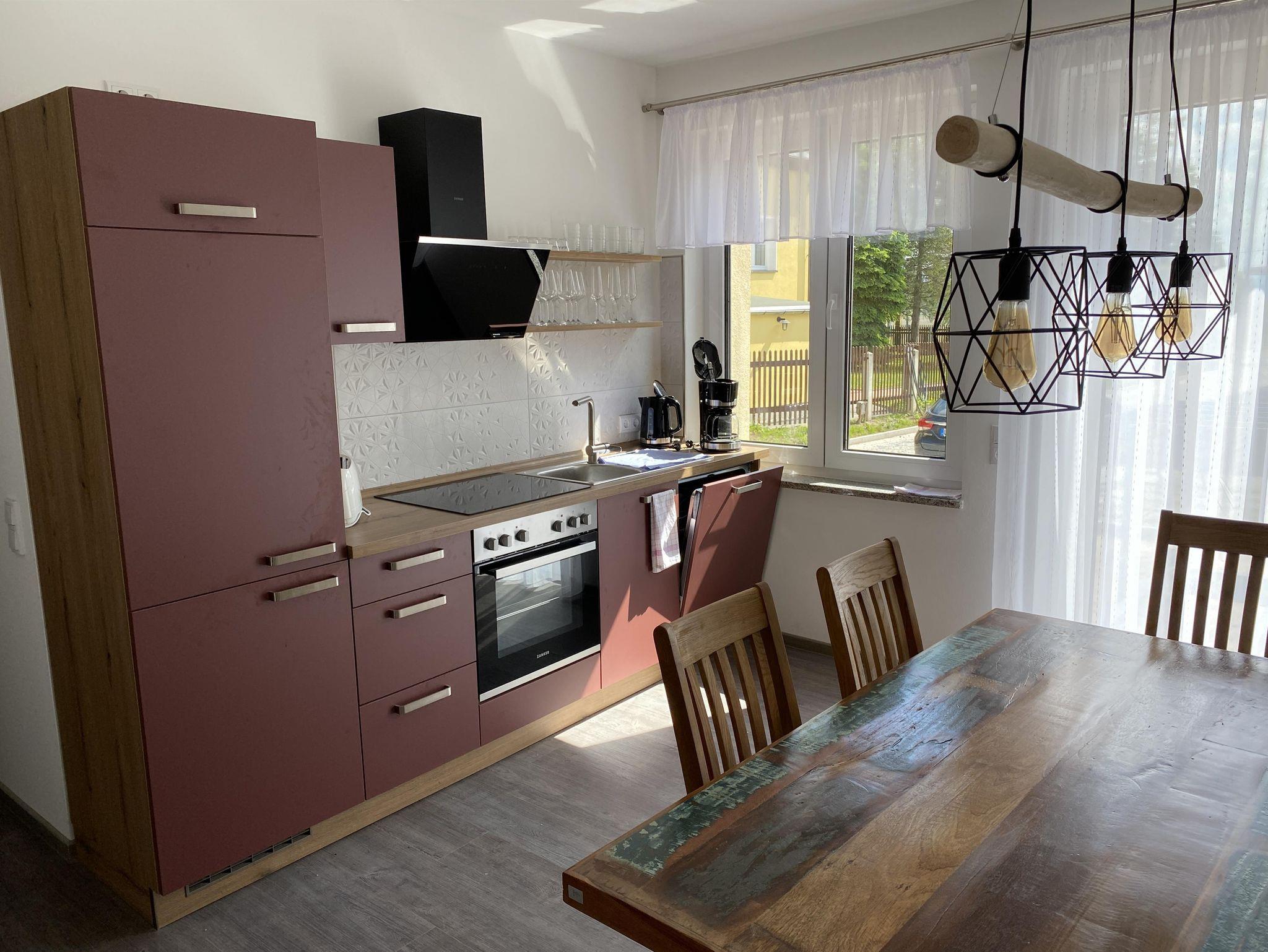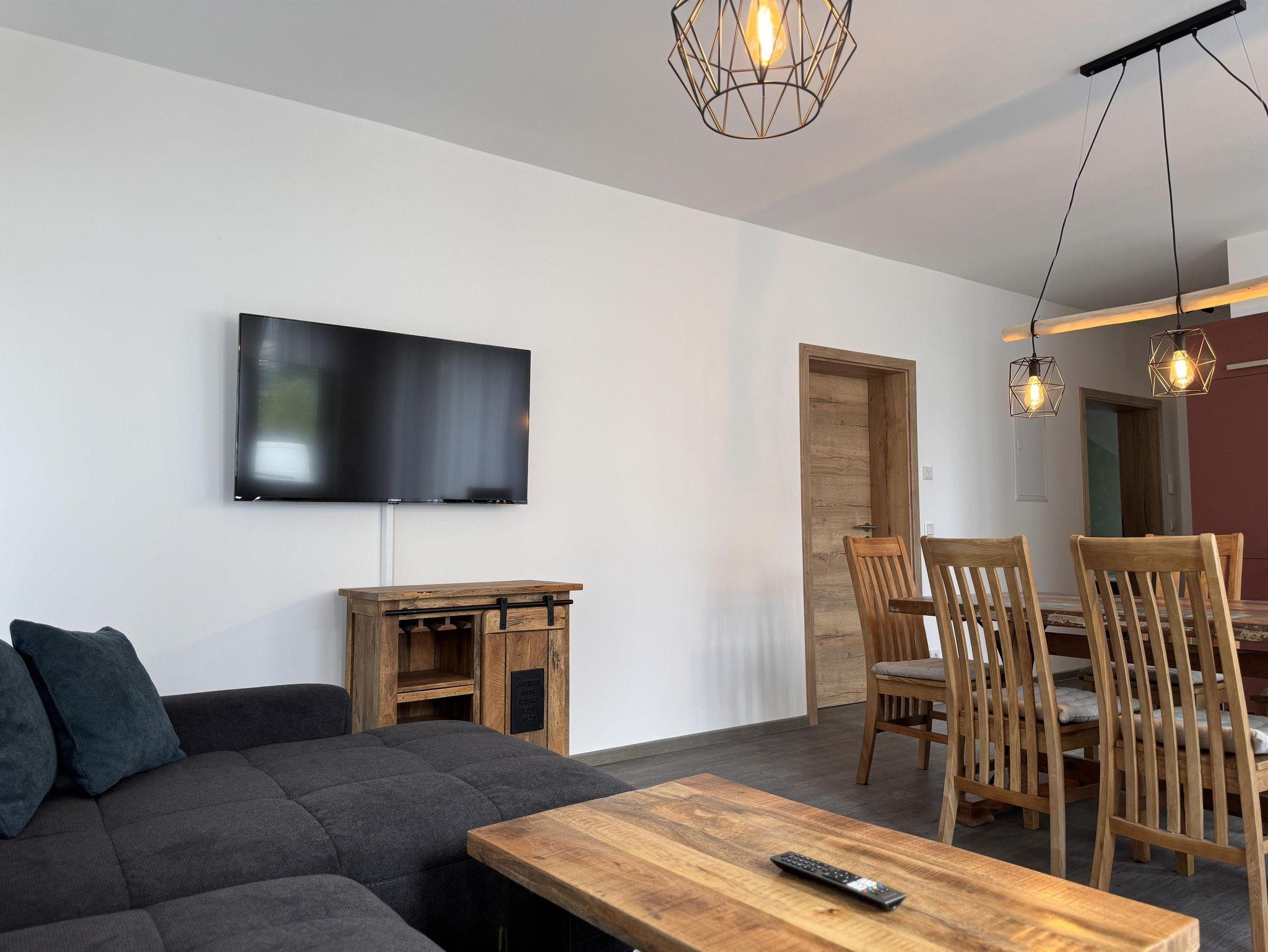 Der einladende Wohn-/Essbereich ist das Herzstück der Wohnung. Hier finden Sie eine gemütliche Couch mit TV-Bereich, perfekt für entspannte Abende nach einem erlebnisreichen Tag. Der Essbereich schließt sich direkt an und bietet genügend Platz für gesellige Mahlzeiten mit Ihren Liebsten. Bei Bedarf kann die großzügige Couch auch als Schlafcouch genutzt werden, um zusätzlichen Schlafplatz zu schaffen. Die hochwertige, moderne Küche lässt keine Wünsche offen.