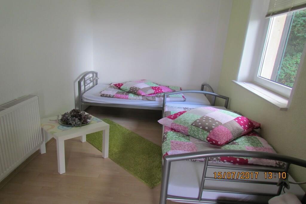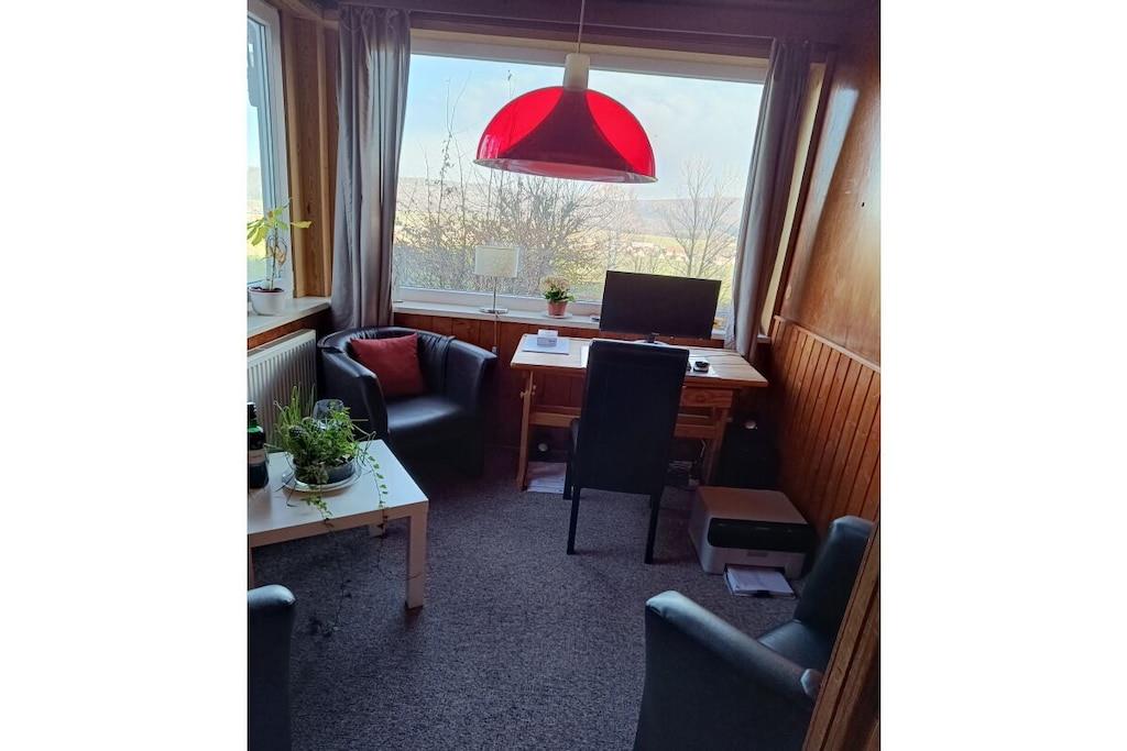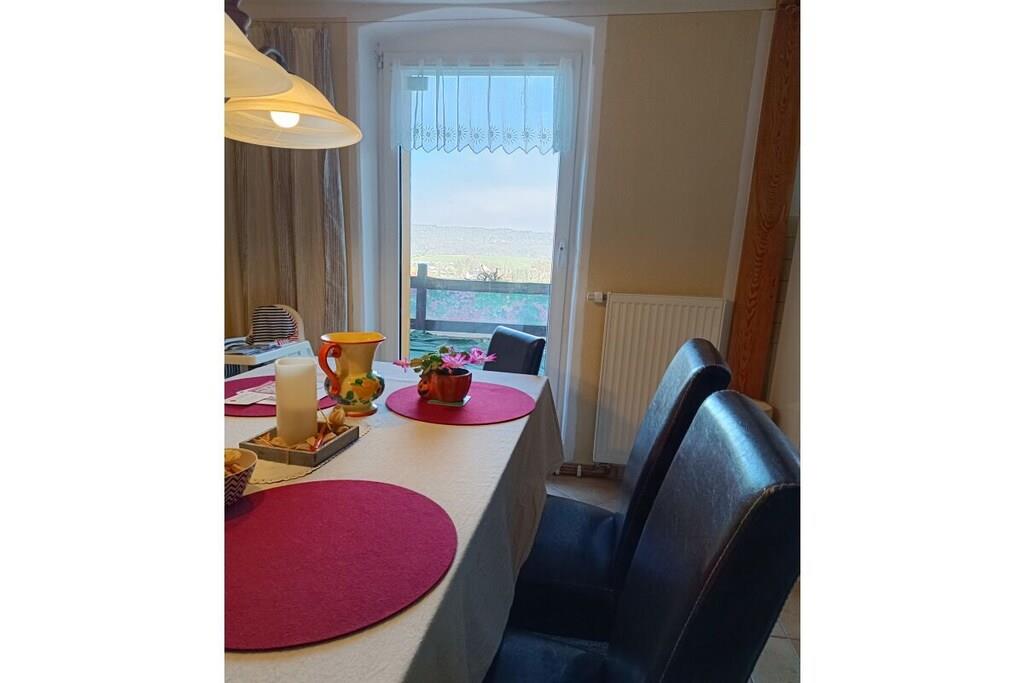 Aus den großen Panorama- Fenstern des Wohnzimmers hat man die erste tolle Aussicht auf Wandermöglichkeiten, die zu Fuß erreichbar sind. Diese gemütliche Ferienwohnung mit 85m² Wohnfläche, mit 2 Schlafzimmern und 1 grossem Wohnzimmer (Schlafmöglichkeiten für 5 Personen), Speisebereich für 6 Personen und einem Bad mit Dusche, das man im Herbst und Winter neben der normalen und zentralen Heiz-Öl-Heizung mit einem Kamin (Holz /Kohle ) im Wohnzimmer)beheizen kann, ist eine exellente Wohlfühloase. Während Ihres Urlaubs kann diese Ferienwohnung Ihr Zuhause sein. Sie wohnen in einer 75m² großen Ferienwohnung innerhalb eines 2- Familien - Hauses, in der neben einem großen Wohnzimmer mit TV und Kamin sowie mit 2 Schlafzimmern, einem Bad mit Dusche ein seperater Essbereich mit 6 Plätzen zum Essen neben dem Küchenbereich angeboten wird. Ein Extra-Lesezimmer oder Spielzimmer innerhalb dieser Ferienwohnung bietet dem Urlauber die Möglichkeit, sich innerhalb der Ferienwohnung zum lesen oder Sinieren oder zum trinken eines guten Tropfens zurückzuziehen.
