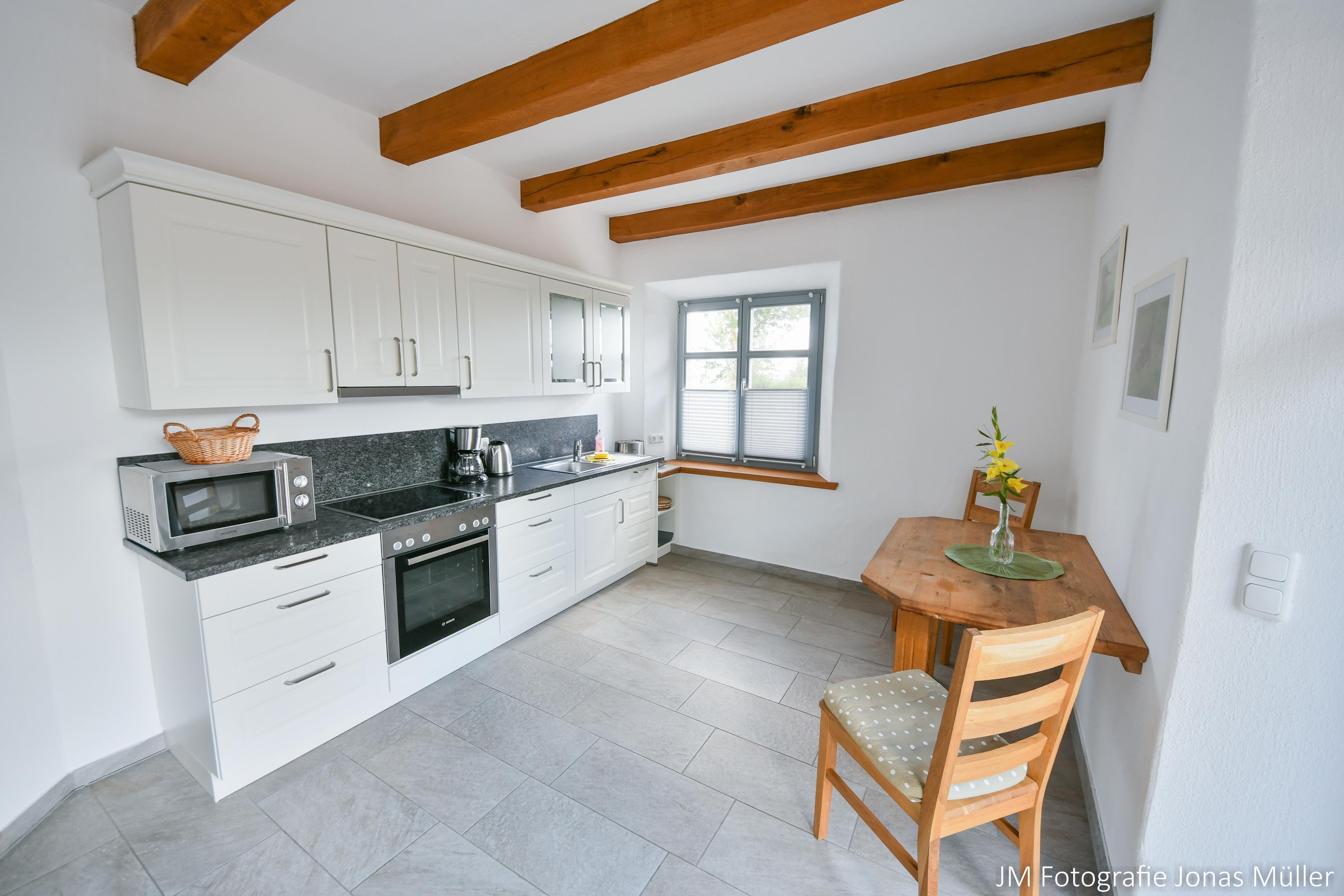 Die Küche hat eine Spülmaschine, einen großen Kühlschrank mit Gefrierteil, Backofen, Kaffeemaschine, Toaster und Wasserkocher, sowie Backzubehör( Mixer, Backformen etc.)