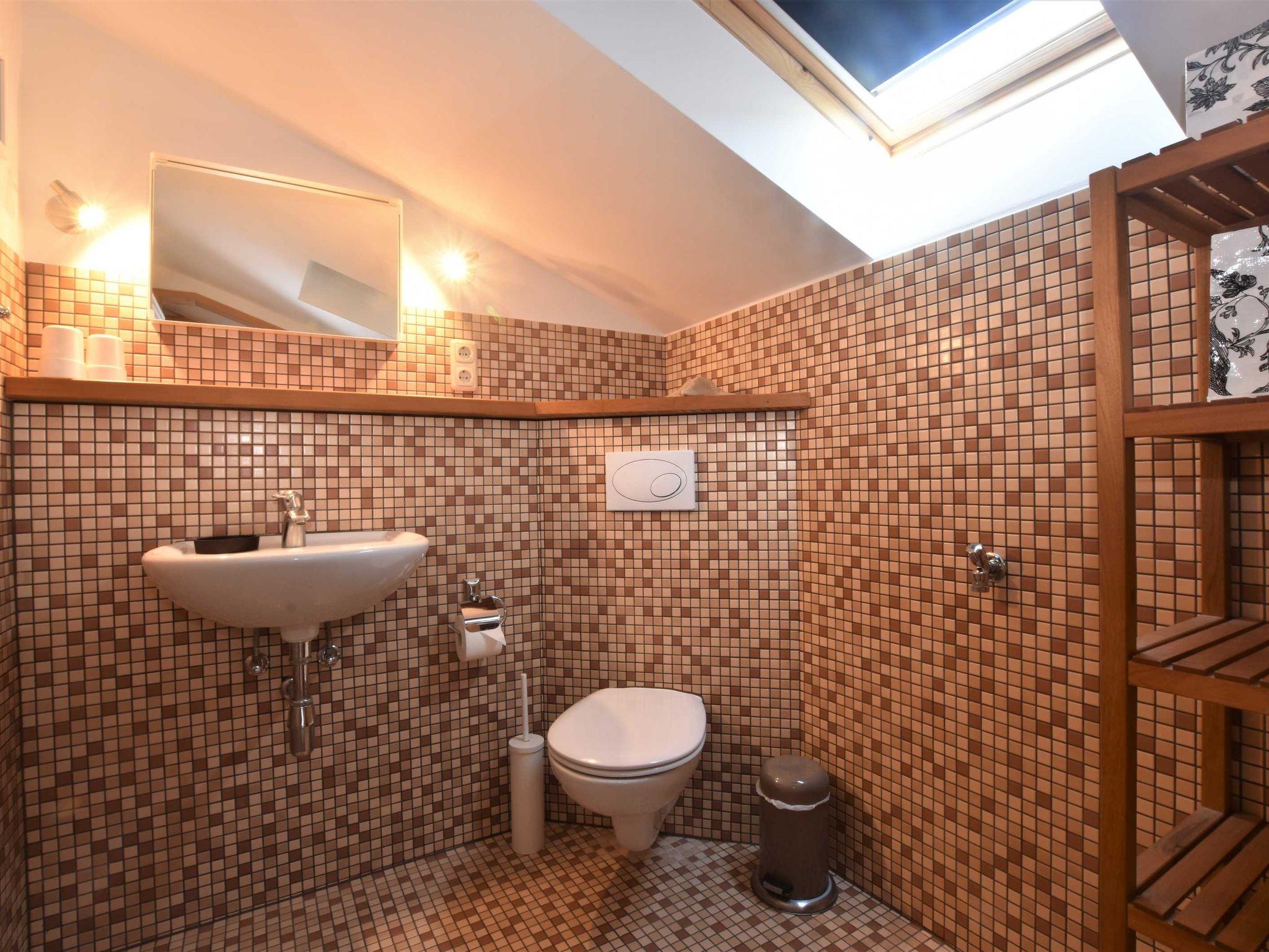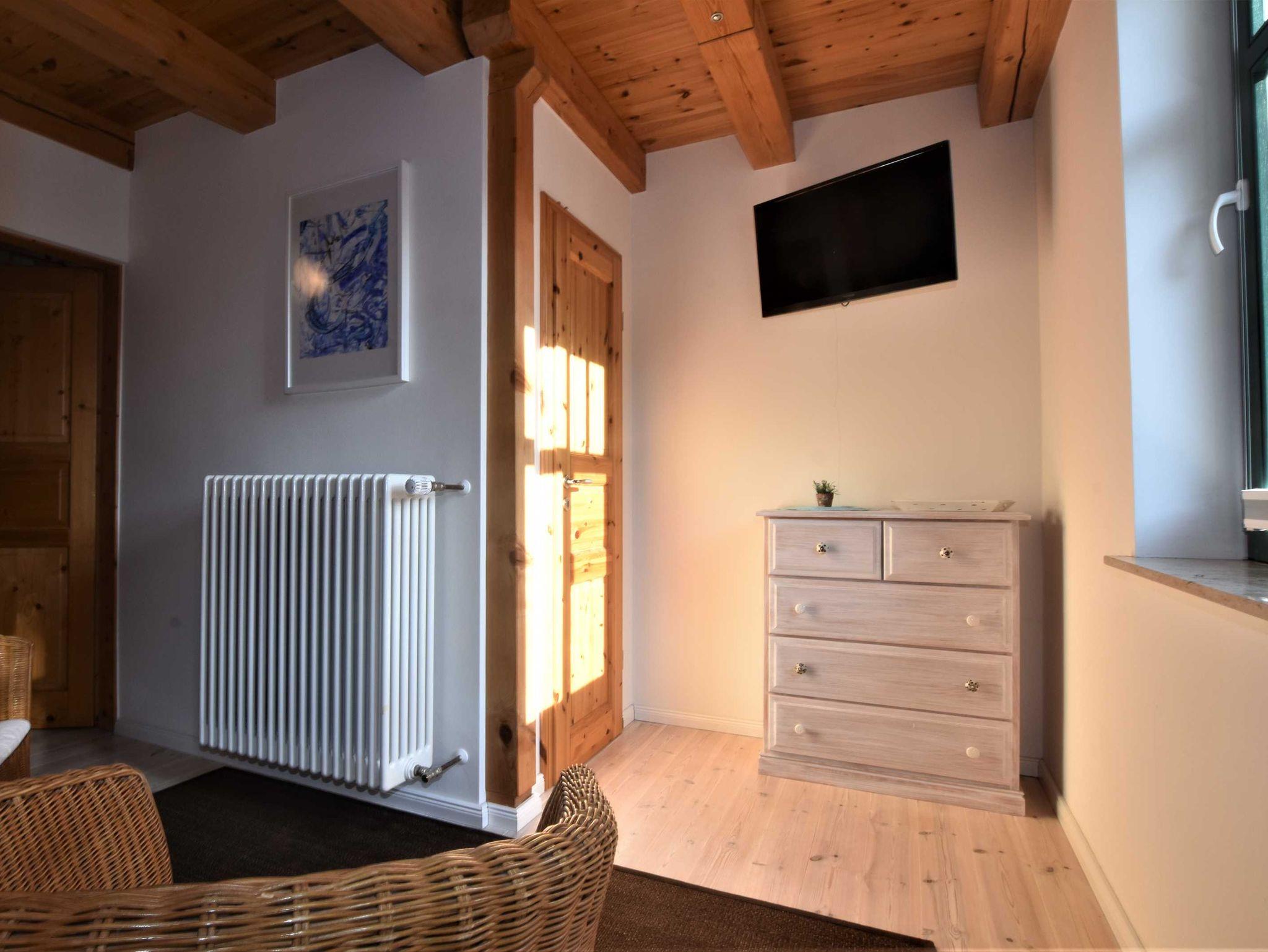 Im Obergeschoss: Die zweite Etage ist über eine stabile große Treppe erreichbar. Schlafzimmer 2 mit 2 Einzelbetten (0,90 x 2m, auch als Doppelbett zusammen stellbar), Kleiderschrank, Couchecke, TV und Gäste-WC.