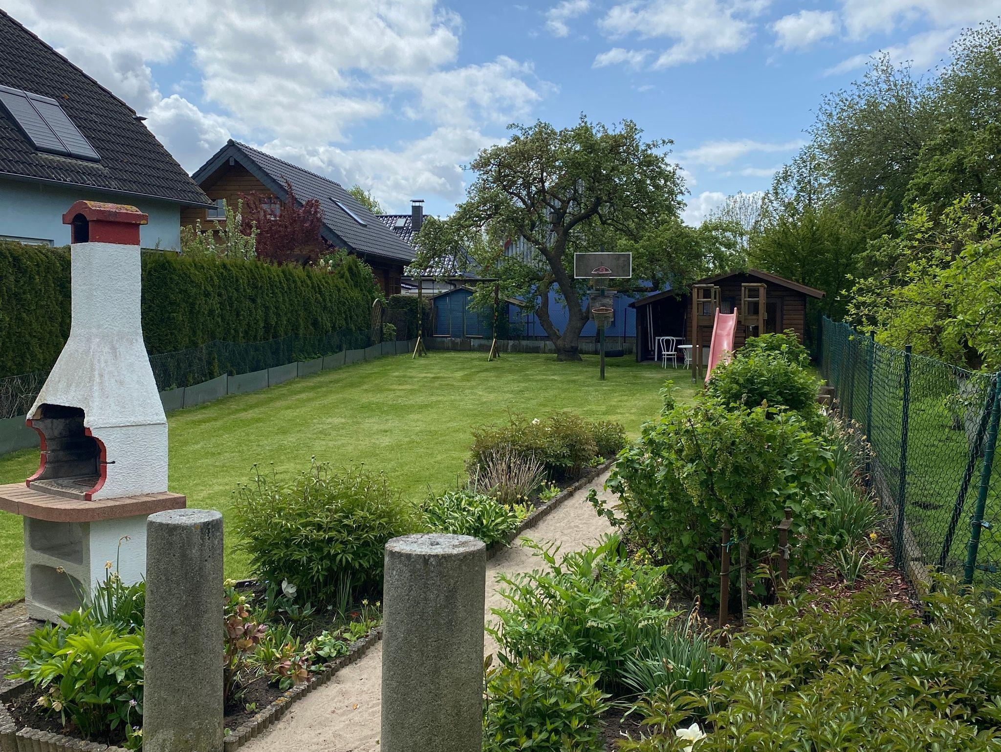 Am Haus: Gepflegter, eingezäunter Garten. Überdachte Terrasse mit Grillkamin, Räucherofen und Gartenmöbel. Kleiner Spielplatz im Garten für Kinder.