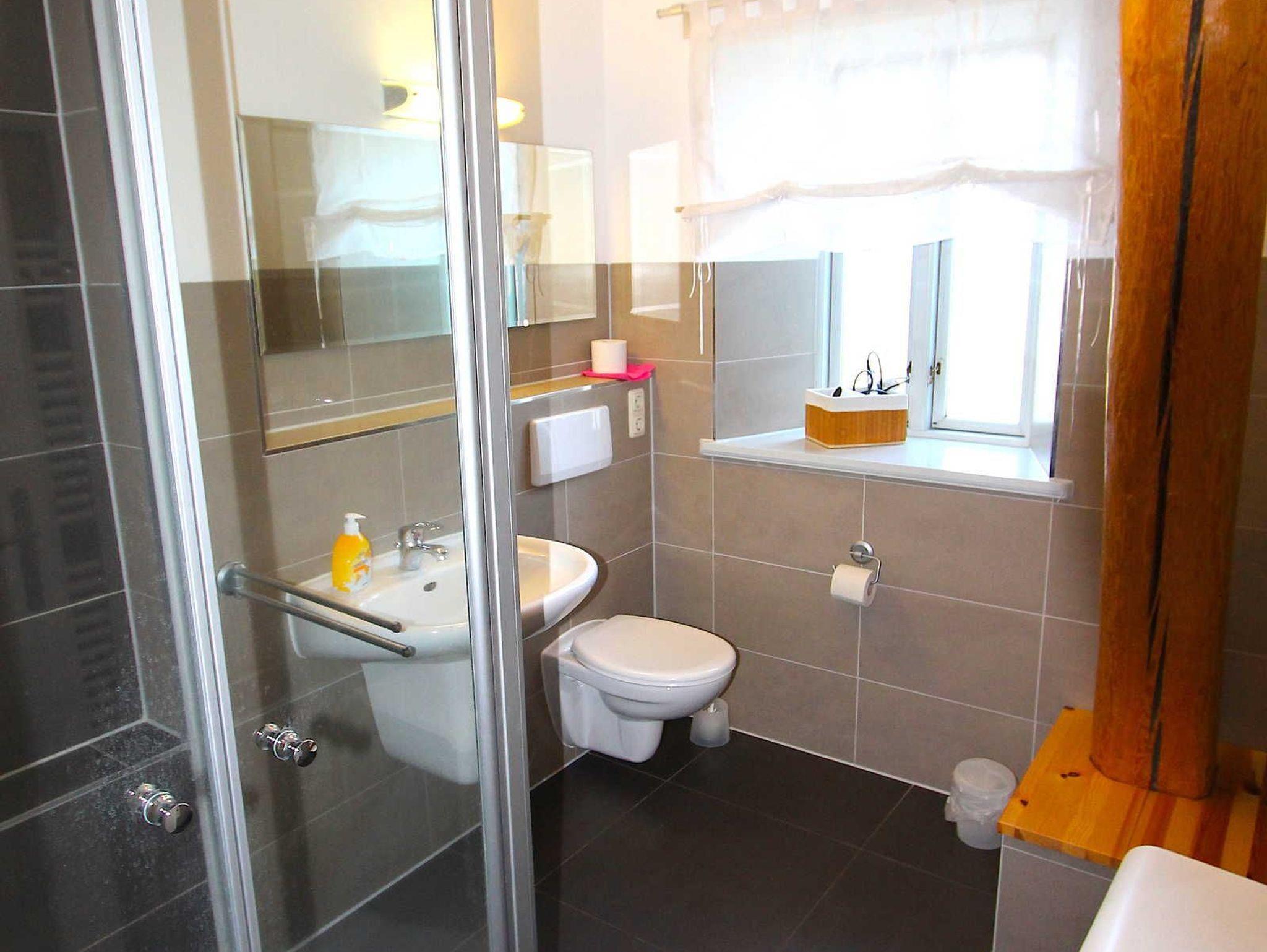Im geräumigen Badezimmer befinden sich eine Dusche und WC.