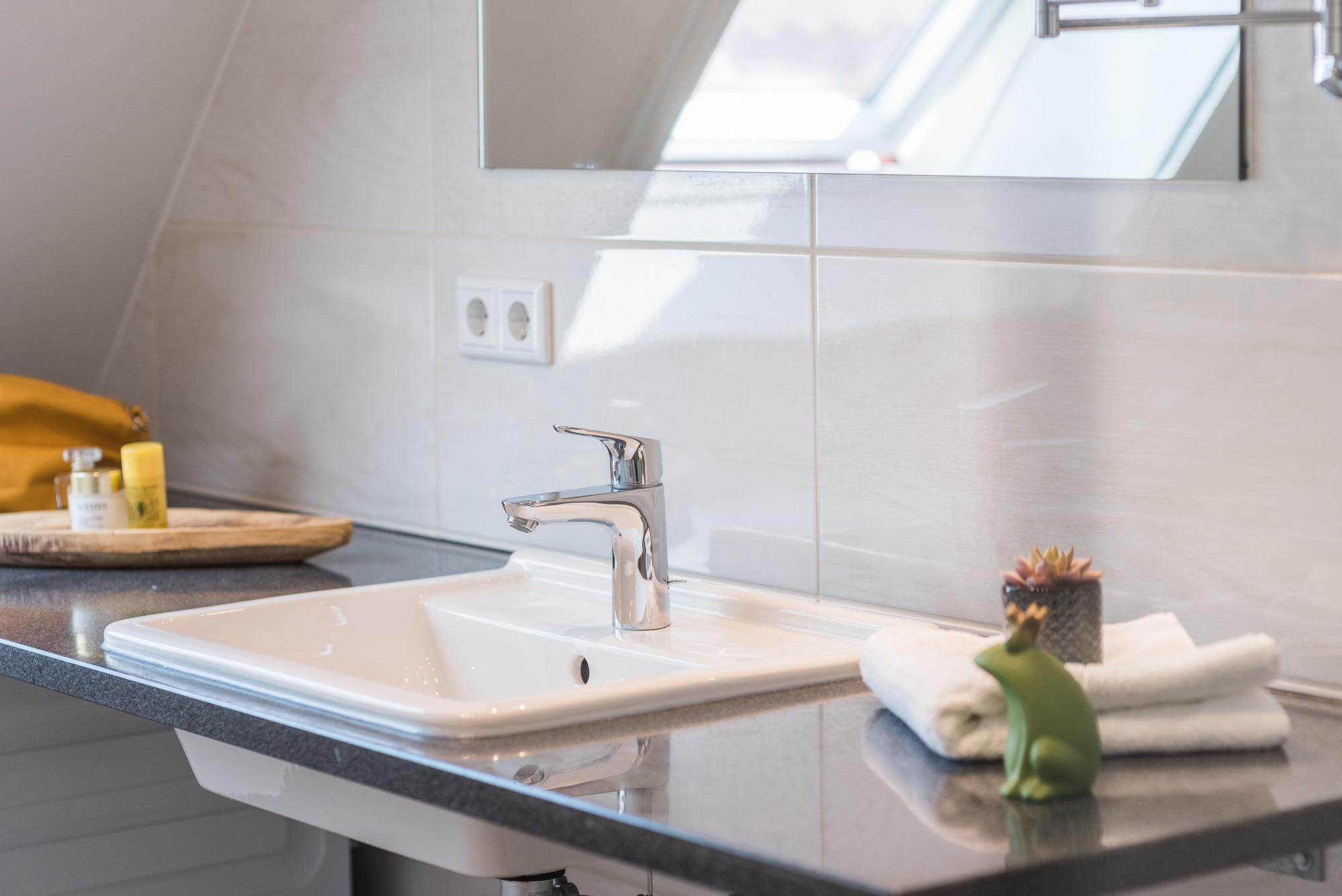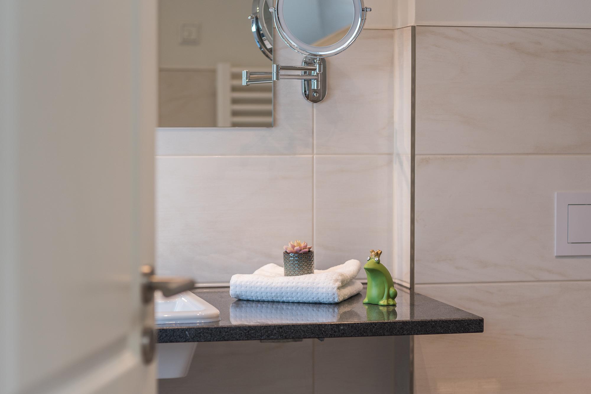 - Ebenerdige Dusche, Waschtisch mit Spiegel, Handtuchwärmer und Haartrockner