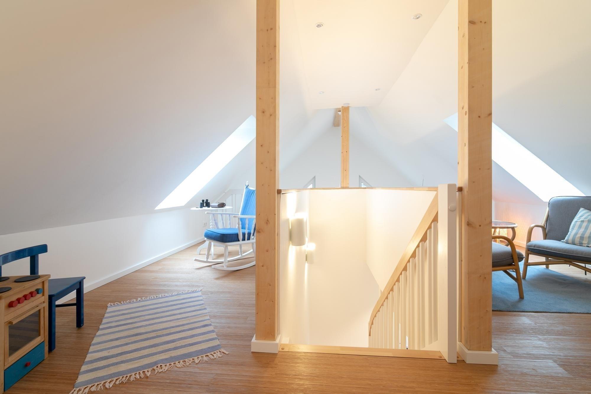 Vom geräumigen Flur gelangen Sie in die offen gestaltete Wohnküche, mit gut ausgestatteter Küchenzeile. Ein lichtdurchfluteter Galeriebereich sorgt für luftige Großzügigkeit. Ein wohliger Ofen, ein großer Esstisch, eine gemütliche Couch und liebevoll platzierte Dekoration bilden das Interieur. Vom Wohnzimmer haben Sie Zutritt zum eigenem Garten mit Terrasse und Strandkorb. Lassen Sie hier am Abend entspannt schöne Urlaubstage ausklingen oder genießen Sie schon den ersten Kaffee am Morgen mit einer frischen Ostseebrise in der Nase. Ein großes Wohlfühlbad mit bodentiefer Walk-In Dusche, Fenster, Handtuchheizung, finnischer Sauna für 3-4 Personen und im Außenbereich während der frostfreien Zeit, eine Dusche sowie ein Gäste-WC perfektionieren dieses schöne Ferienhaus. Im 1. Obergeschoss erwarten Sie zwei Schlafzimmer - eines mit Boxspring-Doppelbett (2x 80x200 cm) und eines mit 2 Einzelbetten (je 90x200 cm). Über ein Treppe gelangen Sie in das stilvolle Dachgeschoss. Hier befinden sich ein Schlafzimmer mit einem Doppelbett (2x 90x200 cm) und einem Homeoffice-Platz für mobiles Arbeiten sowie eine gemütliche Lounge-Ecke im offenen Galeriebereich.