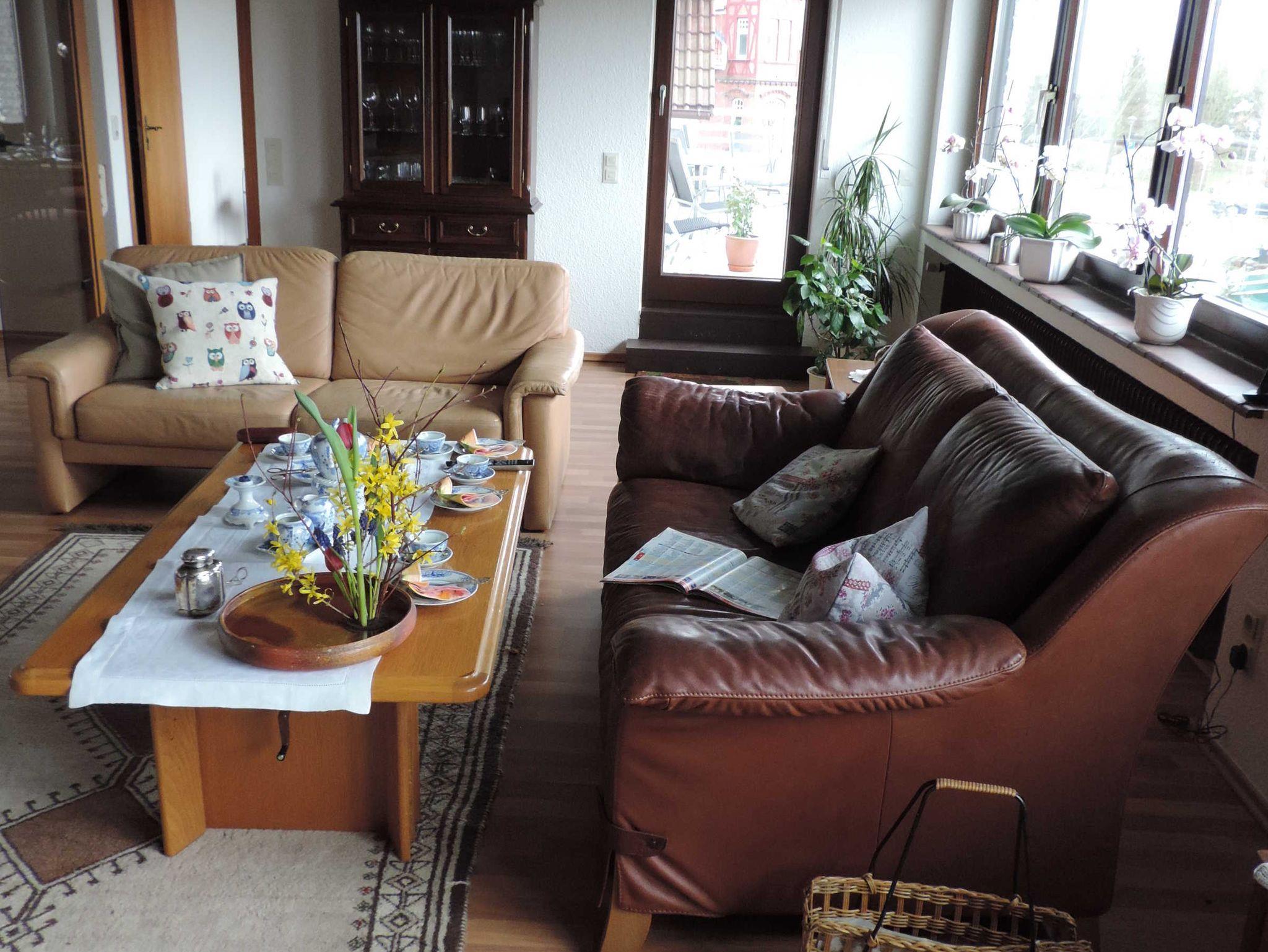 Das große lichtdurchflutete Wohnzimmer mit angrenzendem Balkon lädt zum Relaxen ein. Es beherbergt Sessel sowie 2 Sofas zum Musikhören von unserer Stereoanlage. Von Klassik bis Pop sind CD's in Vielfalt vorhanden. Auch befinden sich im Wohnzimmer ein großer TV und ein DVD Player. Vor dem Kamin lässt es sich gut schmökern. Etliche Bücher sind vorrätig. Auch eine Spielesammlung ist vorhanden.