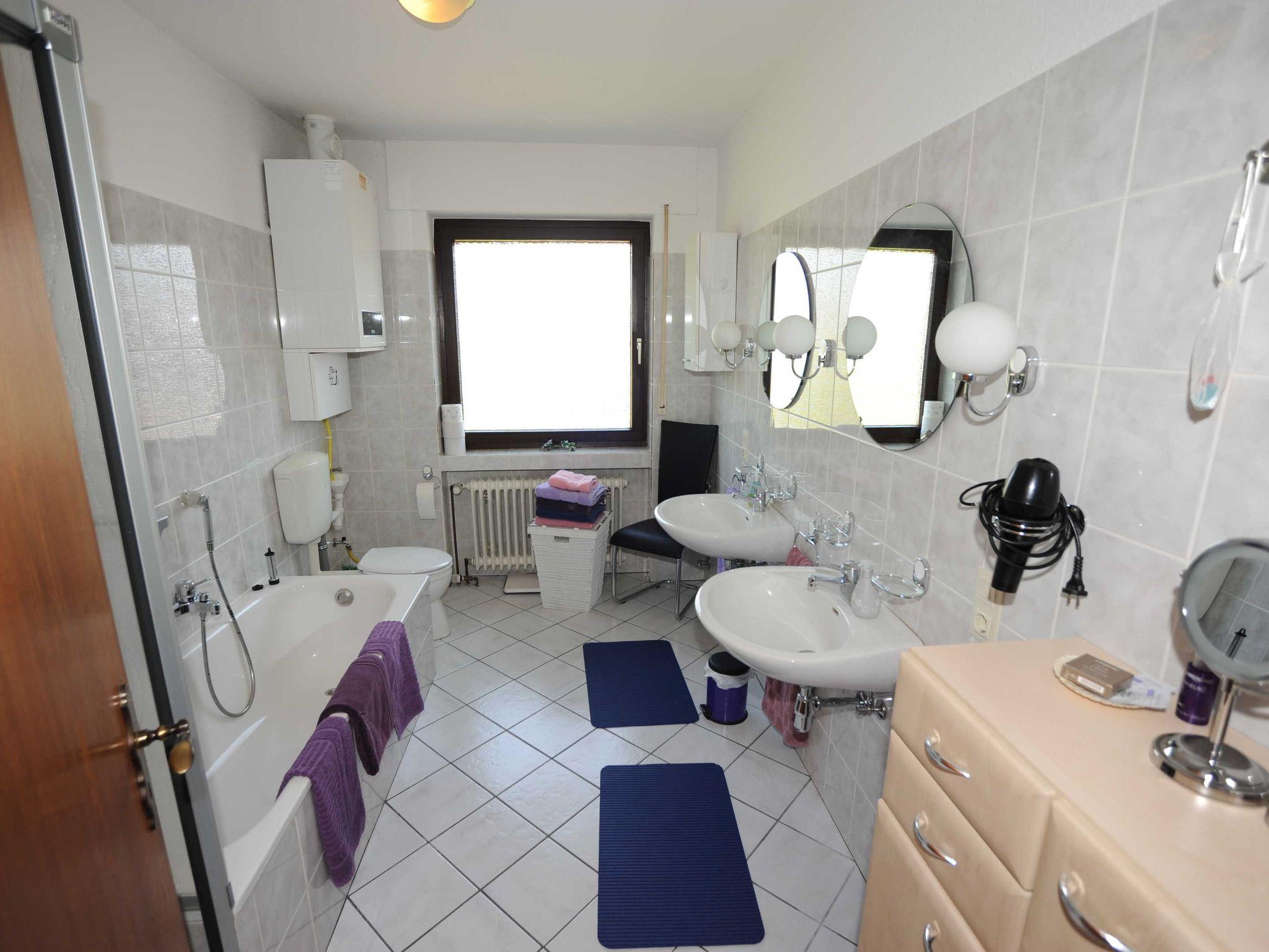 Daneben das geräumige Bad zum Entspannen mit Badewanne, Dusche, 2 Waschbecken und Toilette.