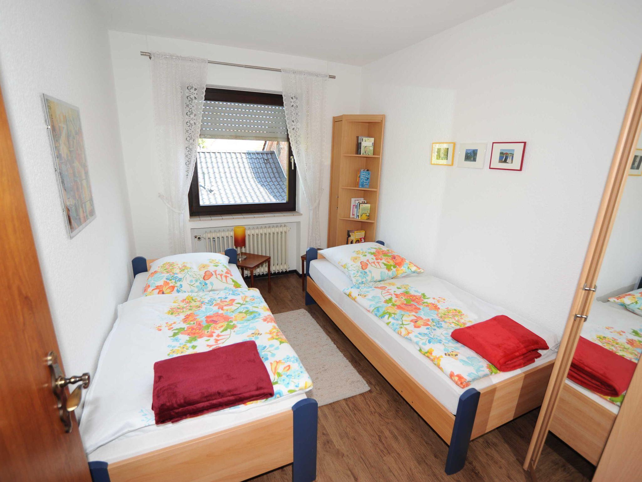 Von dem kleinen Flur aus geht es in die drei weiteren Räume, als erstes in das Schlafzimmer mit 2 Einzelbetten.