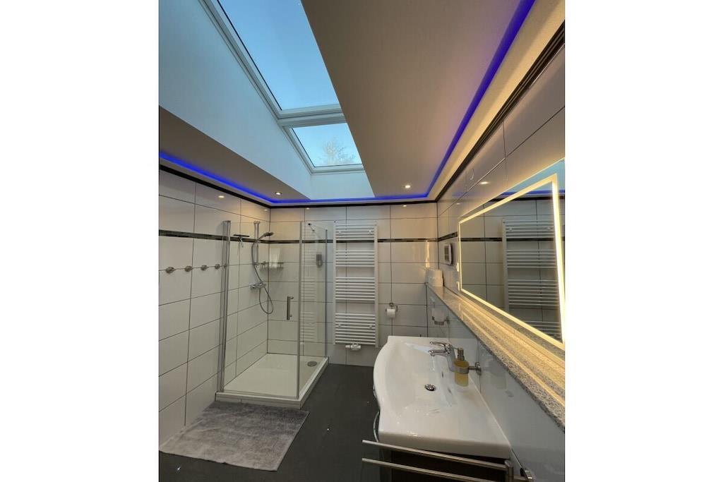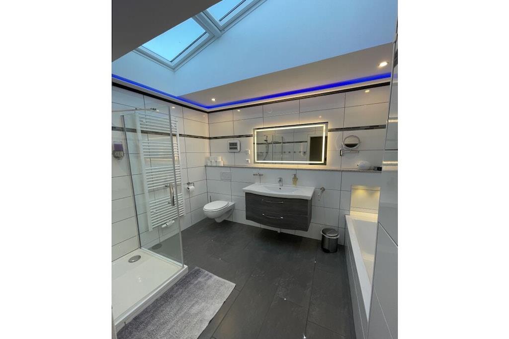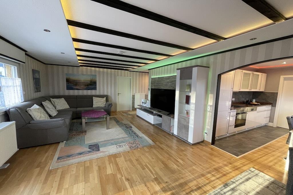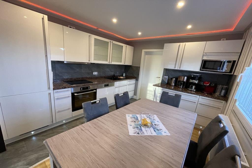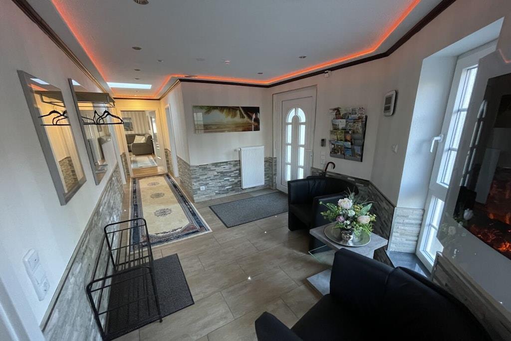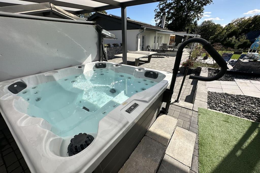 135 sq m holiday home with 1200 sq m of land. Sleeps up to 6-8 people on one level without stairs. The 7th and 8th guests can use the sofa bed in the living room. Heated whirlpool in the garden year-round. 4m x 2m pool available in the garden from April to September. Central electric charging station available. Air conditioning, fireplace, 5 Smart TVs, 200 Mbps Wi-Fi internet, Blu-ray player, and music system, safe. Luxury sauna with infusion heater and infrared heater. Kitchen with granite countertop, refrigerator-freezer, 4-zone stove with induction hob, dishwasher, and microwave. 4 bedrooms with Smart TVs and electric slatted frames. 2 bathrooms with toilet and shower. Washing machine, dryer, and gas central heating. Terrace with seating and grill. Trampoline, table tennis table, and a heated hot tub in the garden Parking for 5 vehicles