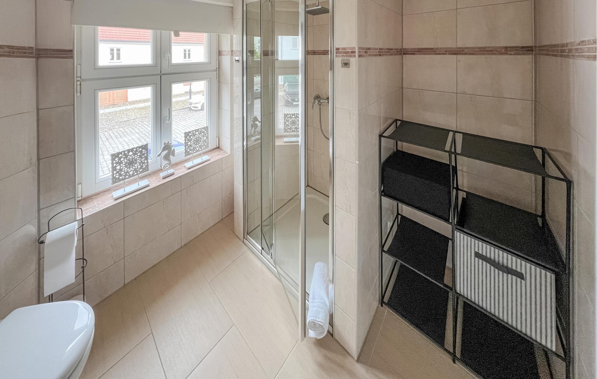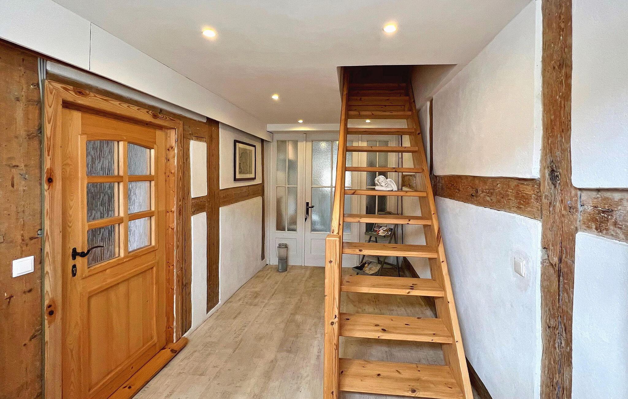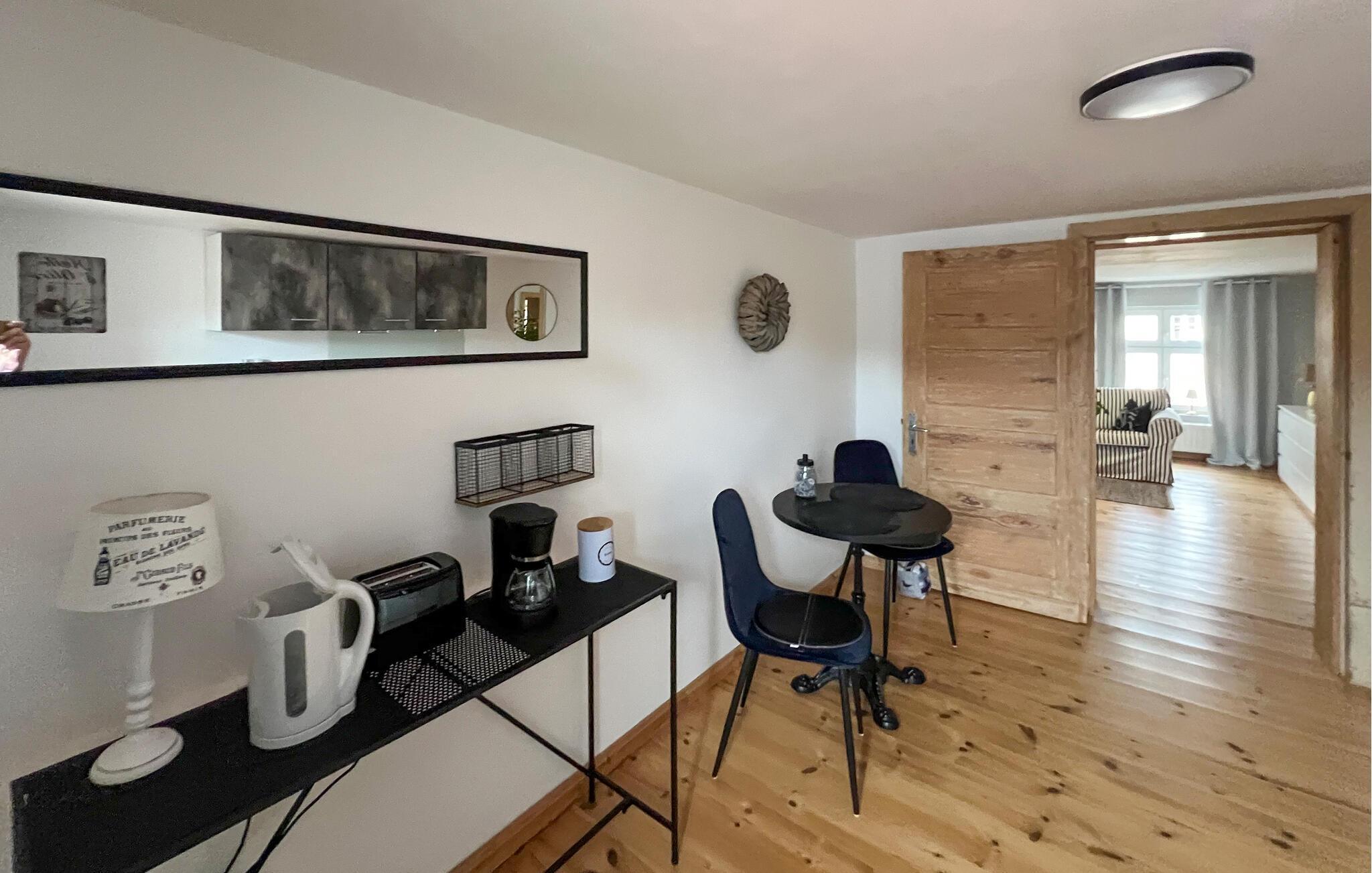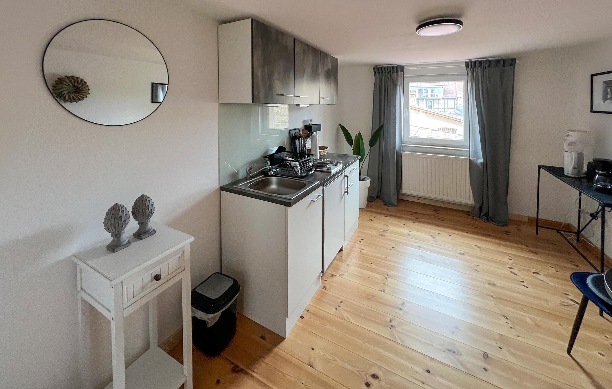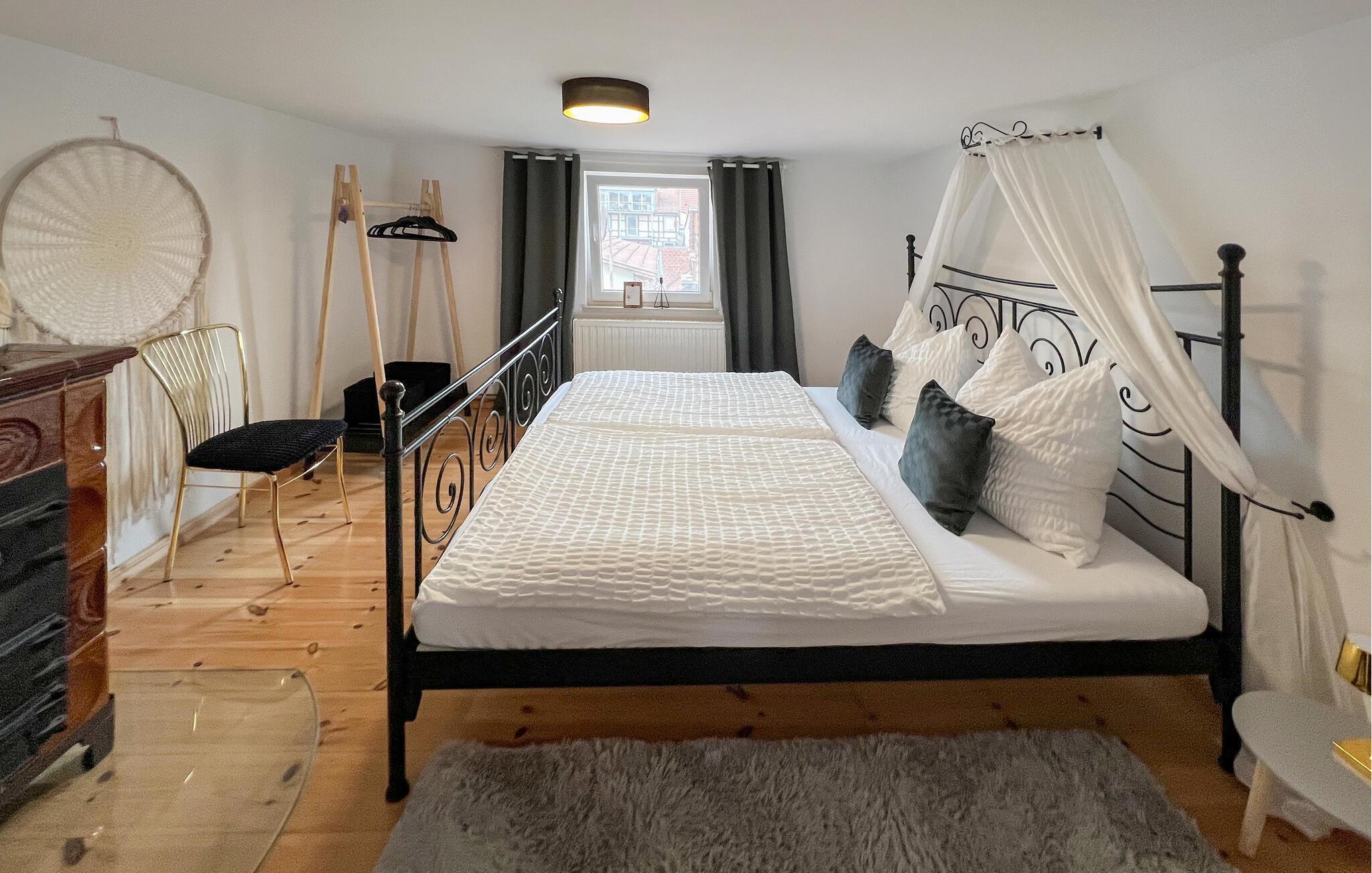 Die ca. 73 qm große Wohnung im Obergeschoss (BITTE BEACHTEN: niedrige Deckenhöhe von ca. 2,10 m) für 2 Erwachsene (über Treppe erreichbar) ist ausgestattet mit einem Wohnraum (Sofa, Flat-TV), einem Schlafzimmer, einer separaten Küche (Esstisch, E-Kochplatten, Kühlschrank mit Gefrierfach, Toaster, Wasserkocher, Kaffeemaschine) und einem Badezimmer (Dusche, WC, Föhn). Ein Sitz- und Liegebereich im Innenhof steht dieser Wohnung zur Verfügung. Da es sich um ein altes Haus handelt, beachten Sie bitte die niedrigen Deckenhöhen, vor allem im Obergeschoss (2,10 m). Auf Anmeldung kann in einem wenige Schritte entfernten Café gegen Gebühr Frühstück eingenommen werden. Direkt vor dem Haus kann ein kostenfreier Parkplatz genutzt werden, weitere Parkplätze (tagsüber von 9-18 Uhr kostenpflichtig) finden sich direkt in der Straße oder ohne Gebühr wenige Schritte entfernt in der Umgebung. Zum Ein- und Ausladen kann vor dem Haus gehalten werden.