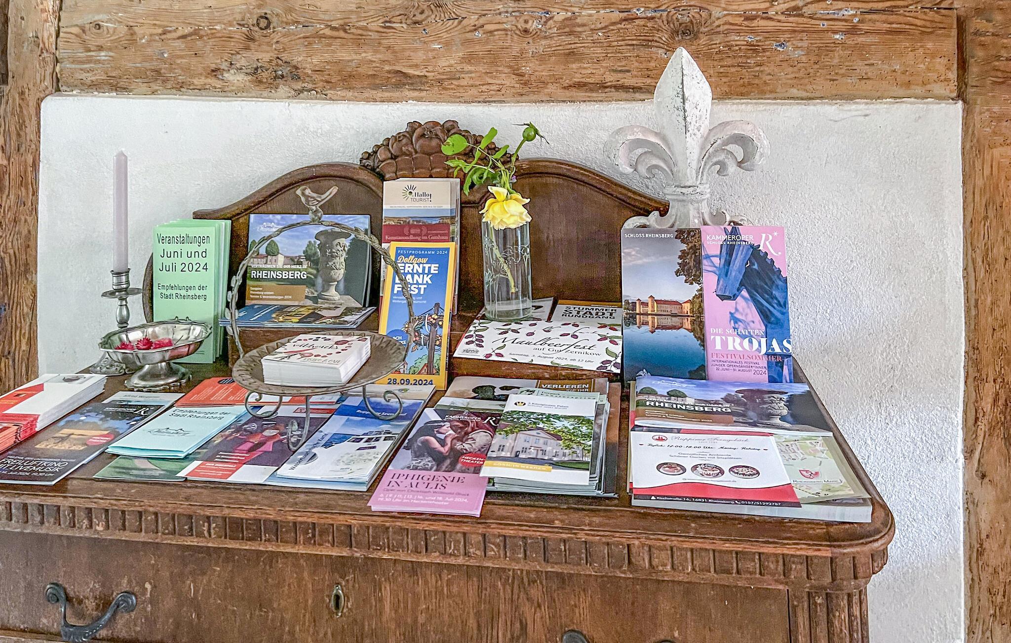 Die Kleinstadt Rheinsberg ist staatlich anerkannter Erholungsort inmitten der wunderschönen Rheinsberger Seenlandschaft in Brandenburg. Die Region beeindruckt durch unzählige Seen, die mit Kanälen miteinander verbunden sind. Ein idealer Urlaubsort, nicht nur für Wasserwanderer. Durch den preußischen Kronprinzen Friedrich, der im 18. Jahrhundert im Rokoko-Schloss in Rheinsberg residierte, wurde der Ort zu einem blühenden, kulturellen Zentrum und inspirierte unter anderem Kurt Tucholsky und Theodor Fontane. Heute finden auf dem Schlossgelände, auf dem auch ein Theater, die Kammeroper und das Kurt-Tucholsky-Museum integriert sind, alljährlich das Kammeroper-Festival und weitere Musikveranstaltungen statt. Der jährlich im Herbst stattfindende Töpfermarkt mit internationalen, professionellen Ausstellern lockt ebenfalls Tausende Besucher an.Neben der sehenswerten Altstadt mit zahlreichen Restaurants und Cafés zählen Fahrgastschifffahrt, Boots- und Fahrradverleih sowie eine Badeanstalt am Grienericksee zu den Besuchermagneten im Ort. Der Anschluss an den Fernradweg Berlin-Kopenhagen befindet sich in ca. 20 km Entfernung.