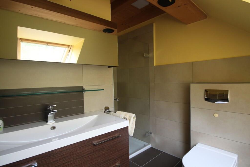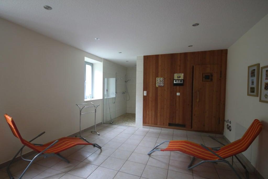 On the 1st floor: (bathroom(Make Up Mirror, Mirror, bath tub, shower, washbasin, toilet, hairdryer, insect screens)) Attic: (hallway(Wardrobe Coatrack), open kitchen(Armchair, Games, Sofa, Spices, Tea Towels, Wardrobe Coatrack, Kitchenette, library, TV, dining table, DVD player, stereo unit, hob, electric kettle, toaster, coffee machine, oven, microwave, dishwasher, fridge, dishes and cutlery), bedroom(Bed Linen, Wardrobe, double bed, children's bed), bedroom(Bed Linen, Wardrobe, single bed, single bed, TV, insect screens)) Fire Alarm, Hot Water, Pier, Vacuum Cleaner, carport, Internet access, Internet access, First Aid, tumble dryer, washing machine, heating, terrace(Sun Umbrella, grill, garden furniture), garden(Sun Umbrella, sauna, Table tennis, Lawn, garden furniture, sand pit, Swing set), parking, bicycles available, ironing board, iron, drying cabinet, Laundry Package for a fee