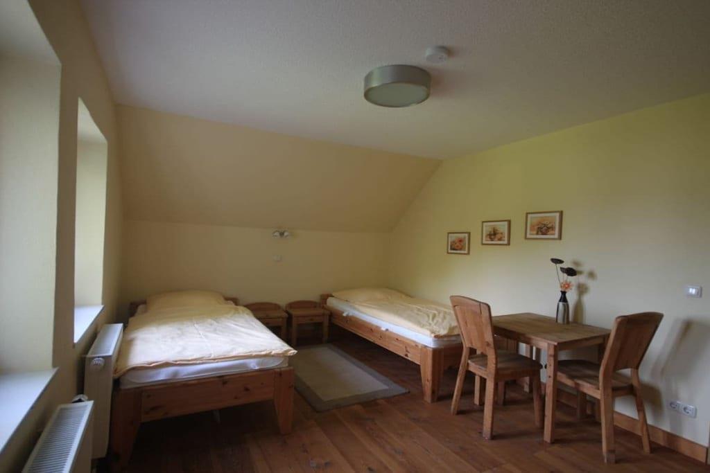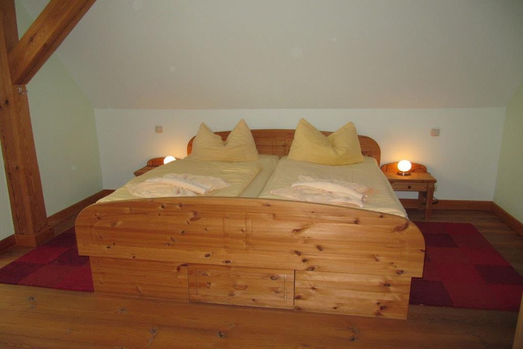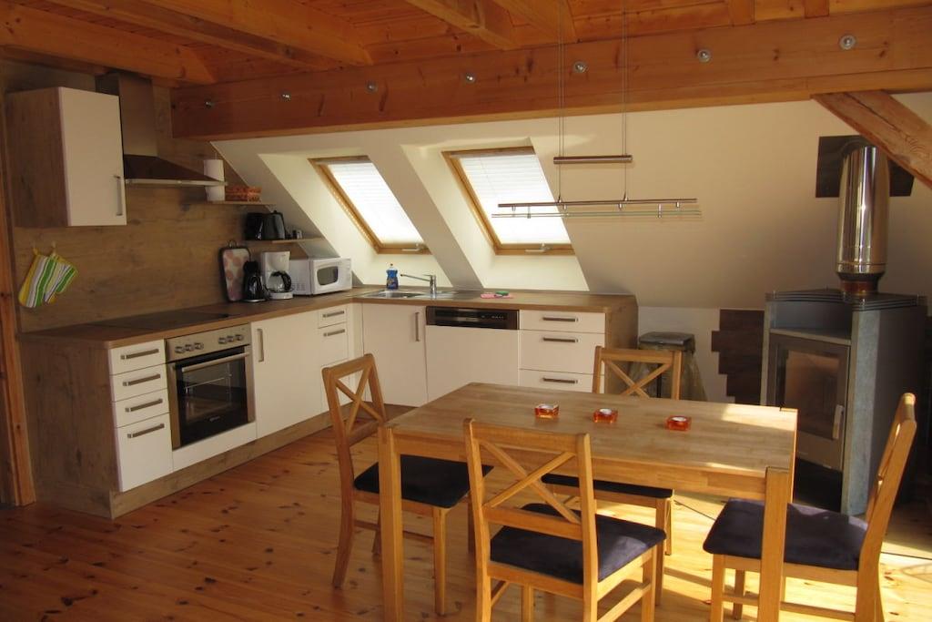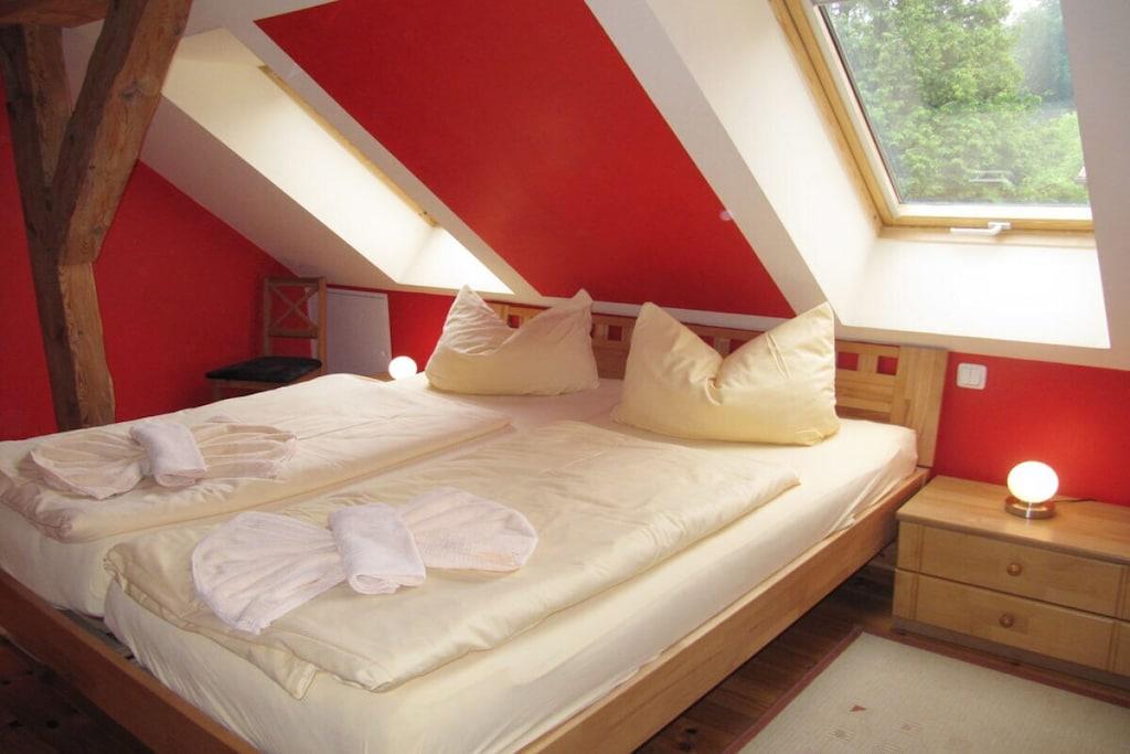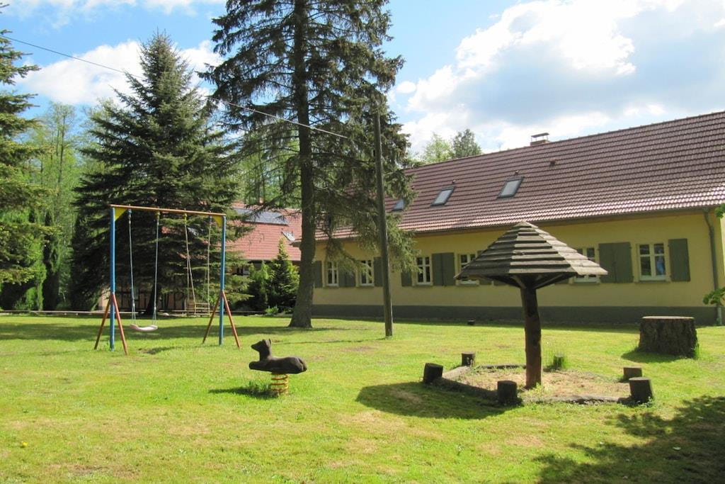 The Boberow Forest Lodge on Lake Grienericksee was extensively and lovingly renovated in 2006. From the windows, you can enjoy a magnificent view of Rheinsberg Palace. The approximately 5,000 m² lakeside property is fenced and, with its spacious grounds and private playground, invites guests of all ages to relax. The holiday apartment on the upper floor boasts a generous living and dining area with a fully equipped kitchen. It features two bedrooms and a luxurious bathroom. A private terrace with a large barbecue in the garden completes this wonderful apartment.