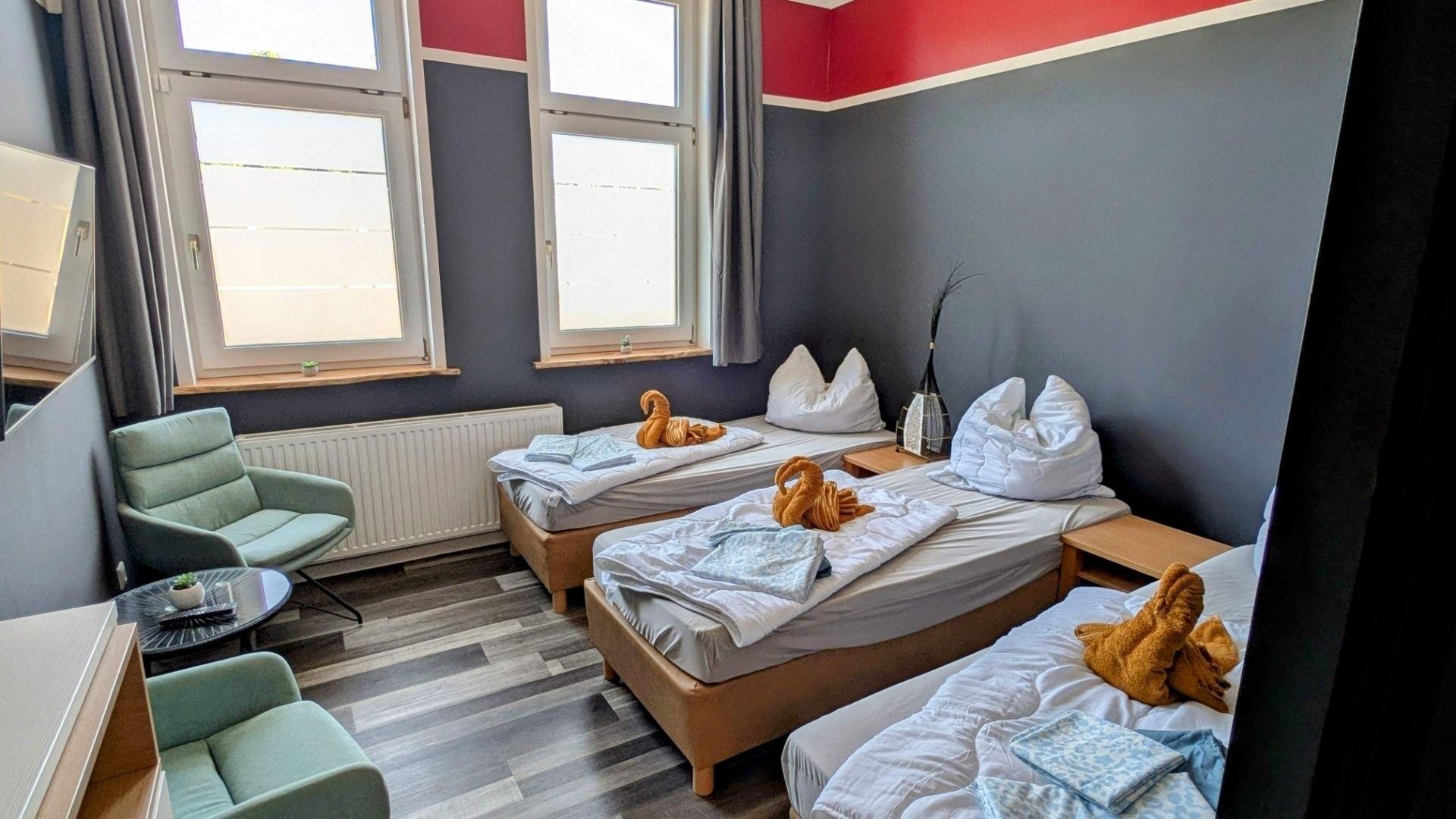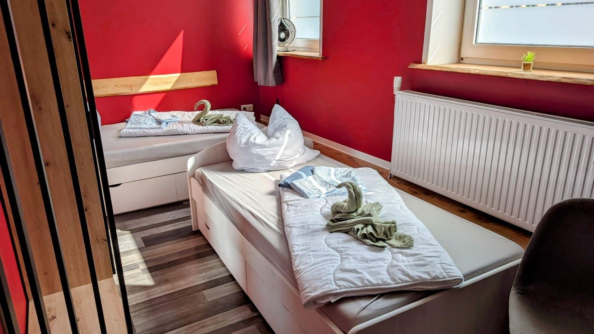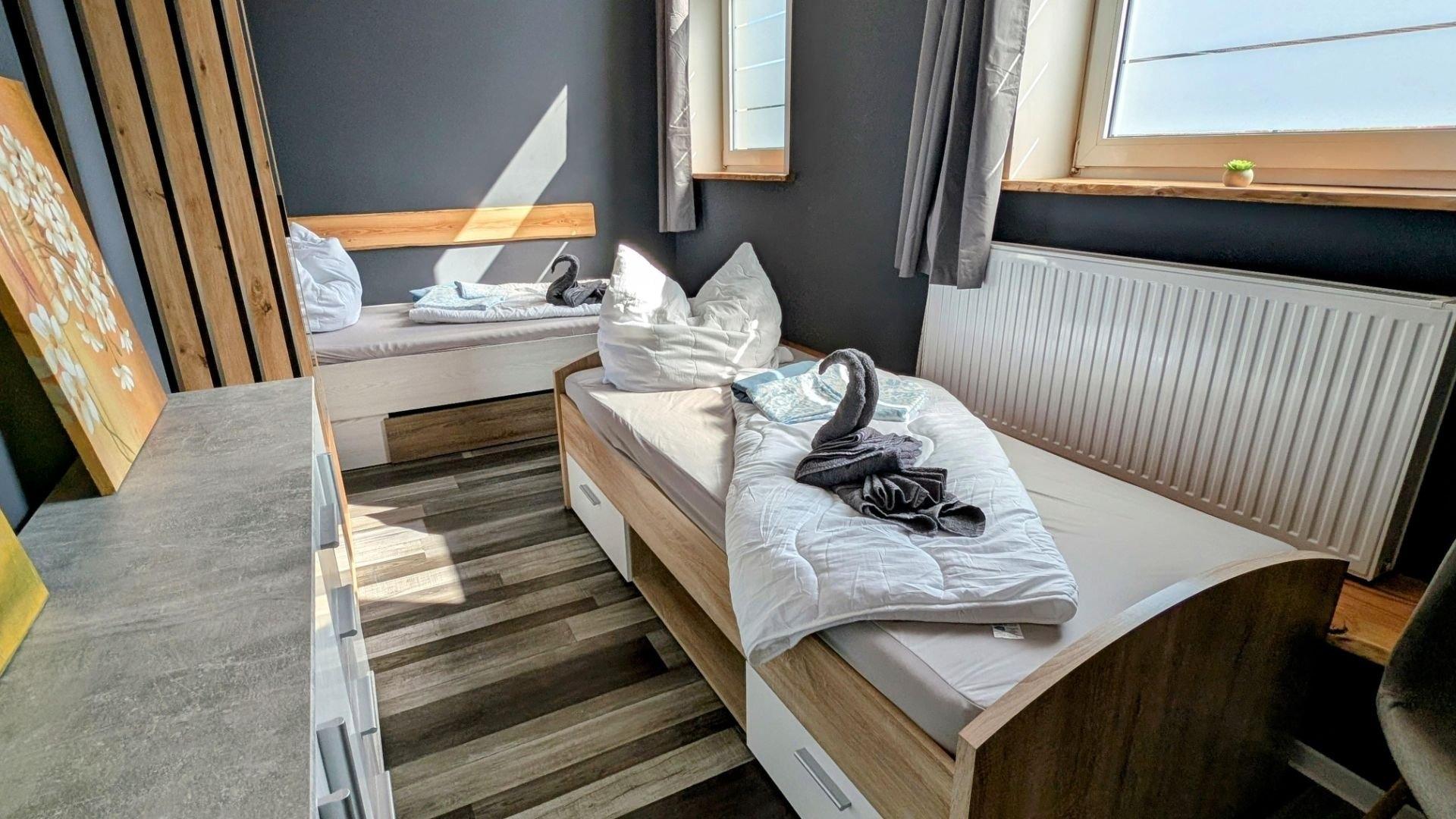 Die Unterkunft verfügt über vier separate Zimmer, jedes mit zwei Betten, eigenem Duschbad und TV ausgestattet. Bei Bedarf ist eine Aufbettung möglich. Kostenfreies W-LAN steht in der gesamten Wohnung zur Verfügung und sorgt für eine zuverlässige Verbindung ob zum Arbeiten, Streamen oder Planen von Ausflügen.