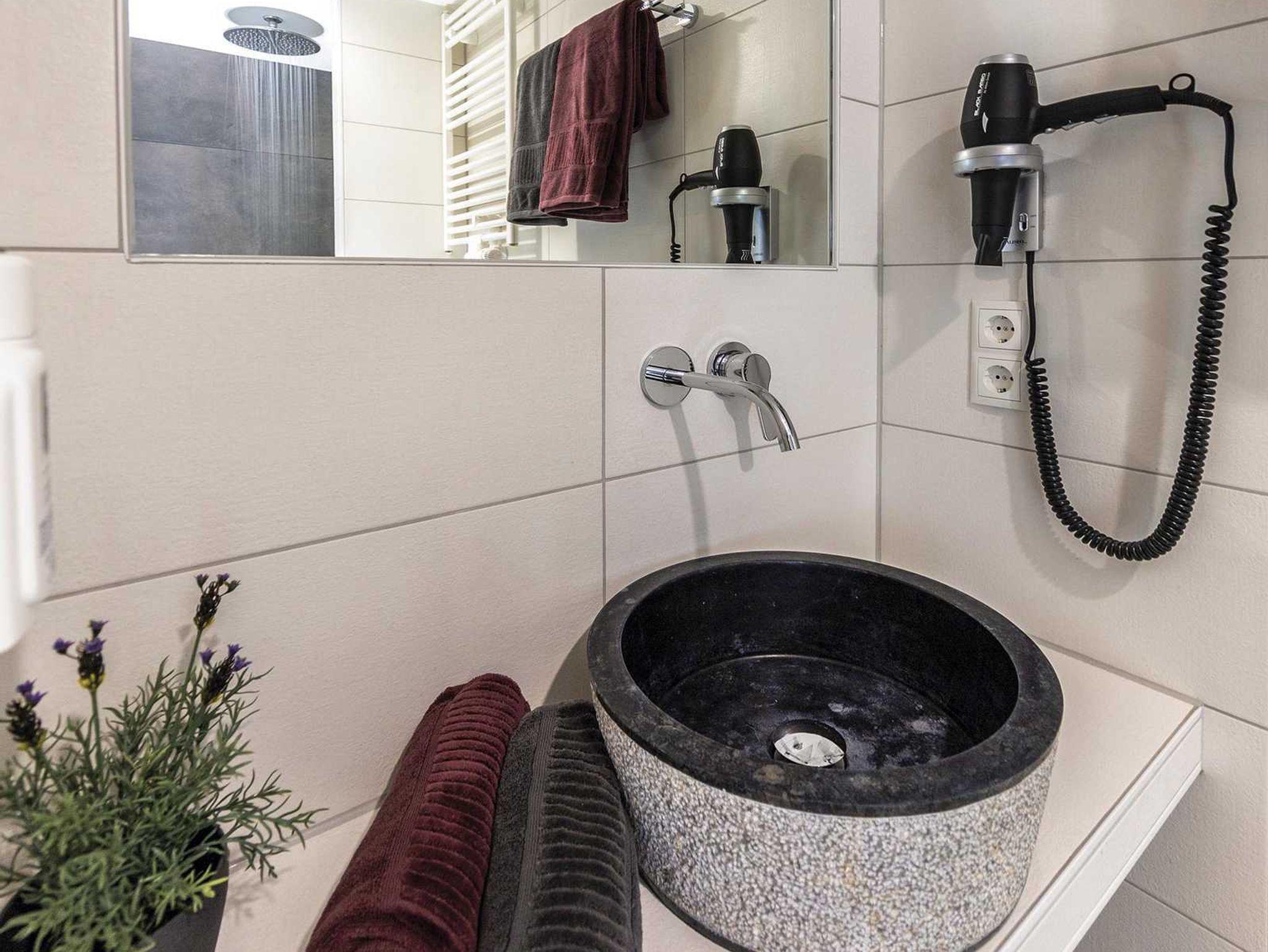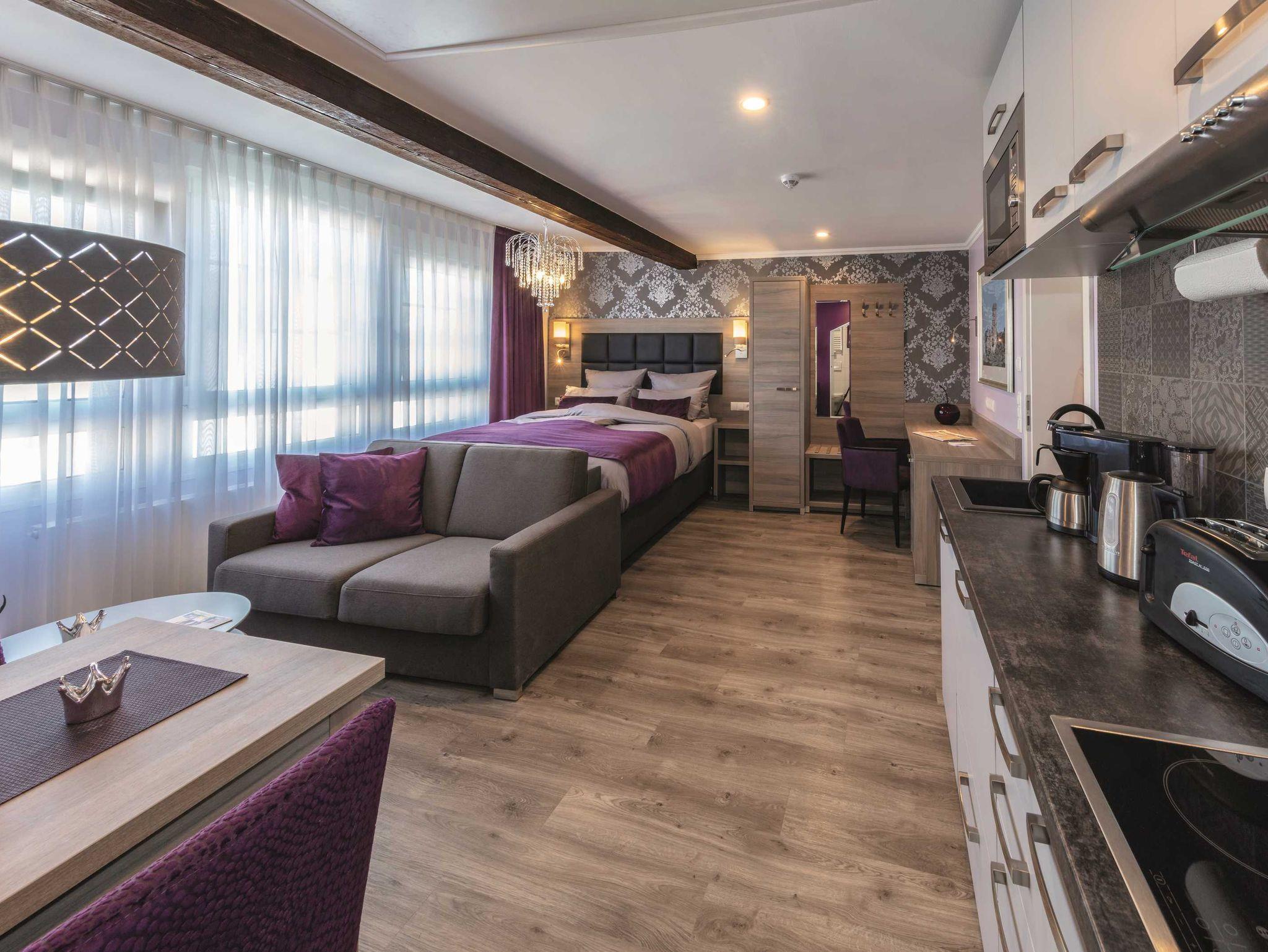 Im Haus Burgenheimat befinden sich 8 Apartments: 2 Princesize-Apartments (20 - 30 m²), 1 Queensize-Studioapartment (25 m²), 2 Queensize-Apartments (30 - 40 m²) und 3 Kingsize-Apartments (40 - 50 m²). Schlafen Sie wie ein König in den komfortablen überlangen Boxspringbetten (2,20 m) der Premium-Marke Royal Bedding®. Die Bettbreite beträgt in den Princesize-Apartments 1,00 m, in den Queensize-Apartments 1,60 m und in den Kingsize-Apartments 2,00 m. Alle Betten haben eine durchgängige extrahohe Matratze für besonderen Schlafkomfort. Im ?Thronsaal?, dem modernen Badezimmer, erwartet Sie ein WC mit integrierter Lüftung, ein stilvolles Waschbecken und eine bodengleiche Dusche mit Regenbrause und Handbrause. Die Küche ist mit allem, was man braucht, ausgestattet. Bereiten Sie sich z.B. ein leckeres Frühstück mit dem Tefal Toast'n'Egg und brühen sich Ihren Kaffee mit der Senseo Switch entweder mit Filter oder mit Kaffeepad. Auf dem 4-Platten-Cerankochfeld lassen sich auch komplette Menüs zubereiten. Eine Mikrowelle mit Grillfunktion sorgt für Essen in Minutenschnelle. Und damit der Abwasch nicht lästig wird, steht eine kompakte Geschirrspülmaschine bereit. Durchdachte Annehmlichkeiten erwarten Sie in jedem Raum der Apartments: ein digitaler Türspion, USB-Anschlüsse an den Leuchten am Bett sowie am Schreibtisch, eine integrierte Toilettenlüftung, eine bodengleiche Dusche mit Regenbrause, ein Laptop-Safe, überlange Betten, extrahohe Matratzen, große UHD-Smart-TVs, vollausgestattete Küche inkl. kompaktem Geschirrspüler. Neben der Selbstverpflegung besteht die Möglichkeit am Frühstücksbuffet des Hotels teilzunehmen. Als Gast erhalten Sie außerdem für die Dauer Ihres Aufenthalts ein kostenfreies Gästeticket für die Nutzung des ÖPNV im Gebiet des VRM.