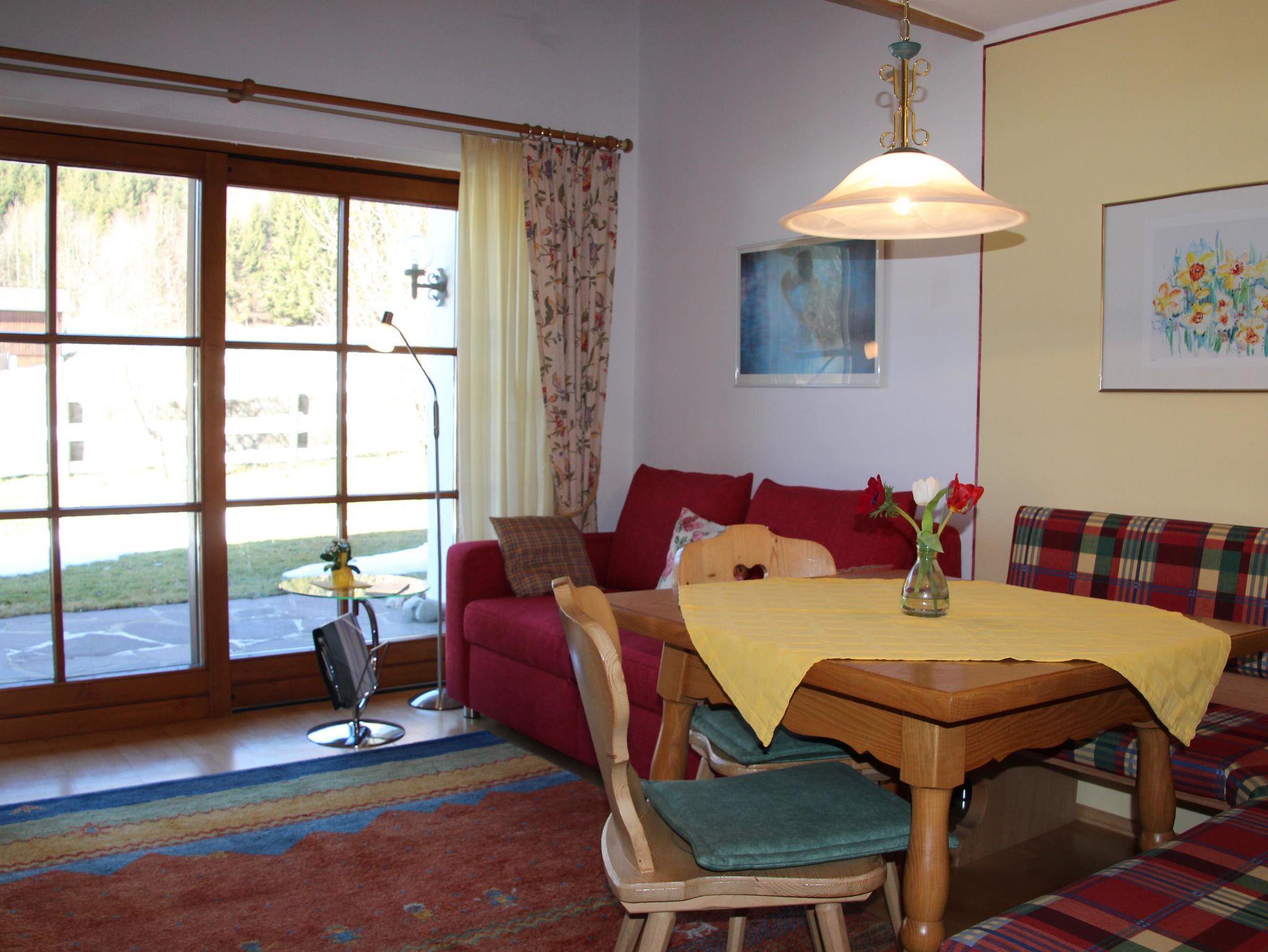 Ein Kleinod mit ca. 40qm ist unser Schwalbennest. Ein gemütlicher Wohnraum/Essecke, in warmen Farben, mit großer Glas-Schiebetür zur möblierten West Terrasse und eine gut ausgestattete Küchenzeile mit Mikrowelle.
