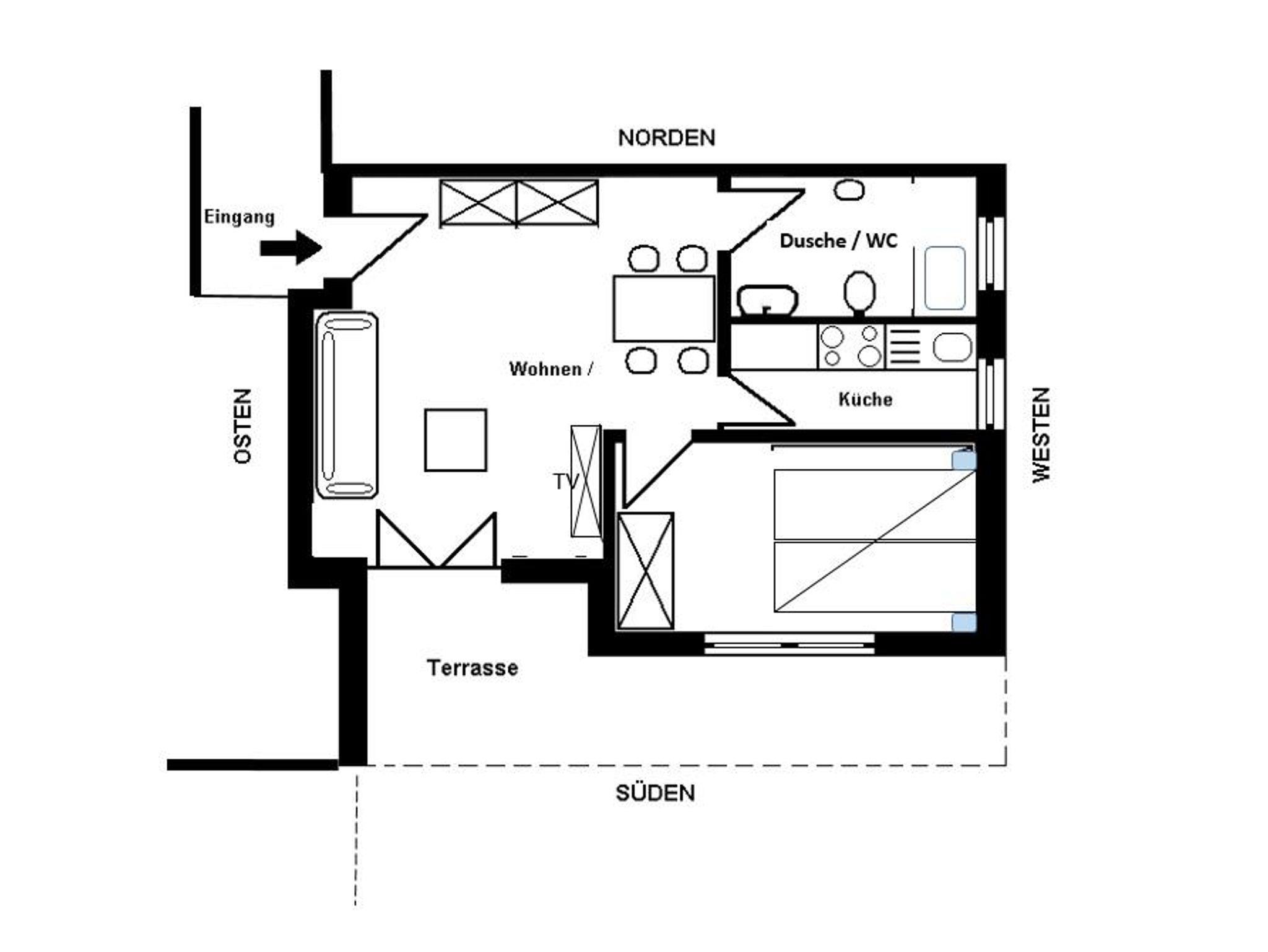 Terrassenwohnung Säuling mit einem Schlafzimmer, separater Küche mit Geschirrspüler, Wohnraum mit Essplatz und Südterrasse im Gartengeschoss(Hanglage) mit Blick auf die Lechtaler Alpen, Bad mit WC, Telefon und Tresor.
