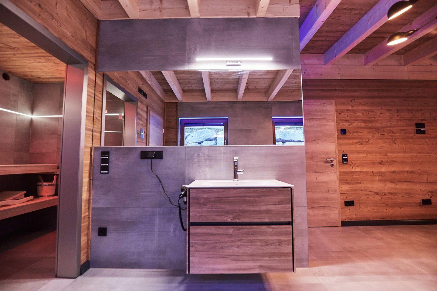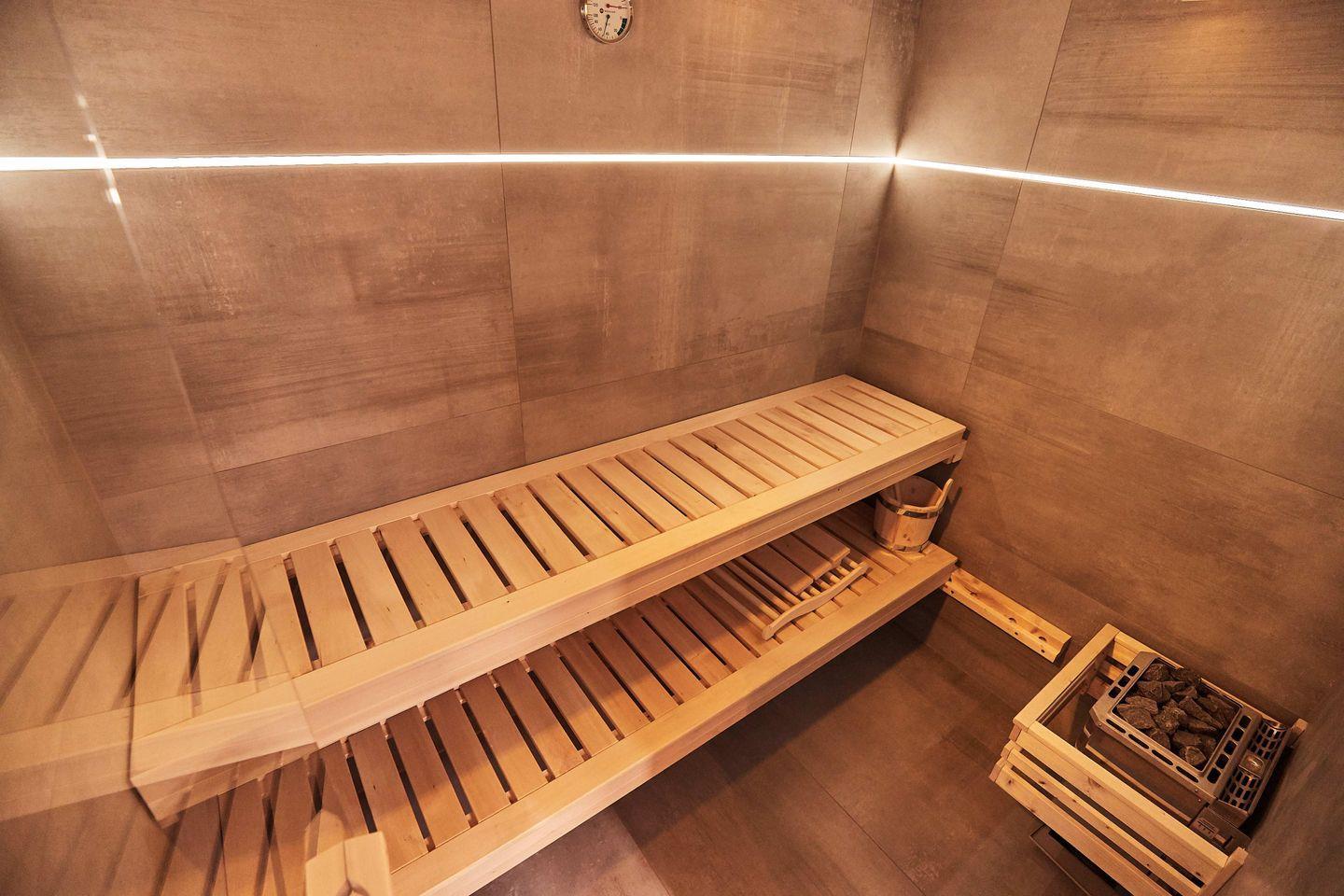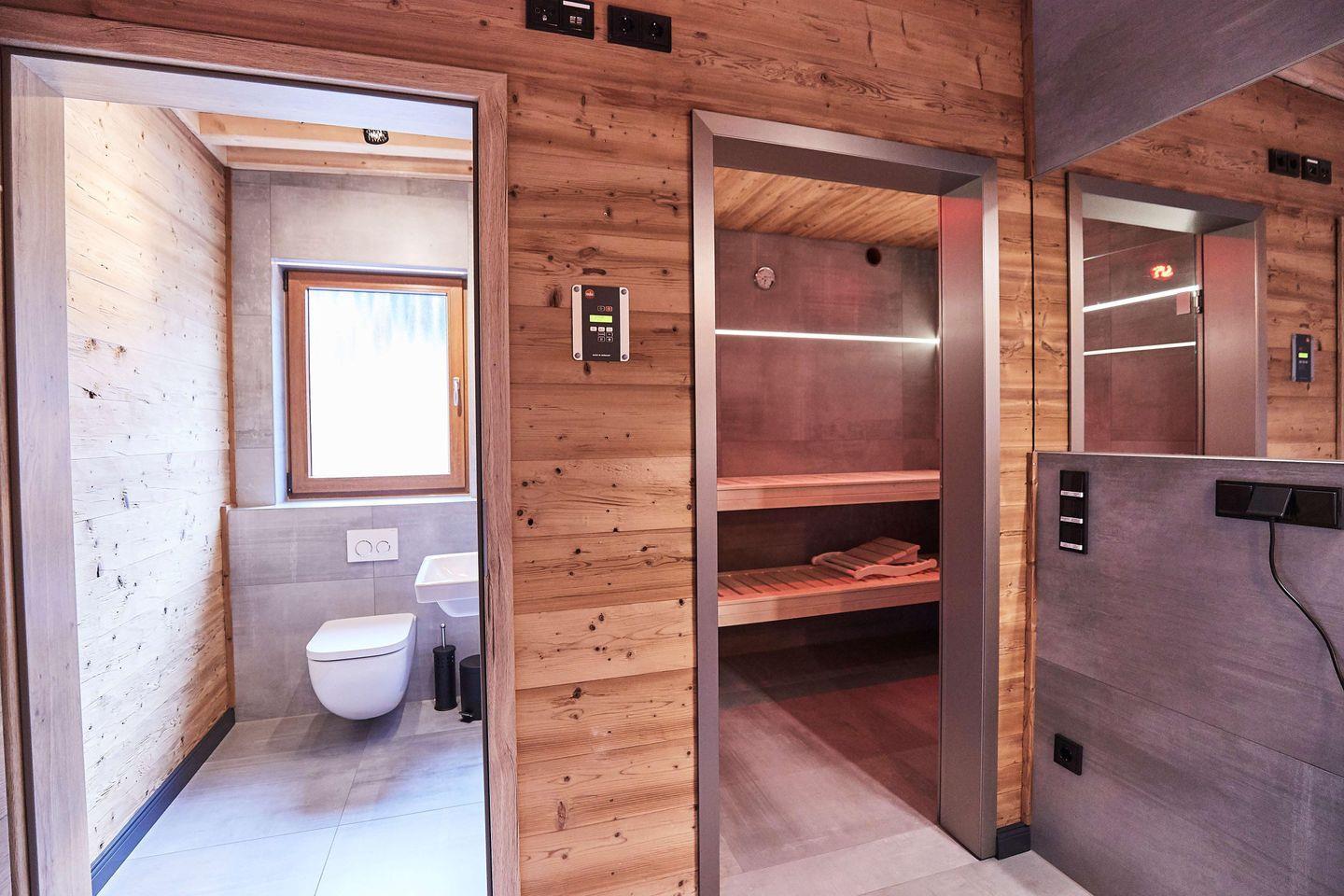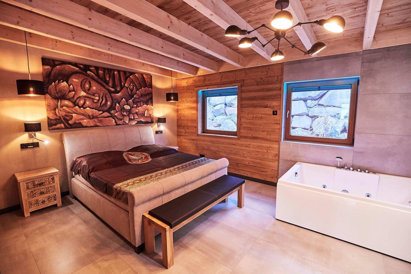Dieses geräumige Schlafzimmer bietet ein komfortables Boxspringbett (180 x 200 cm), einen Whirlpool, eine ebenerdige XL-Dusche, eine Sauna, ein separates WC, ein großes Waschbecken und einen Fön.