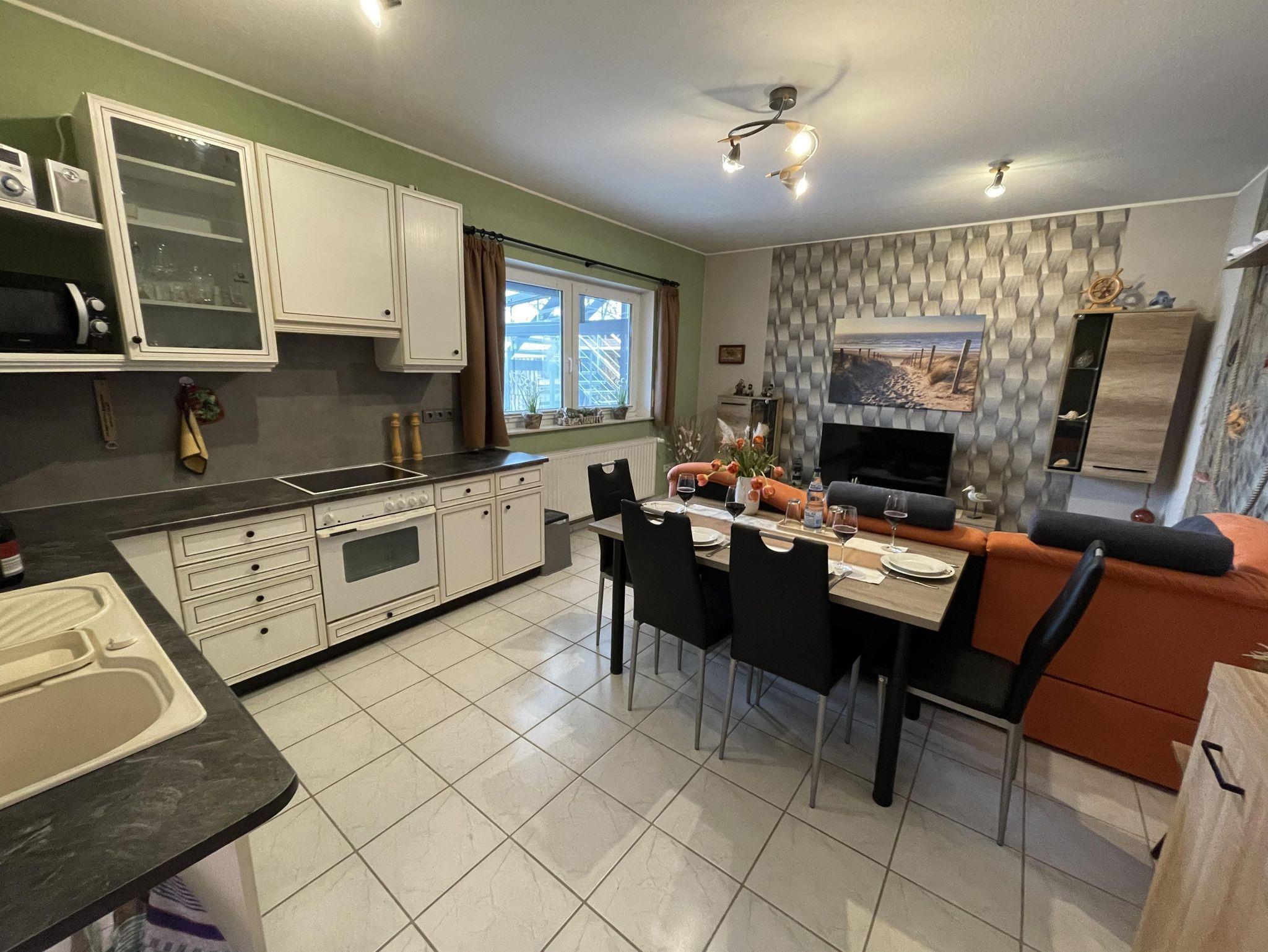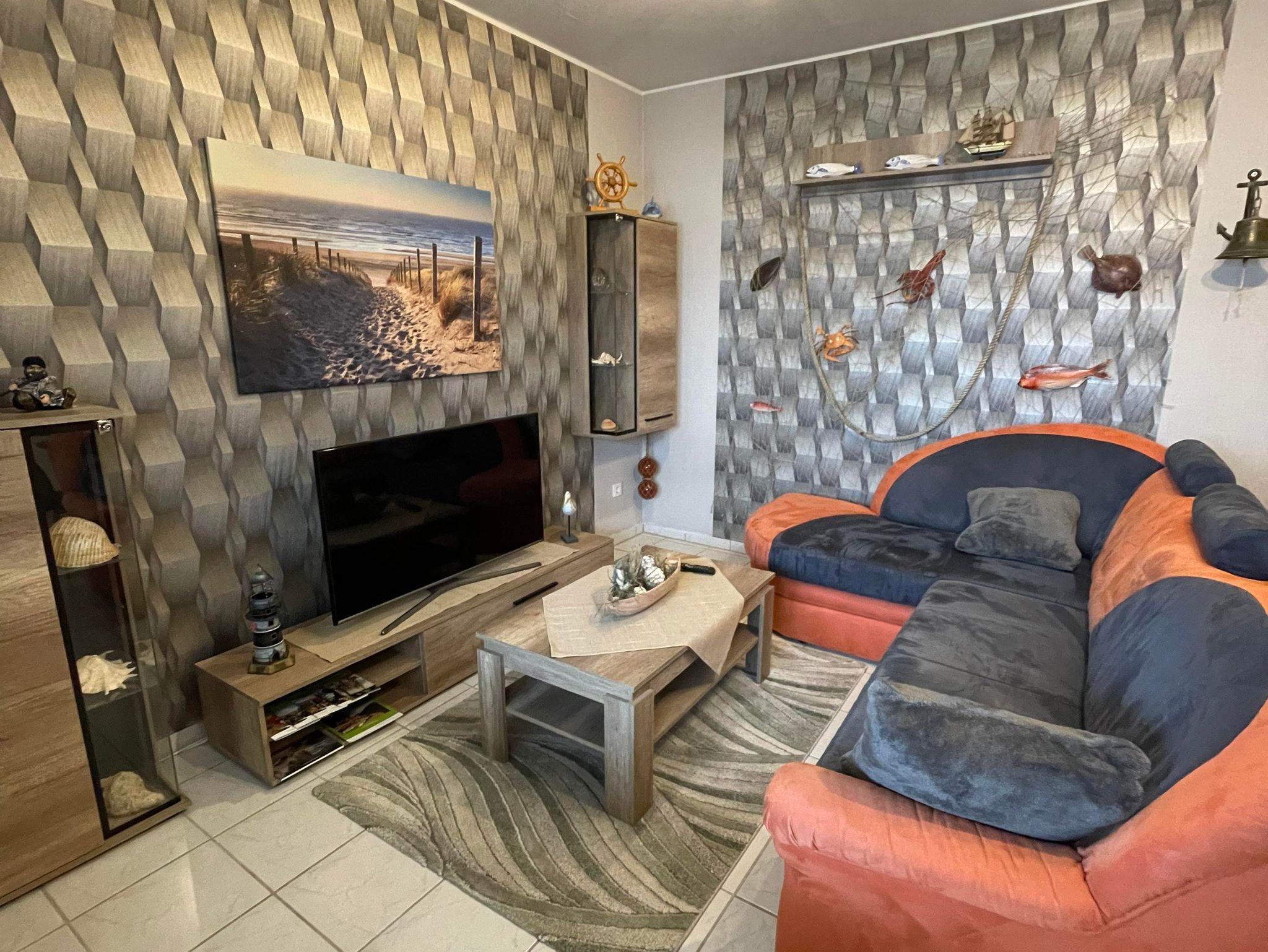 Es erwartet Sie eine maritim eingerichtete Ferienwohnung mit einer voll ausgestatteten Küche im Küchen-, Wohn- und Essbereich. Die Wohnung verfügt über zwei Schlafzimmer jeweils mit Doppelbett. Eine zusätzliche Schlafmöglichkeit bietet die Couch mit Schlaffunktion im Wohnbereich.