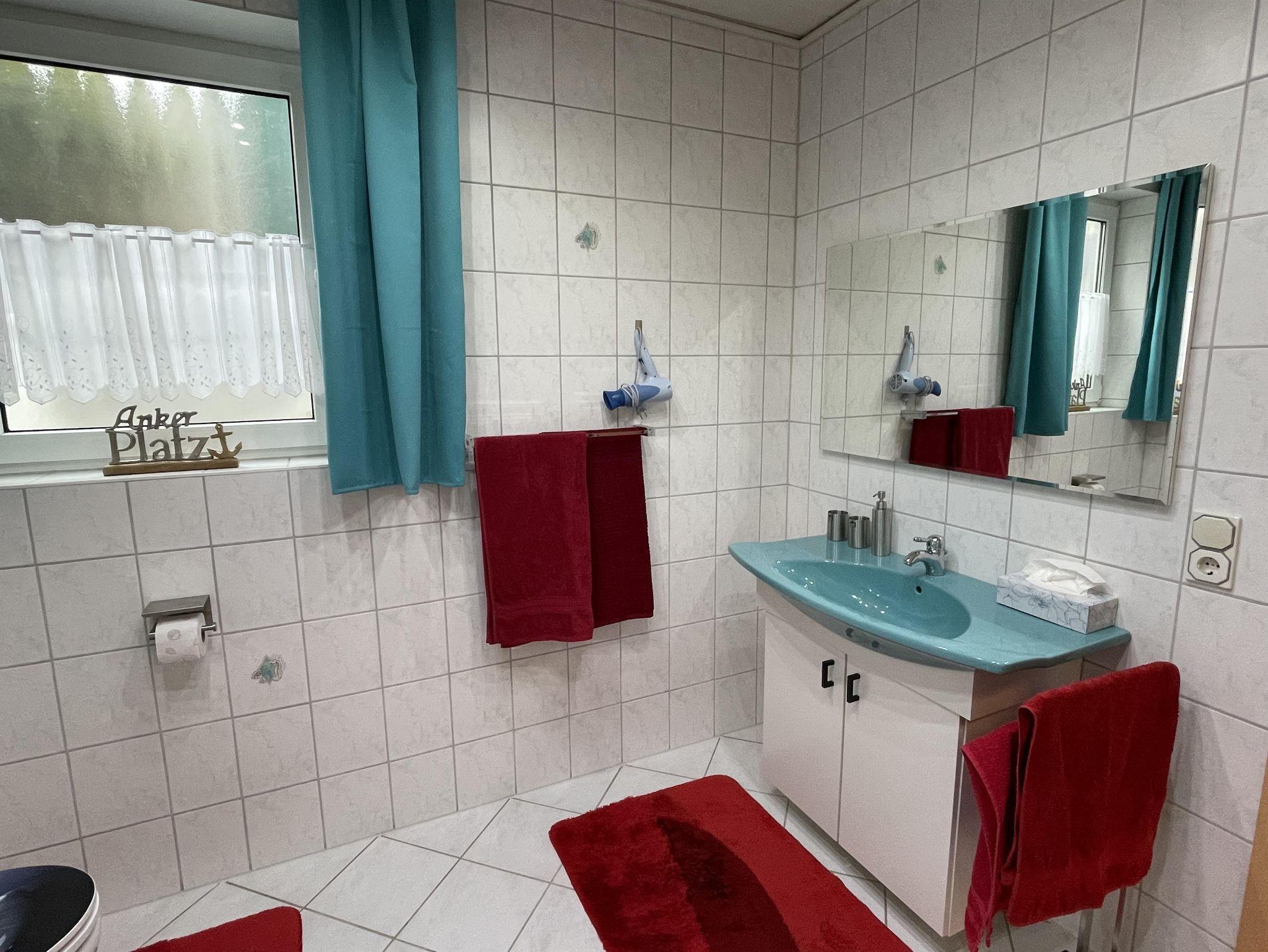 Im Bad befinden sich Dusche,WC,Waschbereich und Fön,ebenso Waschmaschine und Trockner.