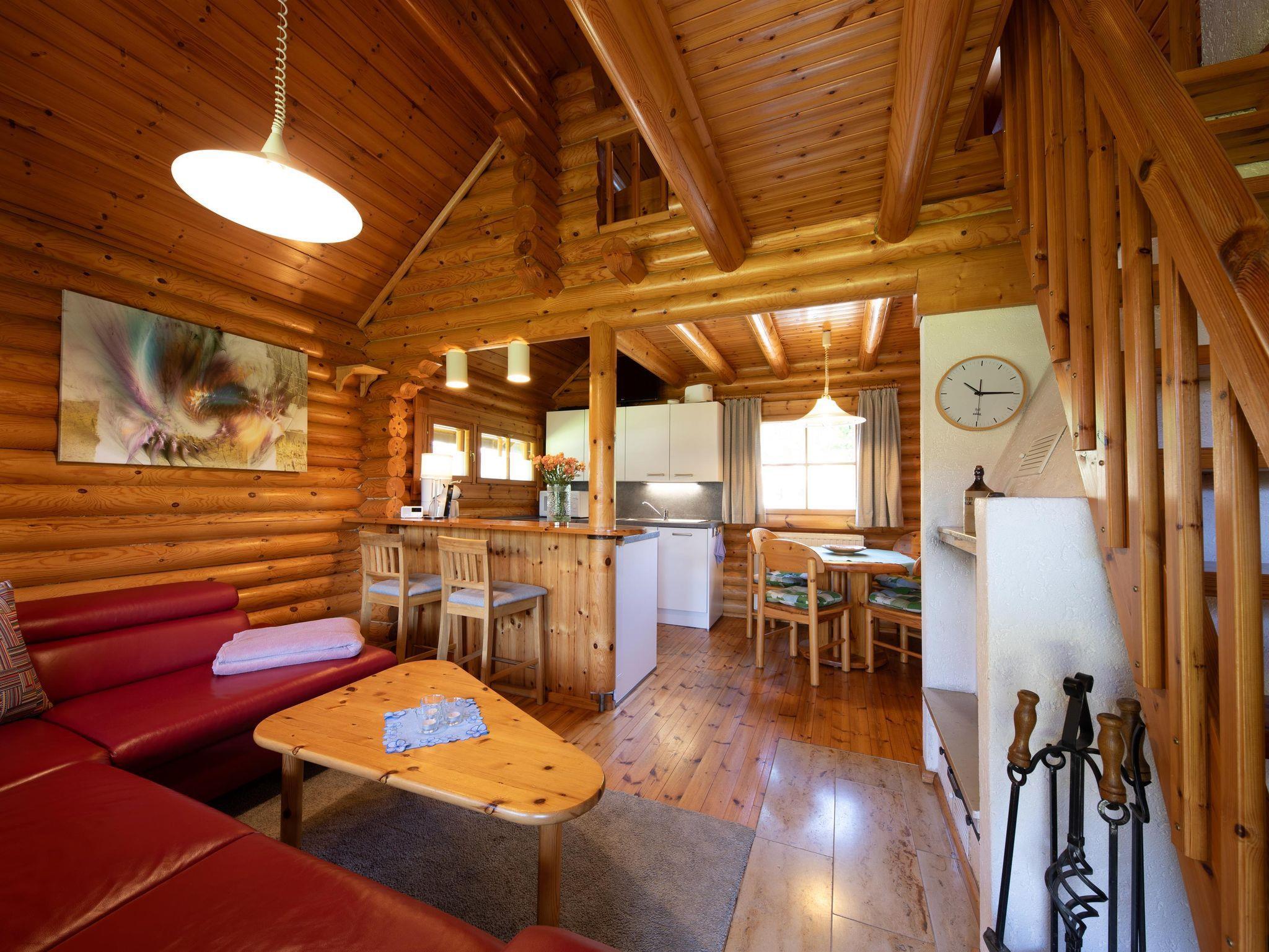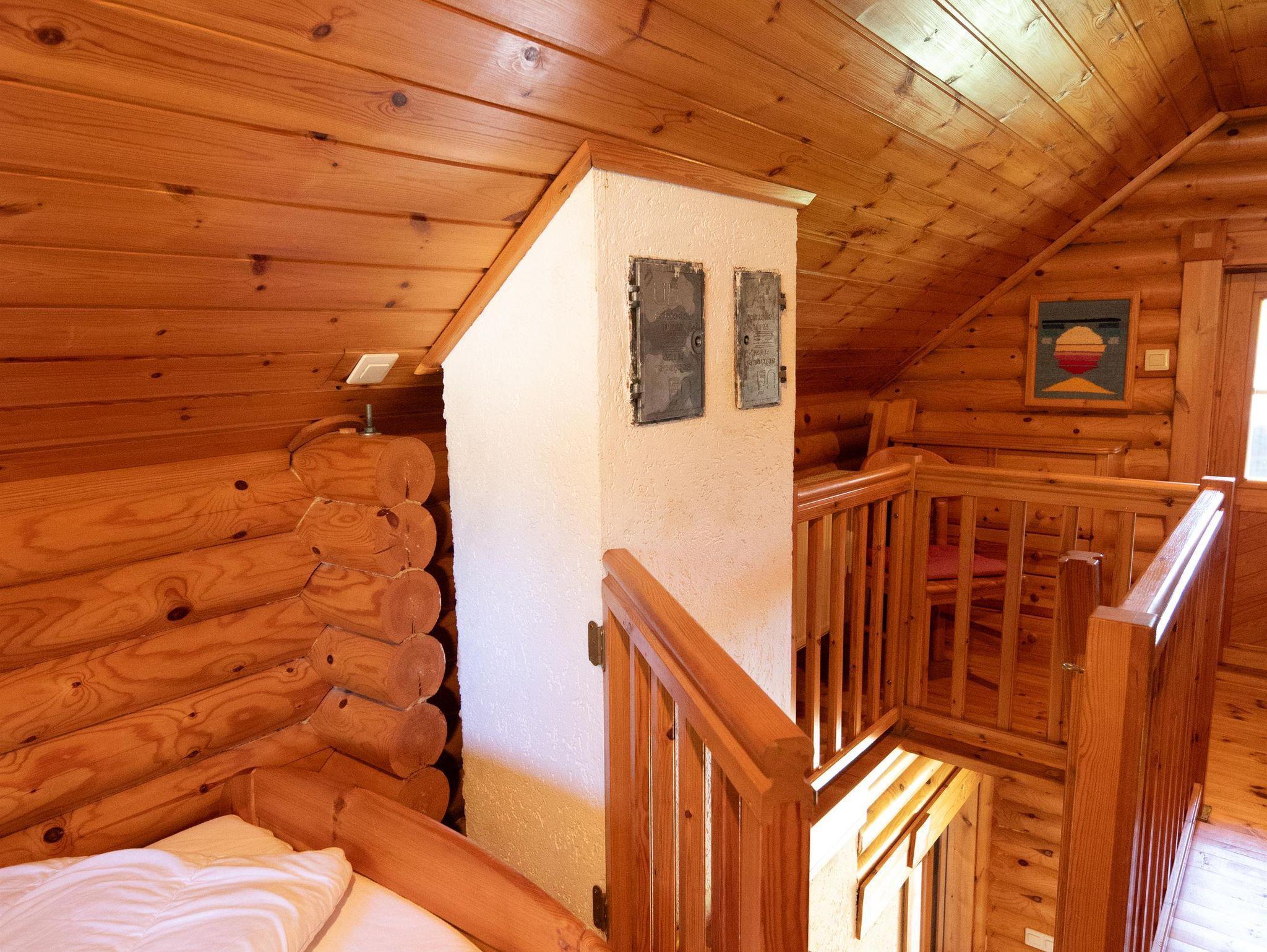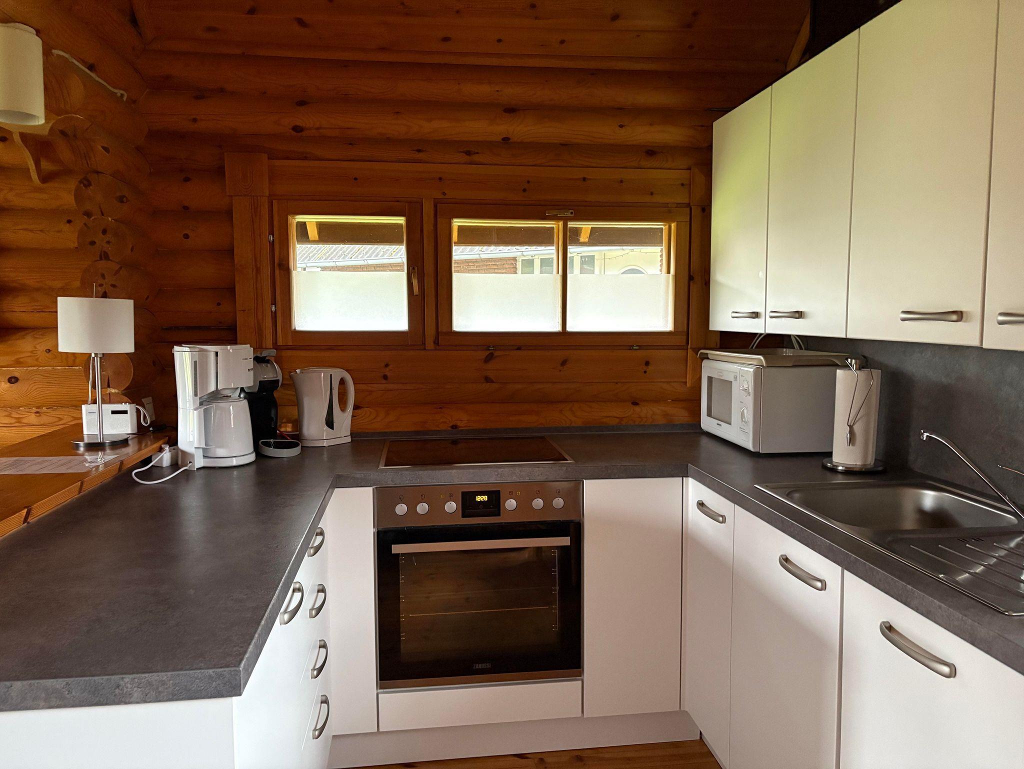Ca. 50 m² auf zwei Etagen. Im Erdgeschoss befindet sich eine Wohnküche mit Rundsitzecke, Kamin und TV. Die Küchenzeile mit Esstresen ist komplett ausgestattet mit Backofen, Mikrowelle, Kühlschrank mit Gefrierfach, Spülmaschine, Toaster, Wasserkocher Kaffee- und Nescafé Dolce Gusto Kaffeekapselmaschine. Im Erdgeschoss gibt es ein kleines Schlafzimmer mit Doppelbett 140 x 200. Eine steile Holztreppe (mit verriegelbarem Schutzgitter oben) führt in das offene Obergeschoss mit zwei Einzelbetten 90 x 200 und Loggia.