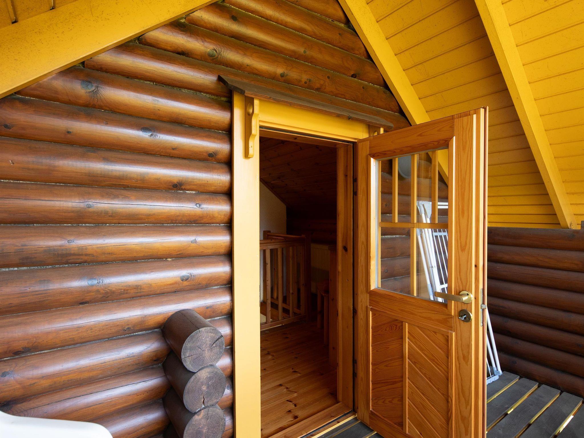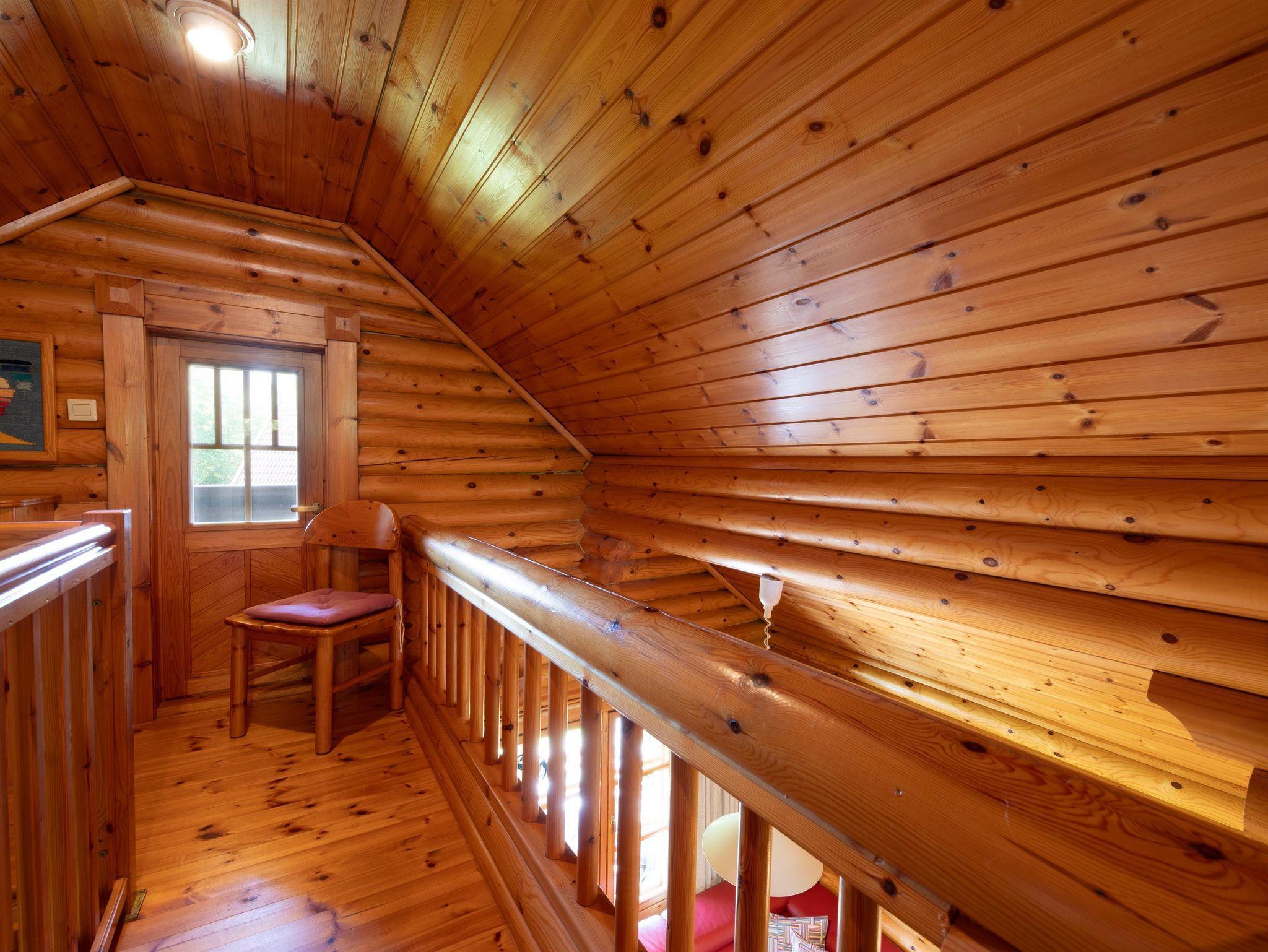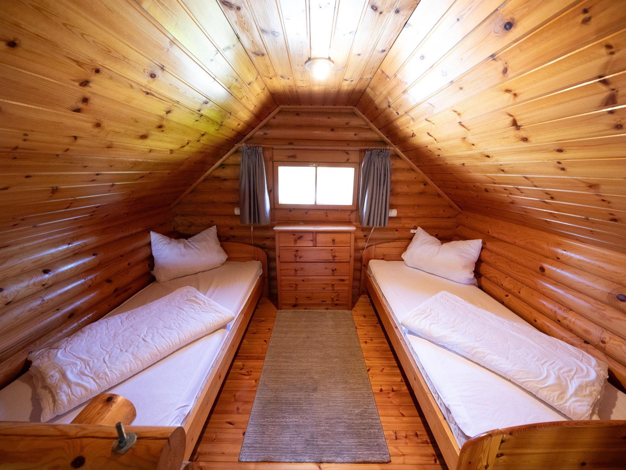 Ca. 50 m² auf zwei Etagen. Im Erdgeschoss befindet sich eine Wohnküche mit Rundsitzecke, Kamin und TV. Die Küchenzeile mit Esstresen ist komplett ausgestattet mit Backofen, Mikrowelle, Kühlschrank mit Gefrierfach, Spülmaschine, Toaster, Wasserkocher Kaffee- und Nescafé Dolce Gusto Kaffeekapselmaschine. Im Erdgeschoss gibt es ein kleines Schlafzimmer mit Doppelbett 140 x 200. Eine steile Holztreppe (mit verriegelbarem Schutzgitter oben) führt in das offene Obergeschoss mit zwei Einzelbetten 90 x 200 und Loggia.