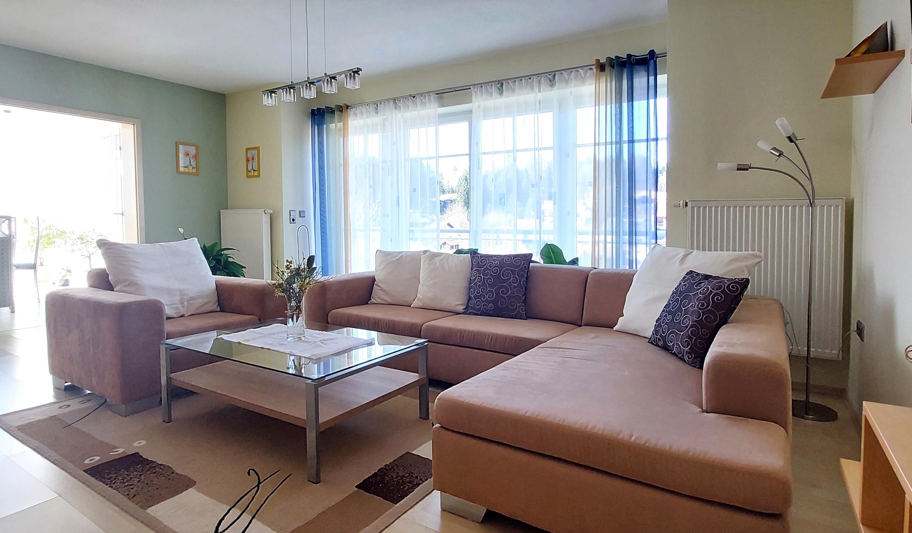 - Wohnzimmer: Bequemes Ecksofa, das als Schlafplatz für die dritte Person genutzt werden kann, Zugang zum großen Balkon.