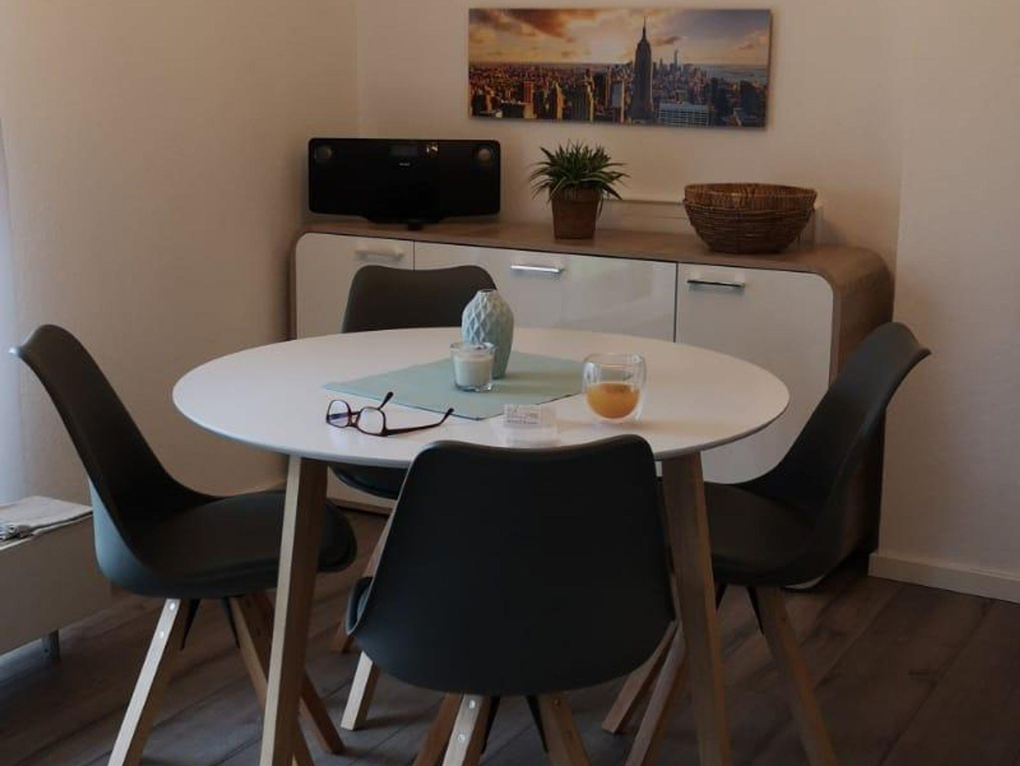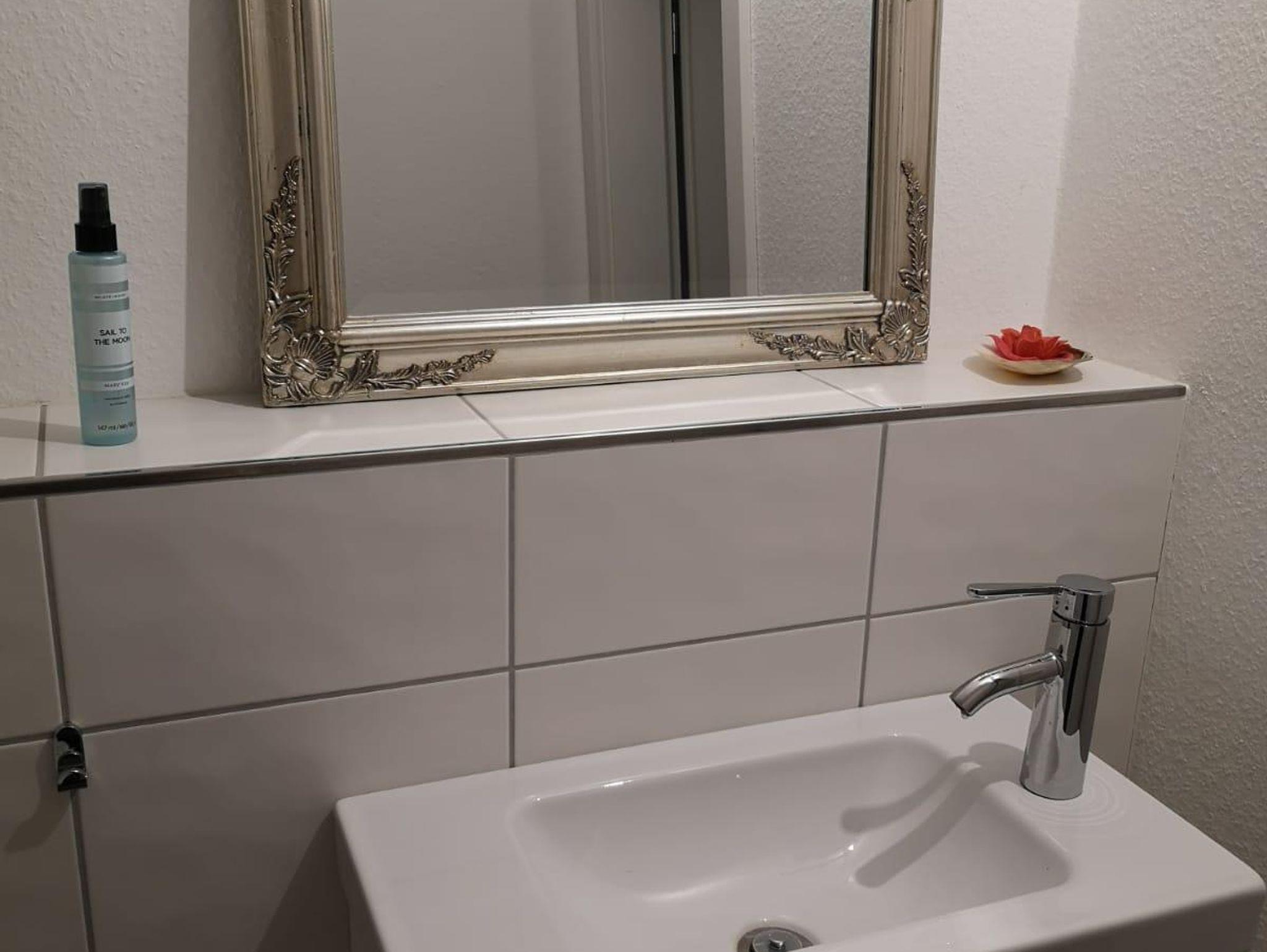 Ferienwohnung mit Küche, Wohn-, Essbereich mit einer Schlafcouch (1,6 x 2m), Gäste WC, Badezimmer mit Dusche und Badewanne, Schlafzimmer mit einem 200x220 großen Wasserbett. An den Wohnbereich gliedert sich ein 9 qm großer Balkon an. Die Wohnung ist klimatisiert.