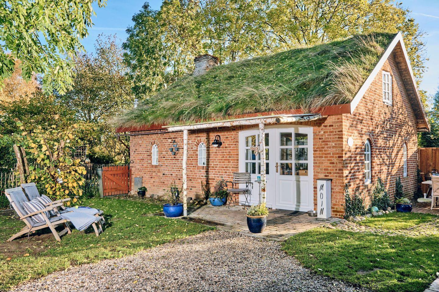 Das Haupthaus des Anwesens, ein typisch nordfriesisches Reetdachhaus, steht ca. 25 m von dem grasgedeckten Ferienhaus entfernt.