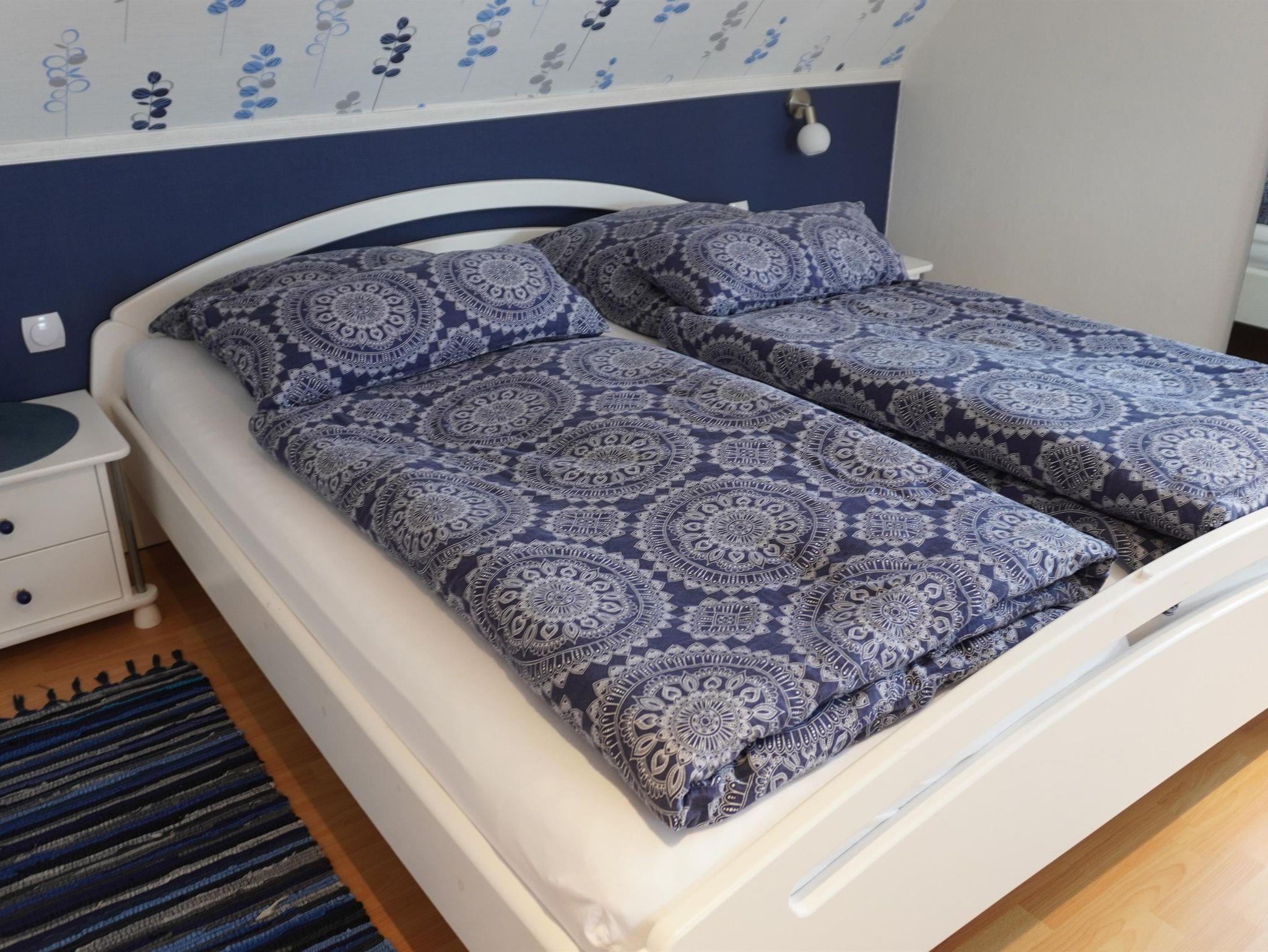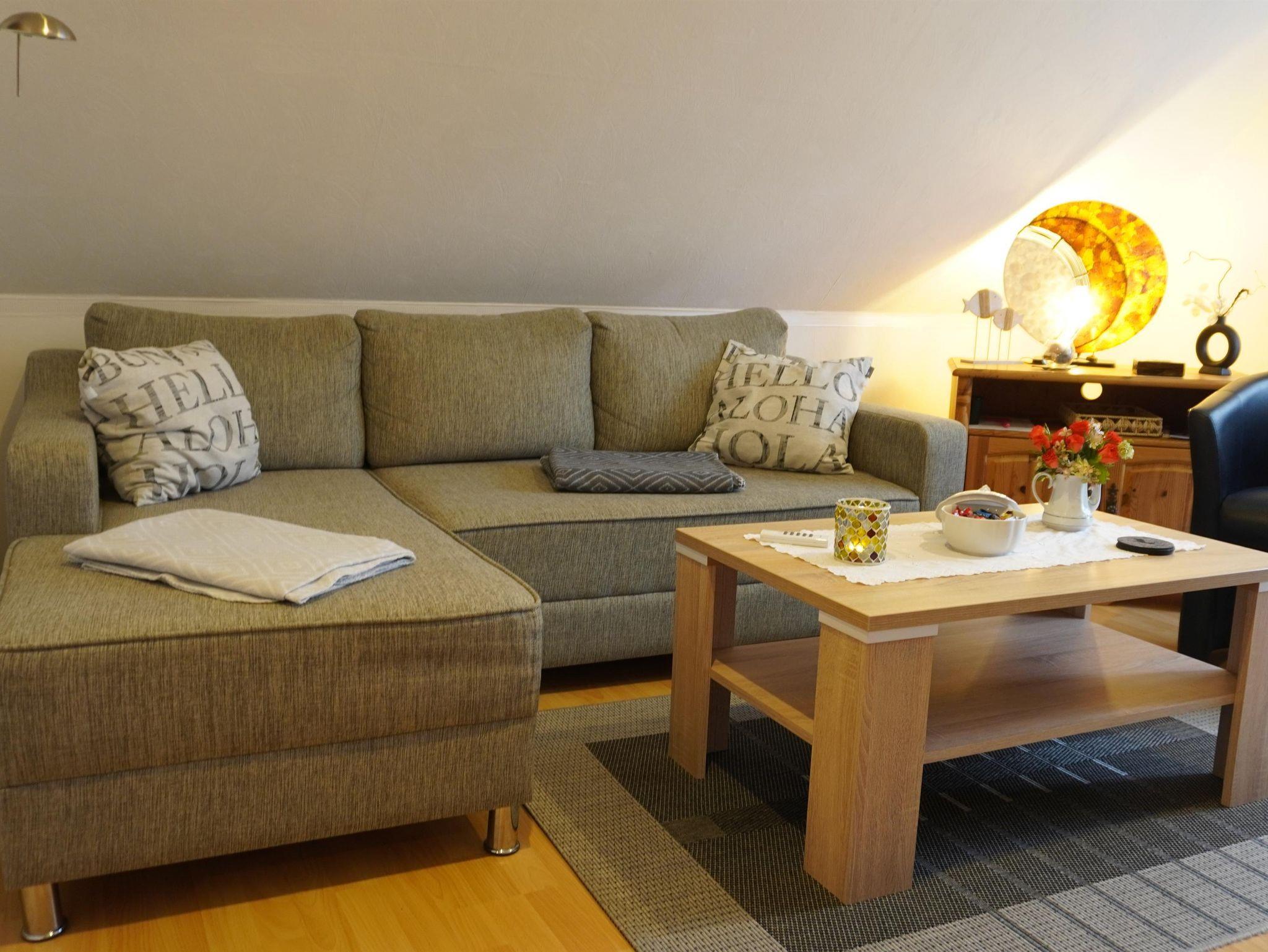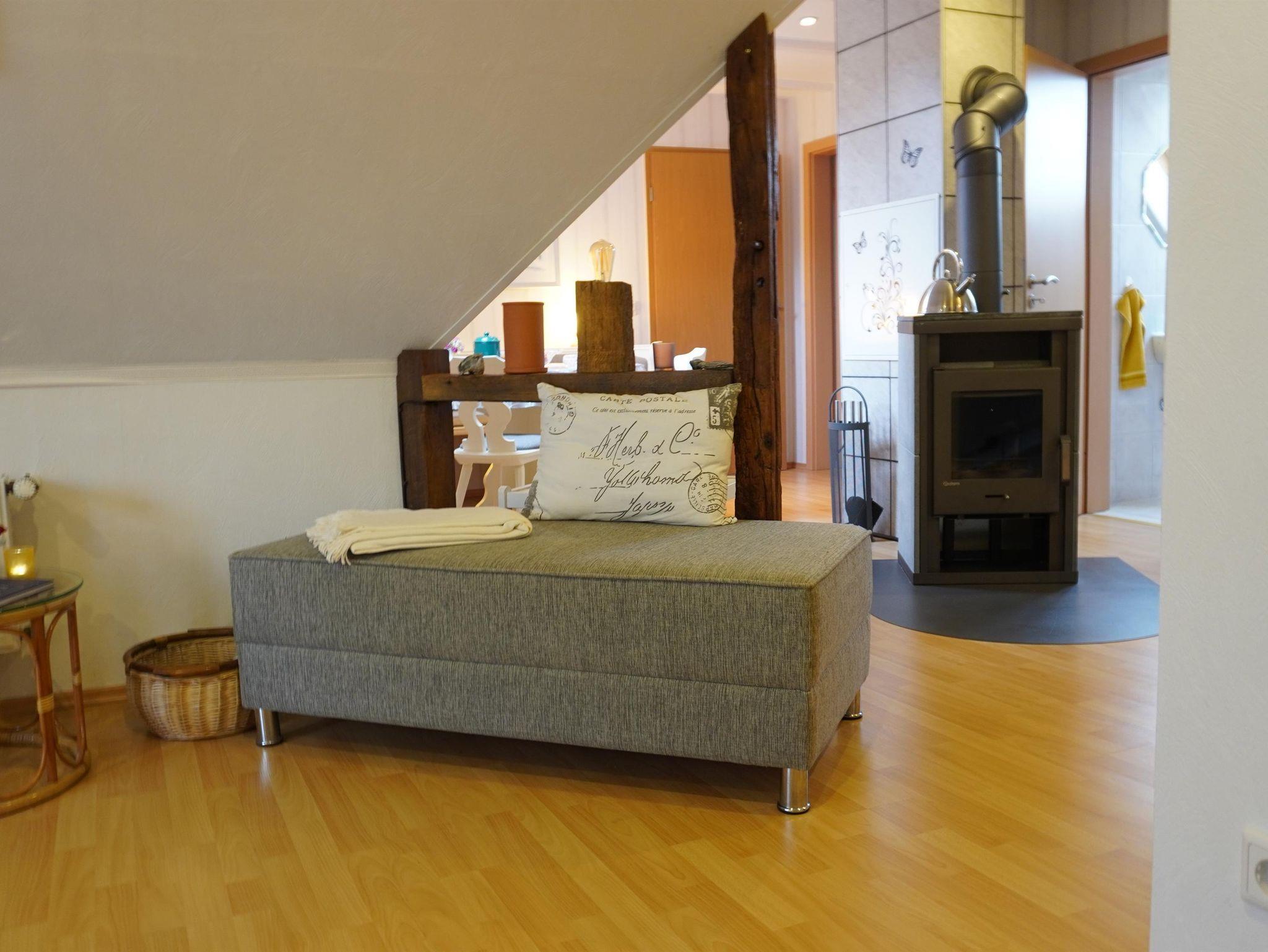 Treten Sie ein in unsere, mit viel Liebe zum Detail, eingerichteten Ferienwohnung. Auf 70m² erwarten Sie ein gemütlicher Wohn-Essbereich mit integrierter Küchenzeile, die keine Wünsche offenlässt. Als Schlafdomizile werden Sie ein Zimmer mit Doppelbett (1,80 x 2,00m) sowie ein weiteres mit zwei Einzelbetten (1,00 x 2,00 m) vorfinden. Die Betten sind bereits bei Anreise bezogen und auch Ihre Handtücher dürfen Sie zuhause lassen. Das Badezimmer ist mit Dusche/WC und einer Badewanne ausgestattet und zusätzlich ist noch ein Gäste-WC vorhanden. Unsere kleinen Gäste dürfen sich über ein Reisebett sowie einen Kinderhochstuhl freuen. Außerdem bieten wir Ihnen verschiedene Spiele sowie für Leseratten Bücher an. An kälteren Tagen besteht die Möglichkeit einen Kaminofen zu nutzen. Das Holz hierfür stellen wir gerne bereit. Die Mitnutzung der Waschmaschinen um dem Trockner runden das Angebot der Ferienwohnung ab.