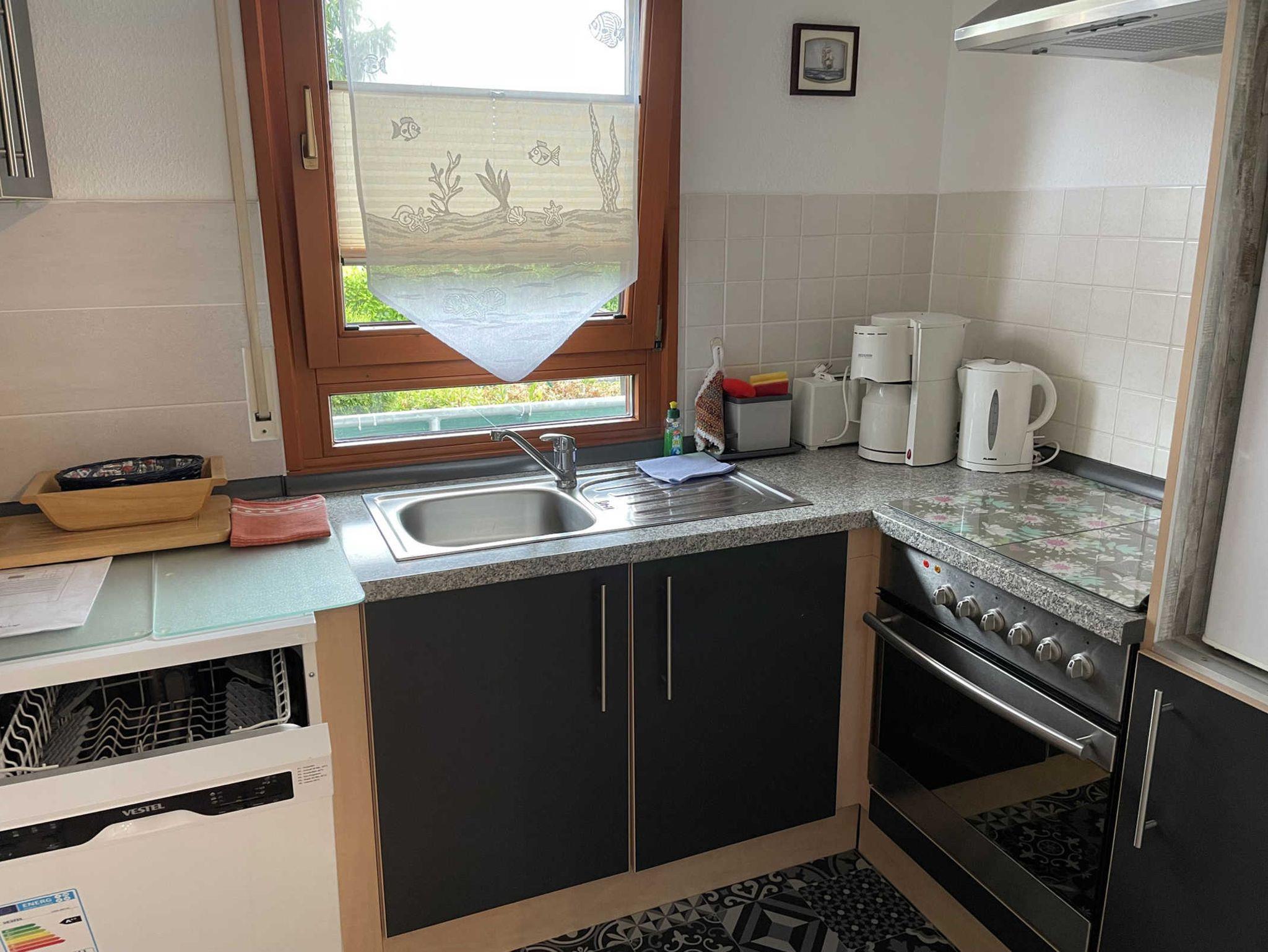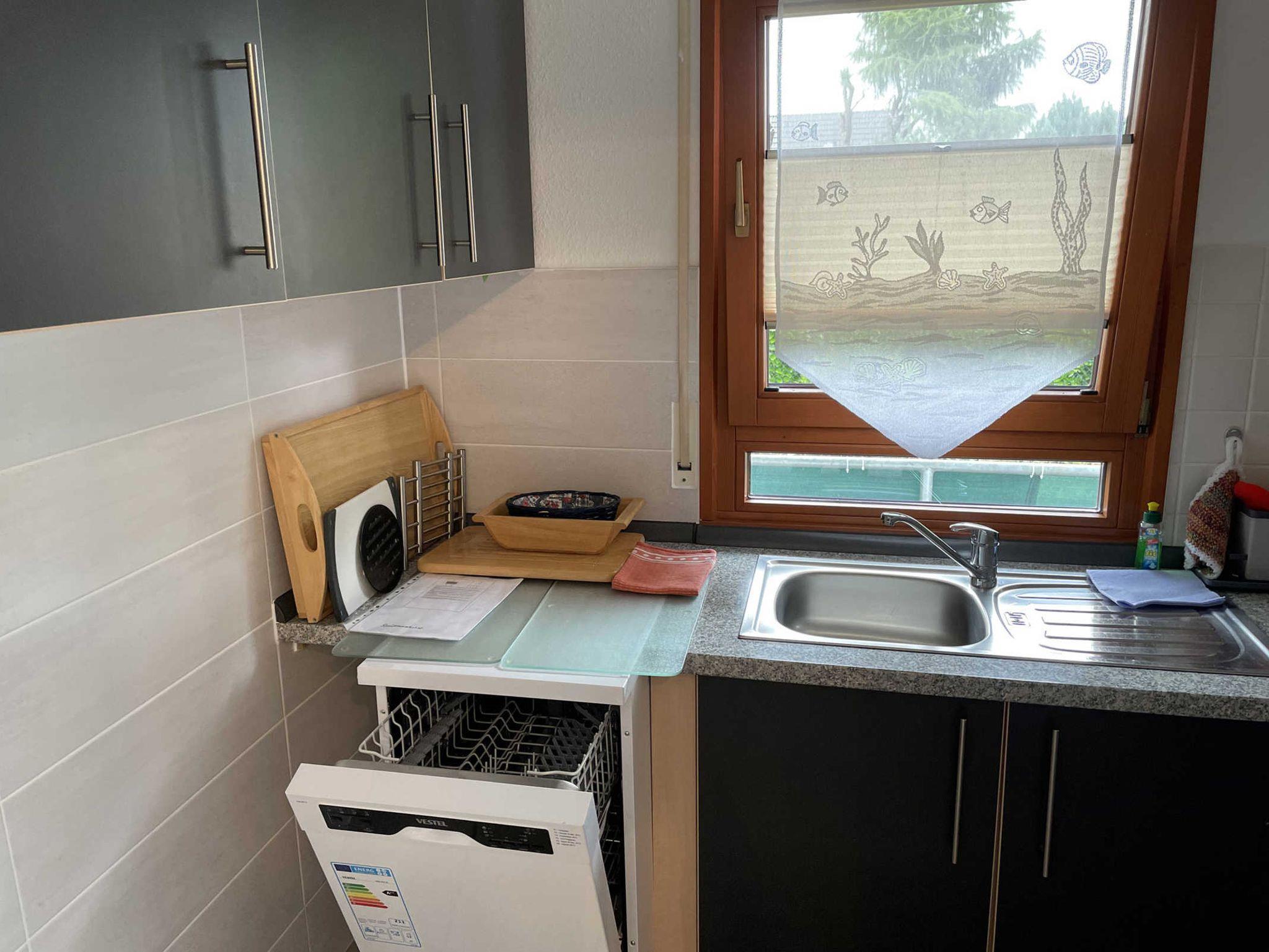 In der Erdgeschosswohnung gibt es ein Schlafzimmer mit einem Doppelbett, ein Wohnzimmer mit Schlafcouch und eine seperate Küche mit Geschirrspüler.