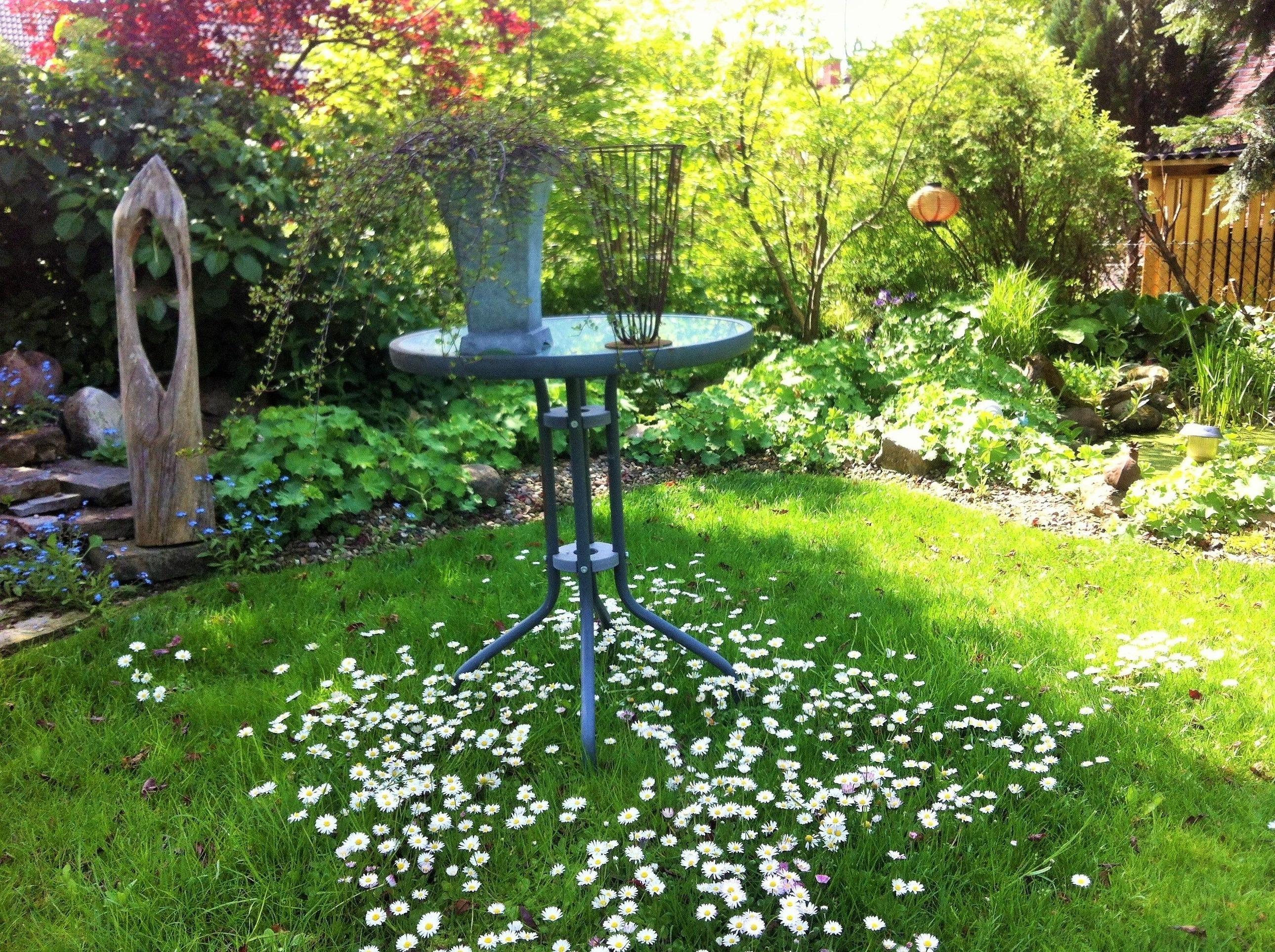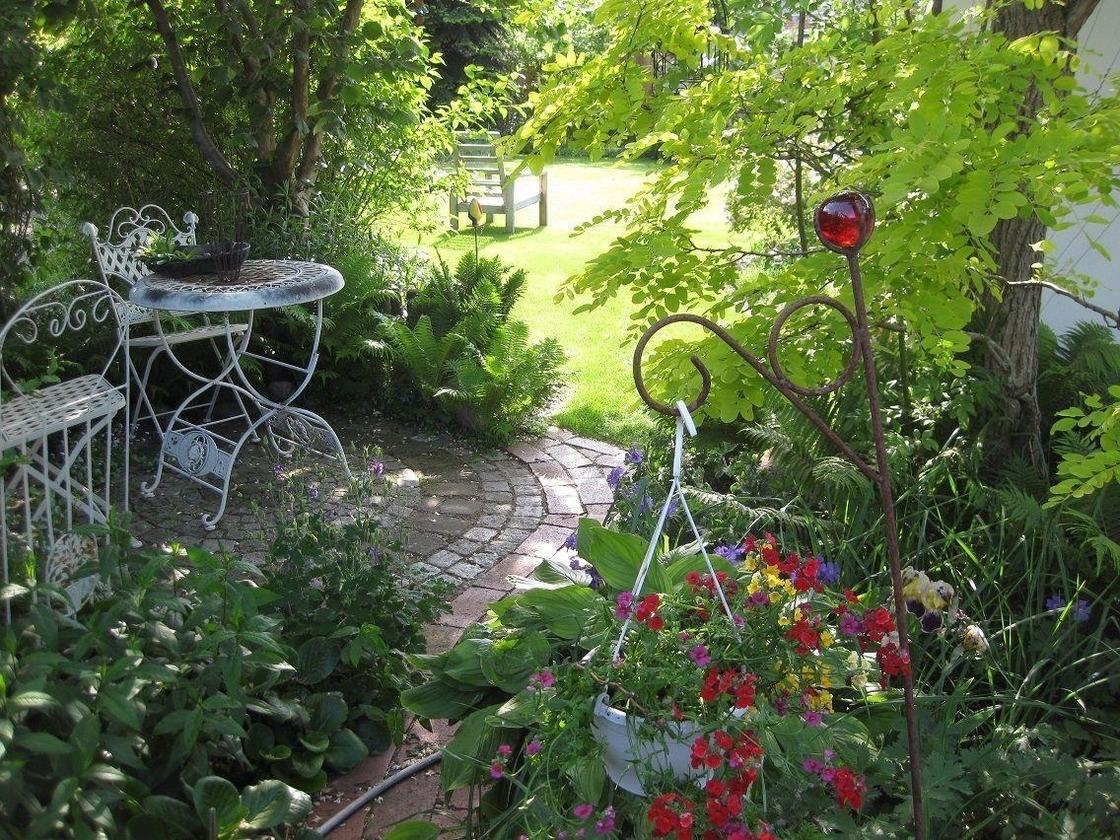 Das Ferienhaus verfügt über eine eigene Terrasse mit Blick in den gepflegten Garten mit einem kleinen Wasserlauf.