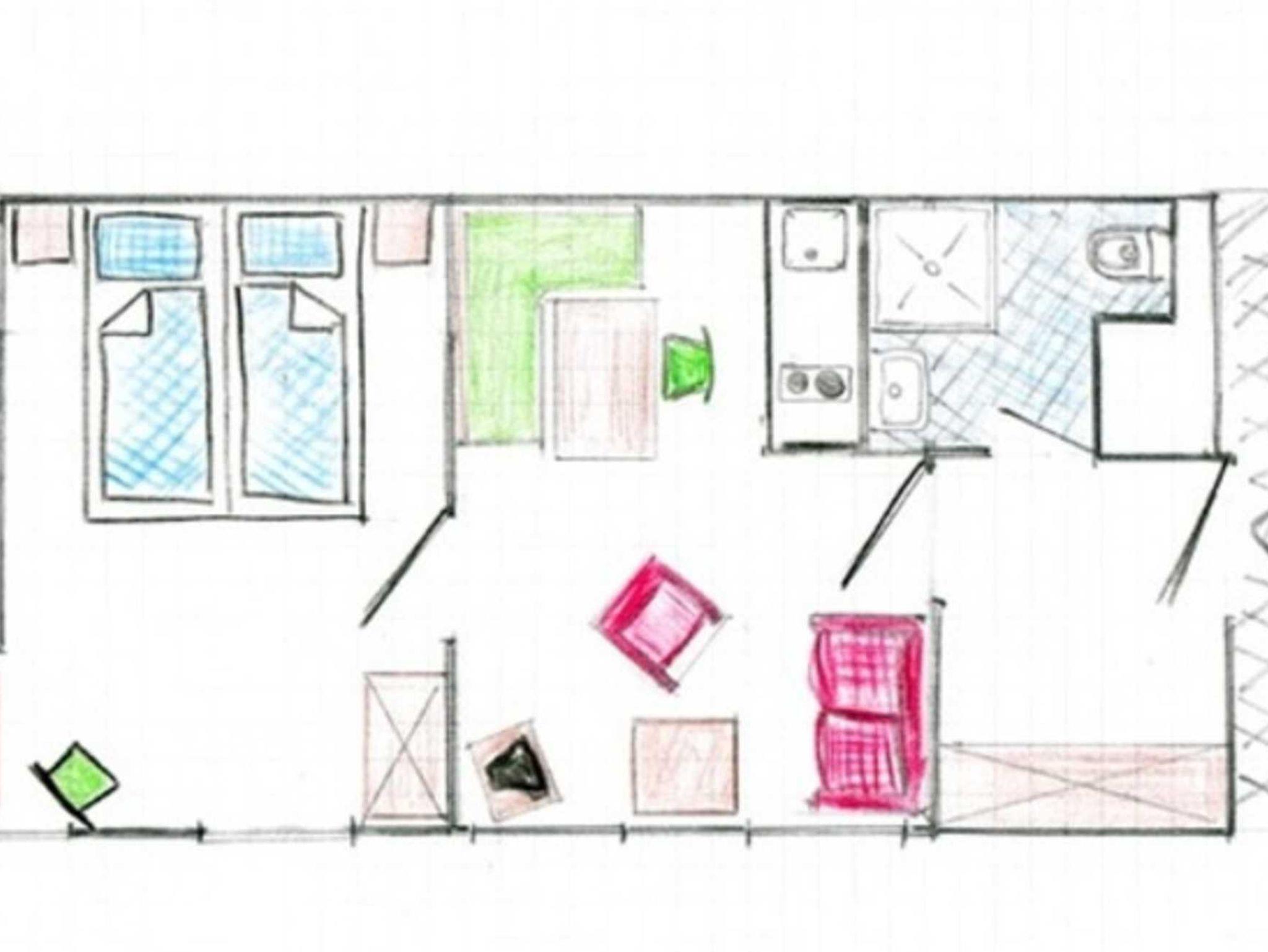 Die Küchezeile ist im Wohnbereich integriert und ist mit dem Geschirrspüler komplett ausgestattet. Im Bad finden Sie Dusche, Waschbecken und WC vor.