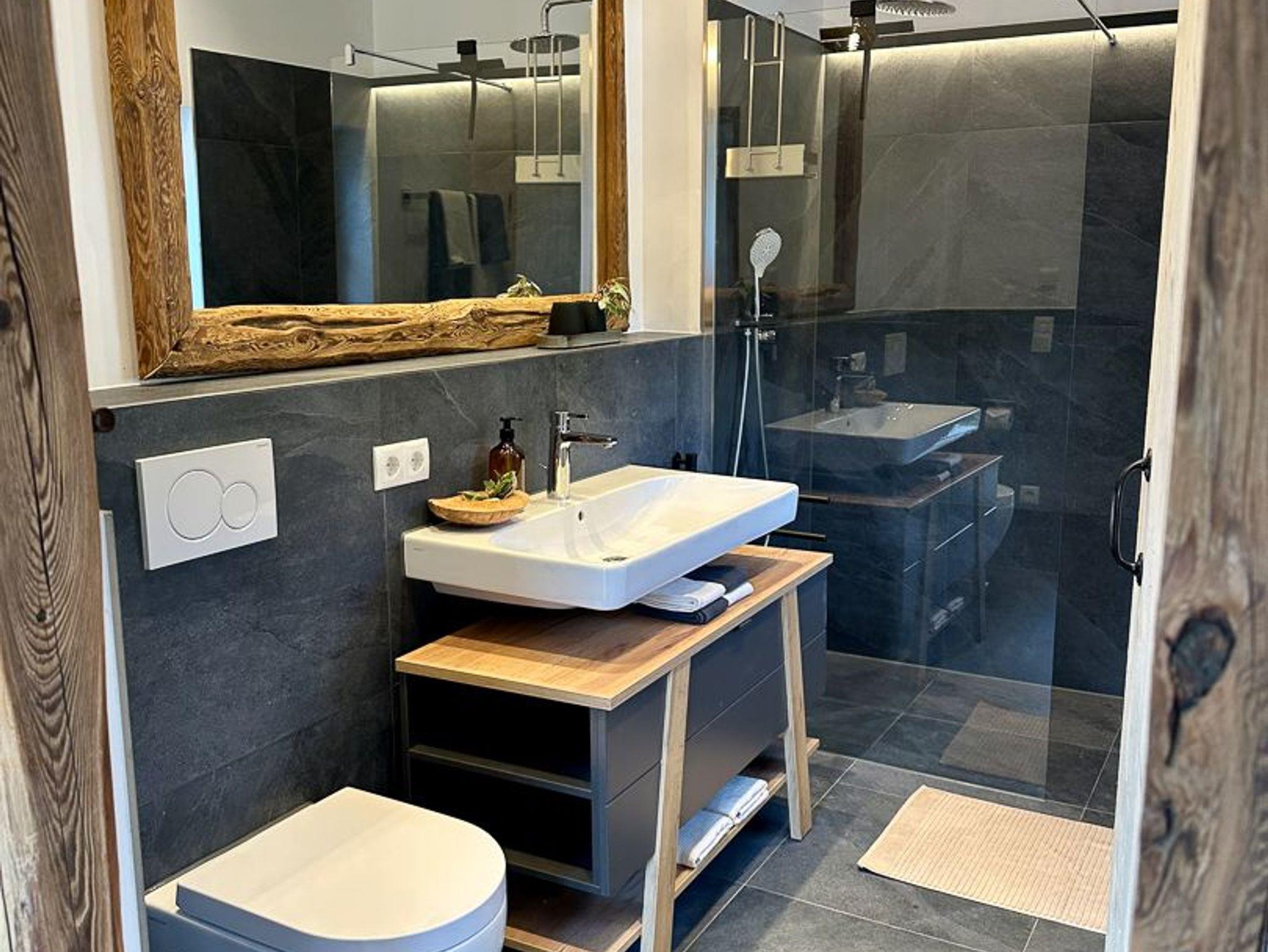 Großzügiges Bad mit WC, Waschbecken, offener Dusche