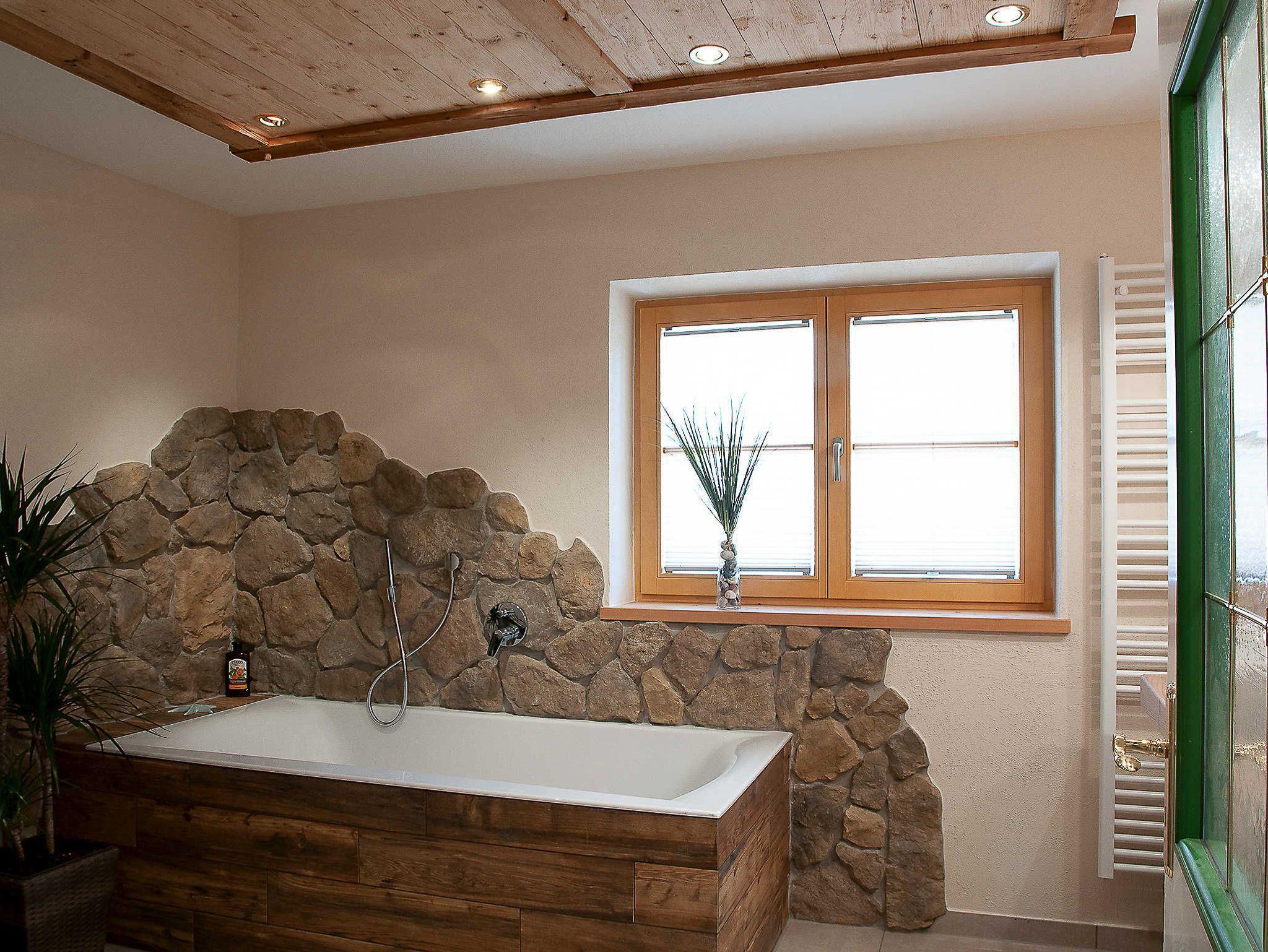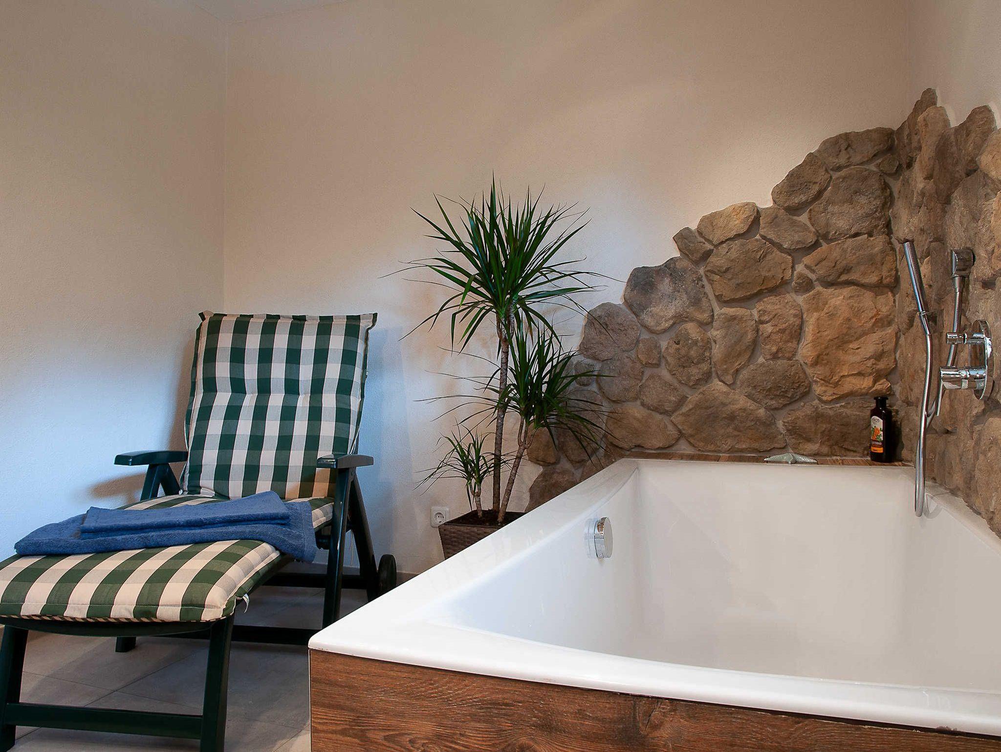 · Badezimmer (Wellness) mit Badewanne, Entspannungsliege, Musikanlage, farbigem Deckenlicht, Doppelwaschtisch, Fliesenboden mit Fußbodenheizung.